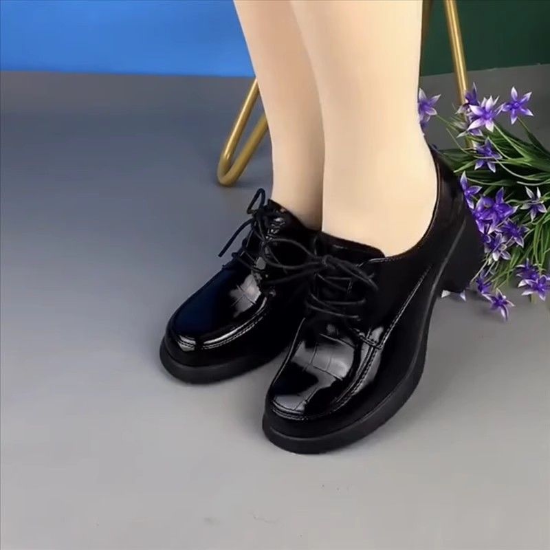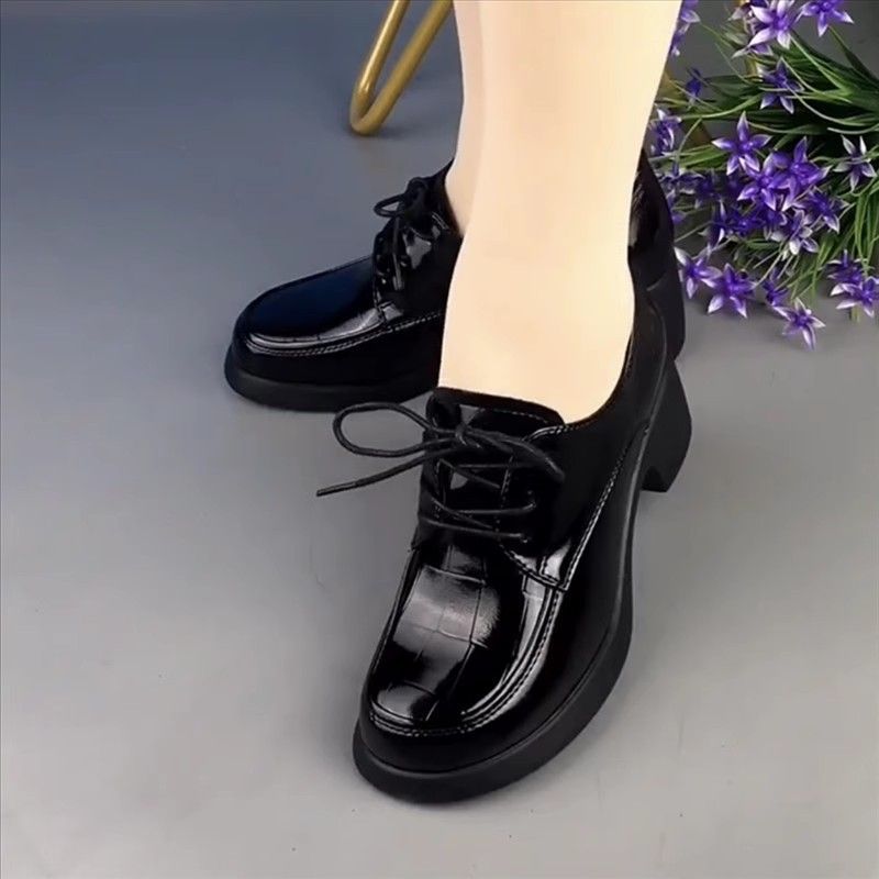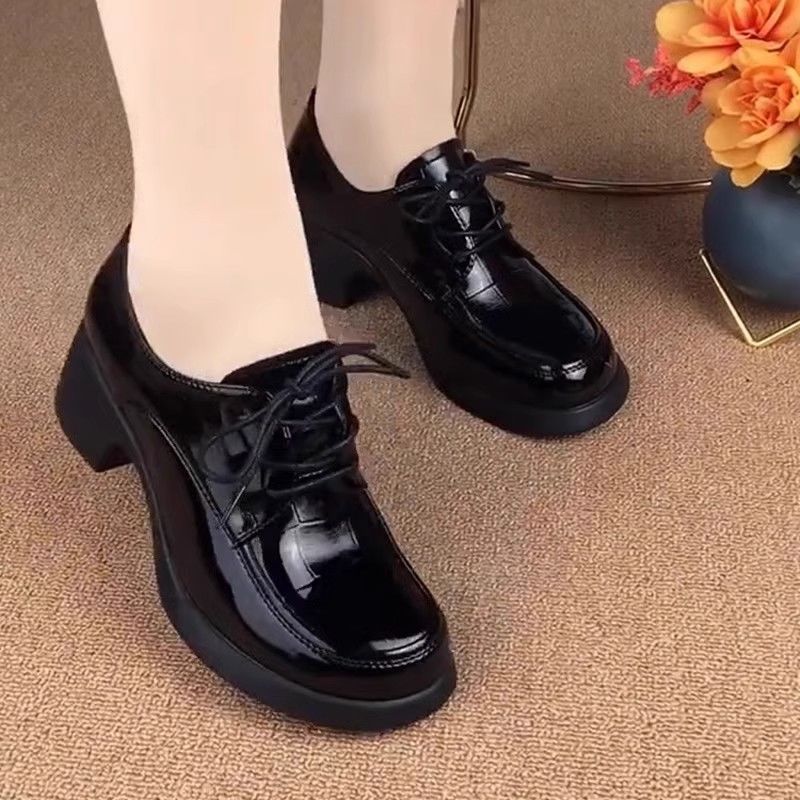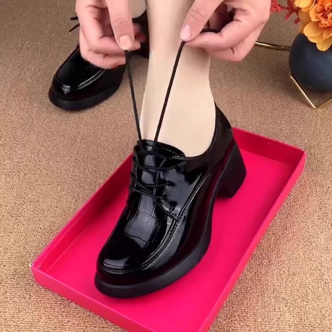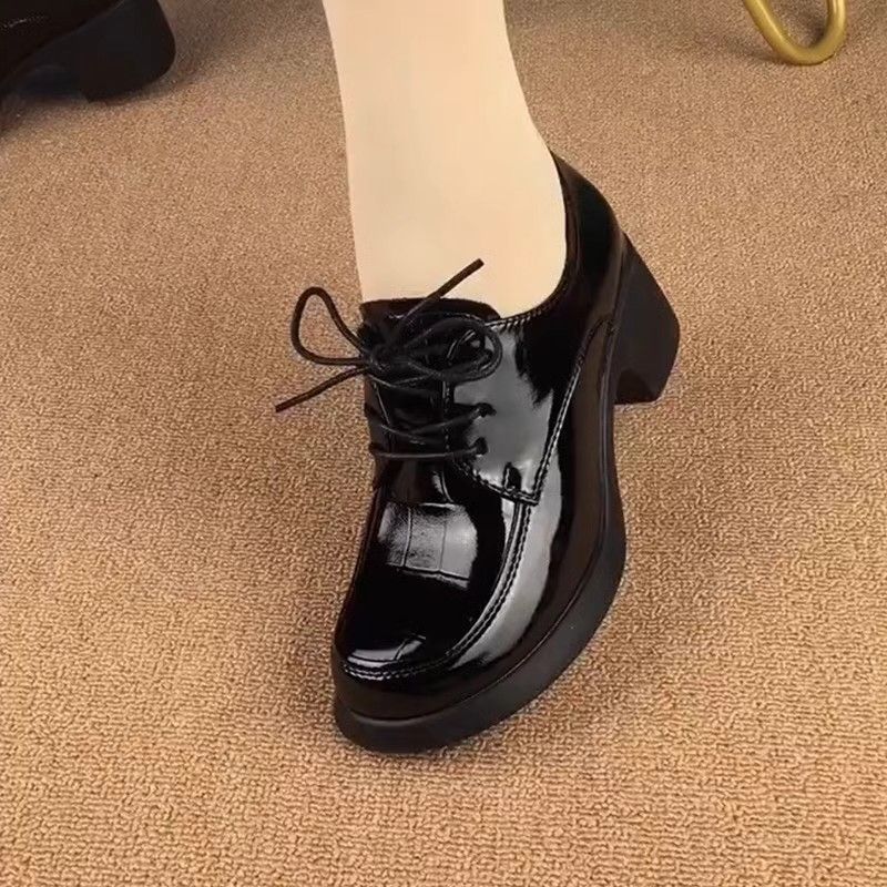 블랙 광택 가죽 두꺼운 굽 레이스 업 작업 신발 부드러운 밑창 작은 가죽 신발 통근 로퍼 2025 여름 여성 신작 신발스토어 가기