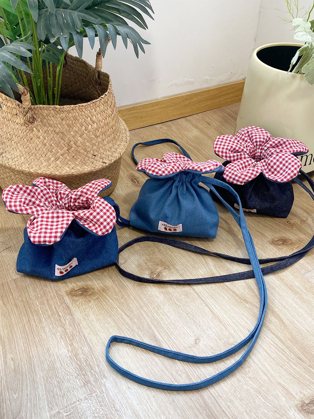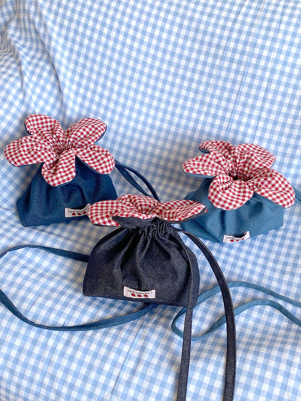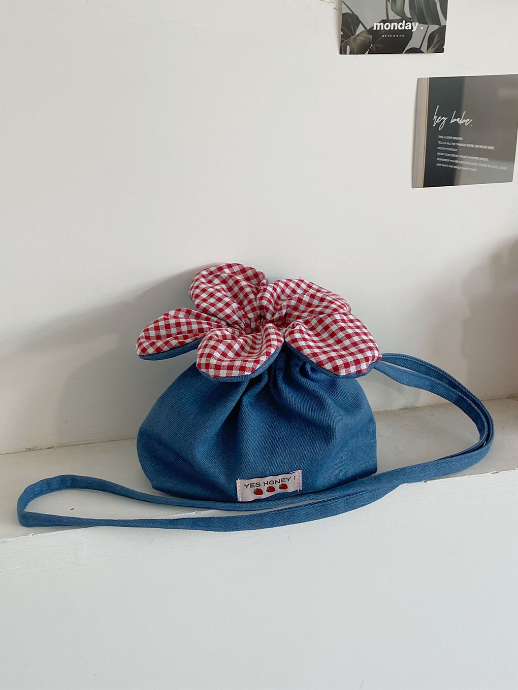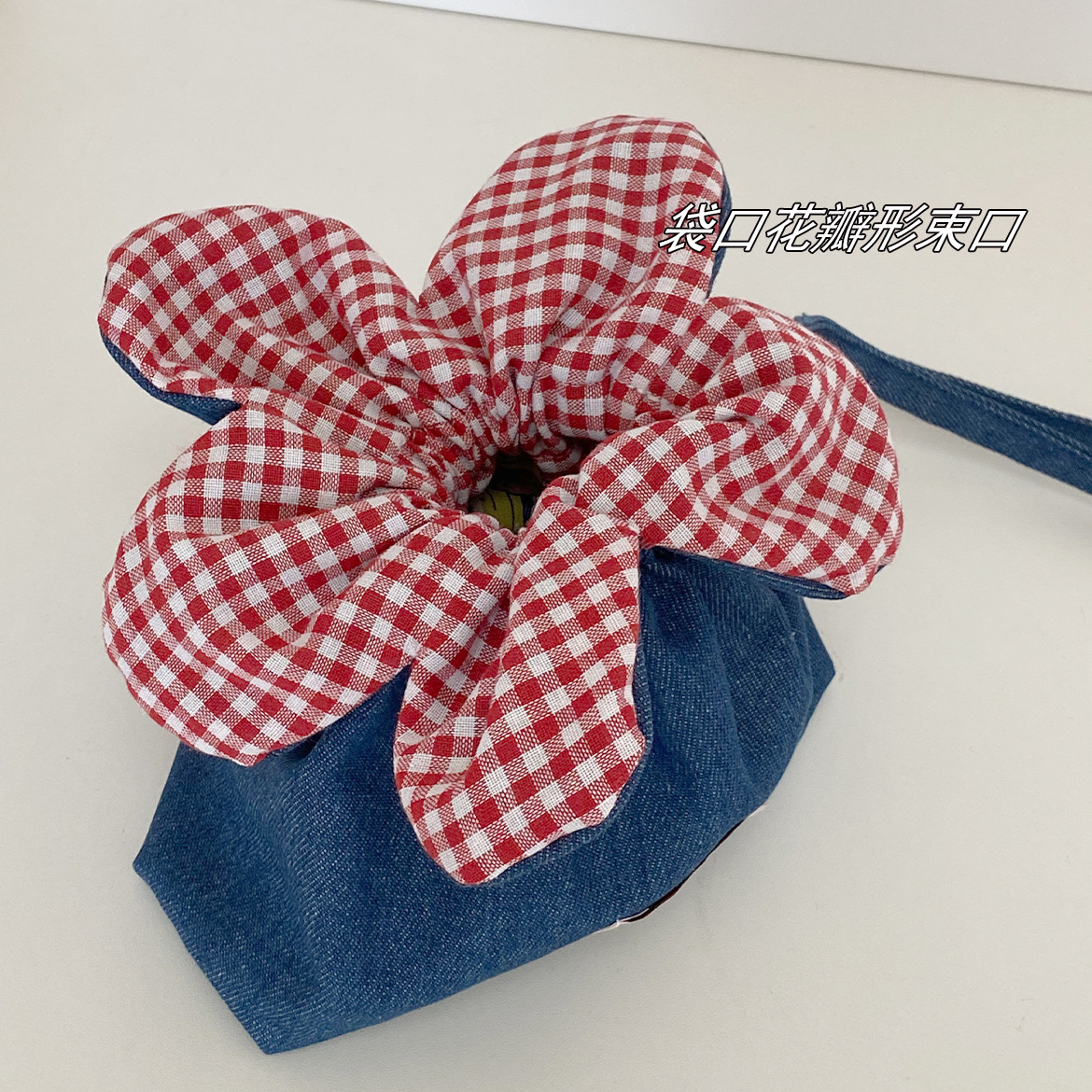 • 크로스바디 드로스트링 플라워 백 - 다크 블루 데님