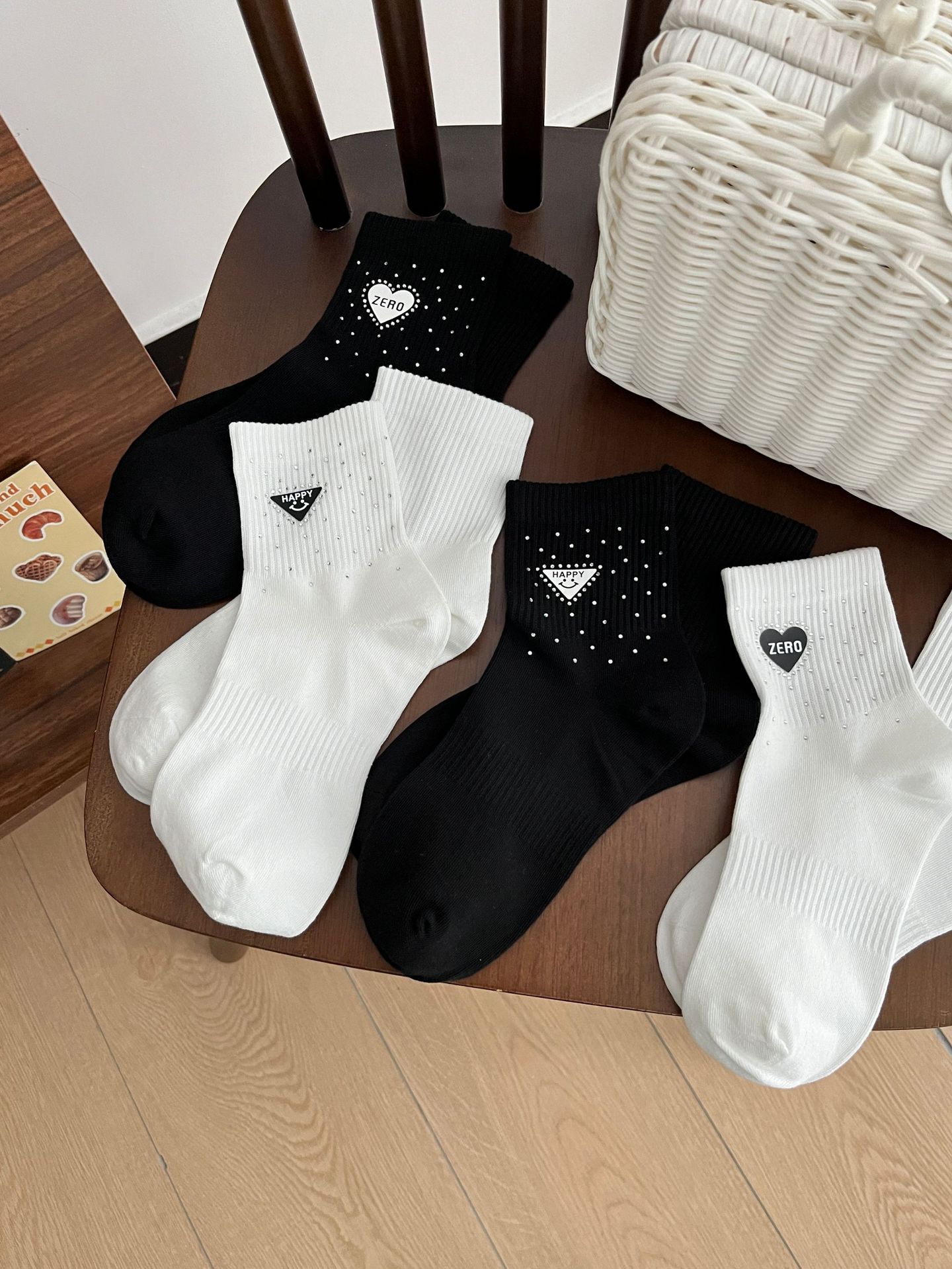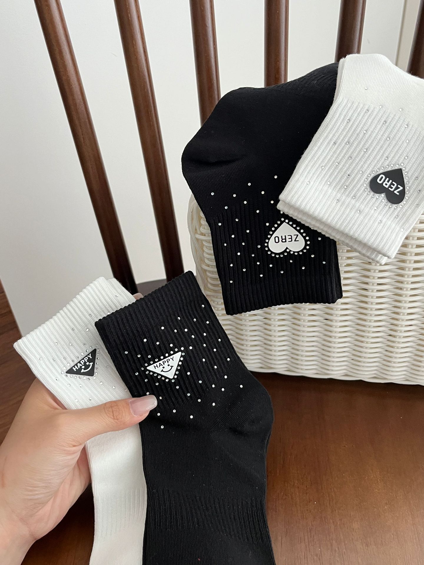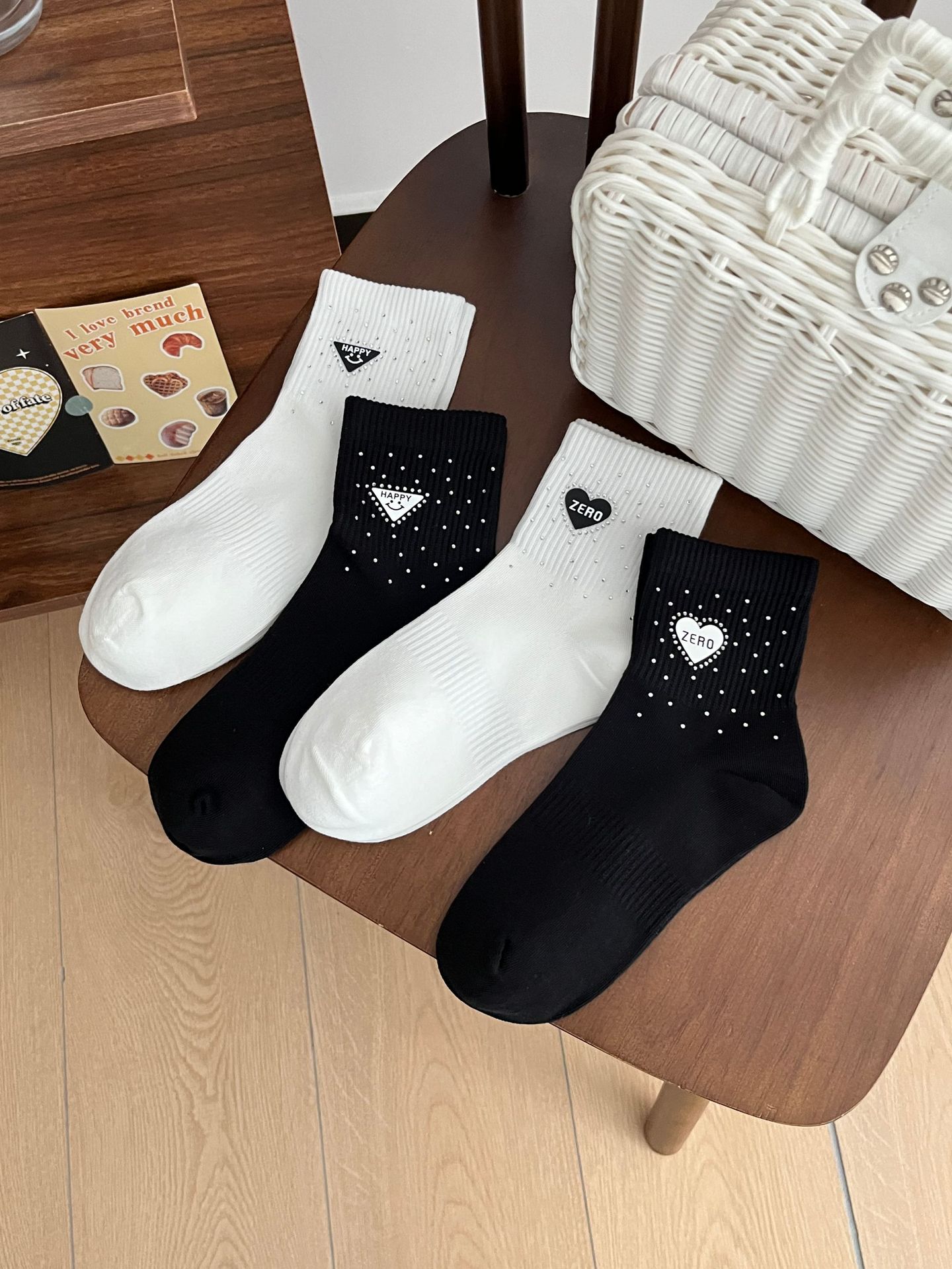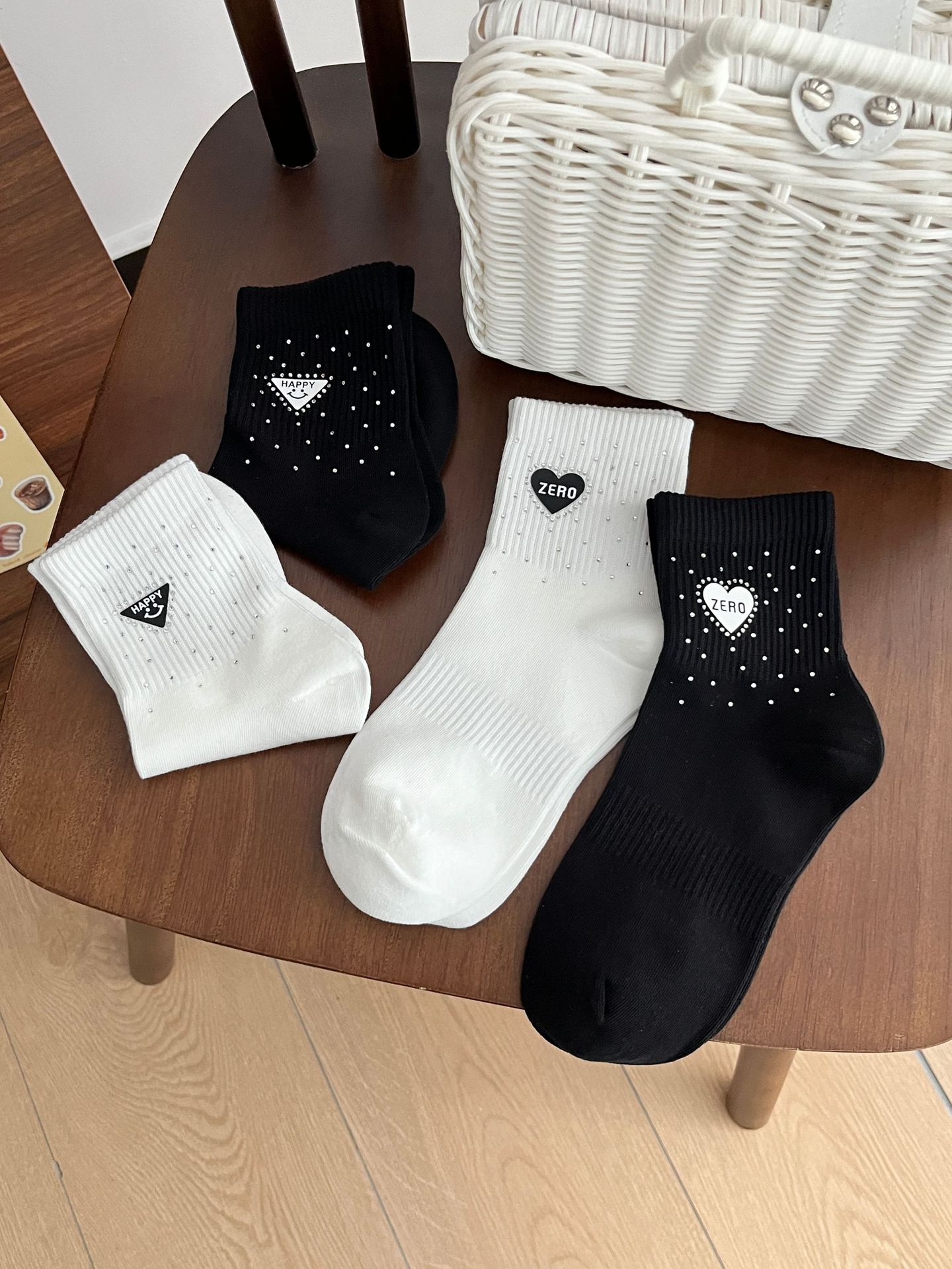 여성용 양말 2025 봄/여름 반짝이는 다이아몬드 장식 양말 인스타 트렌드 다용도 블랙/화이트 면 소재 숲풍 중목 양말 인스타 스타일