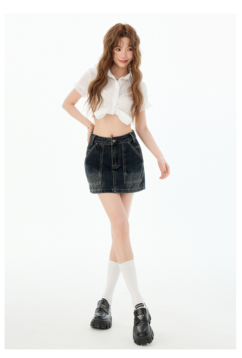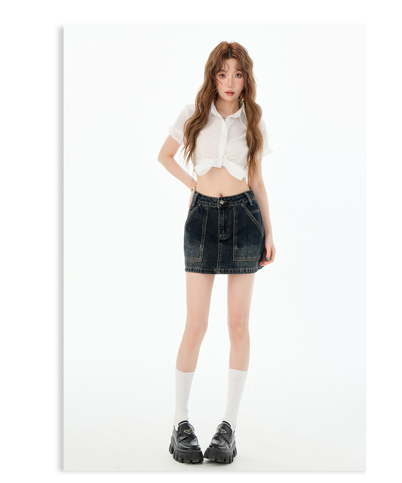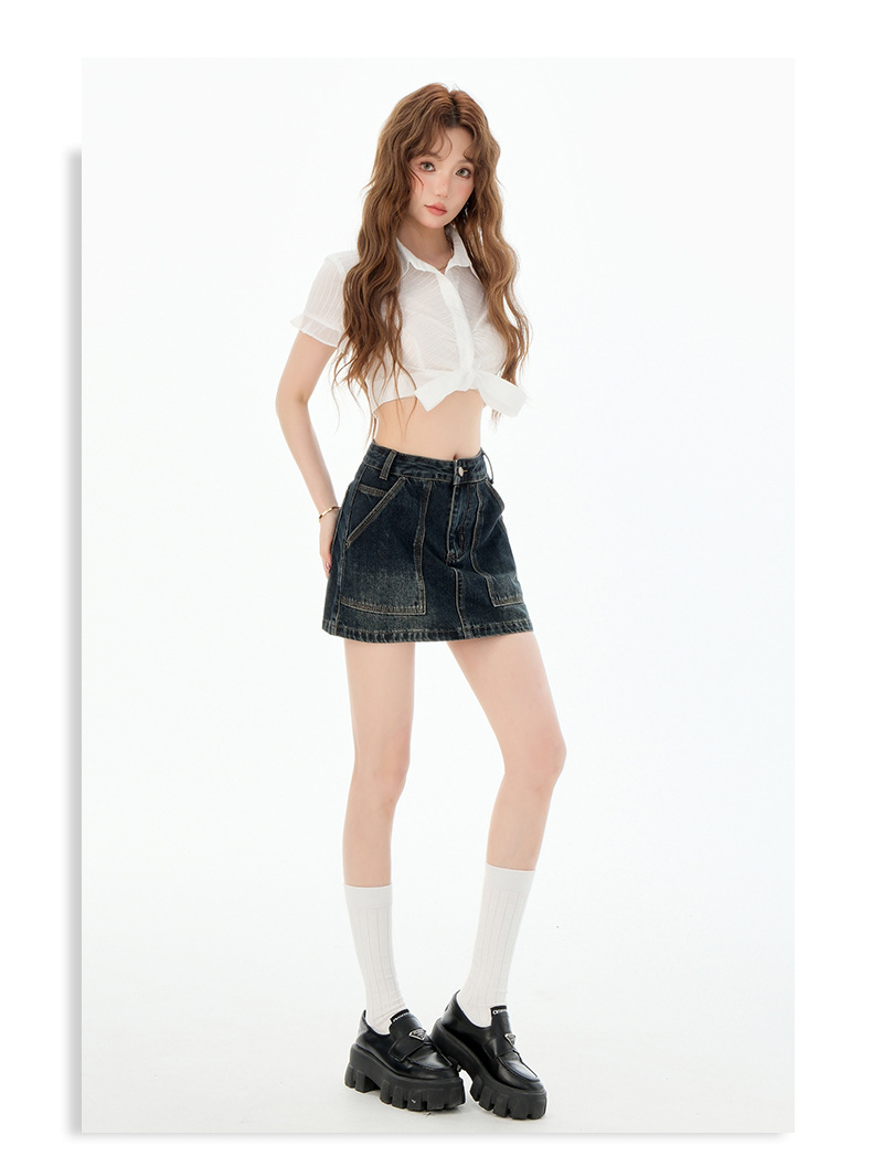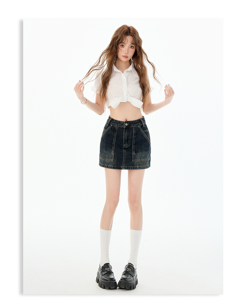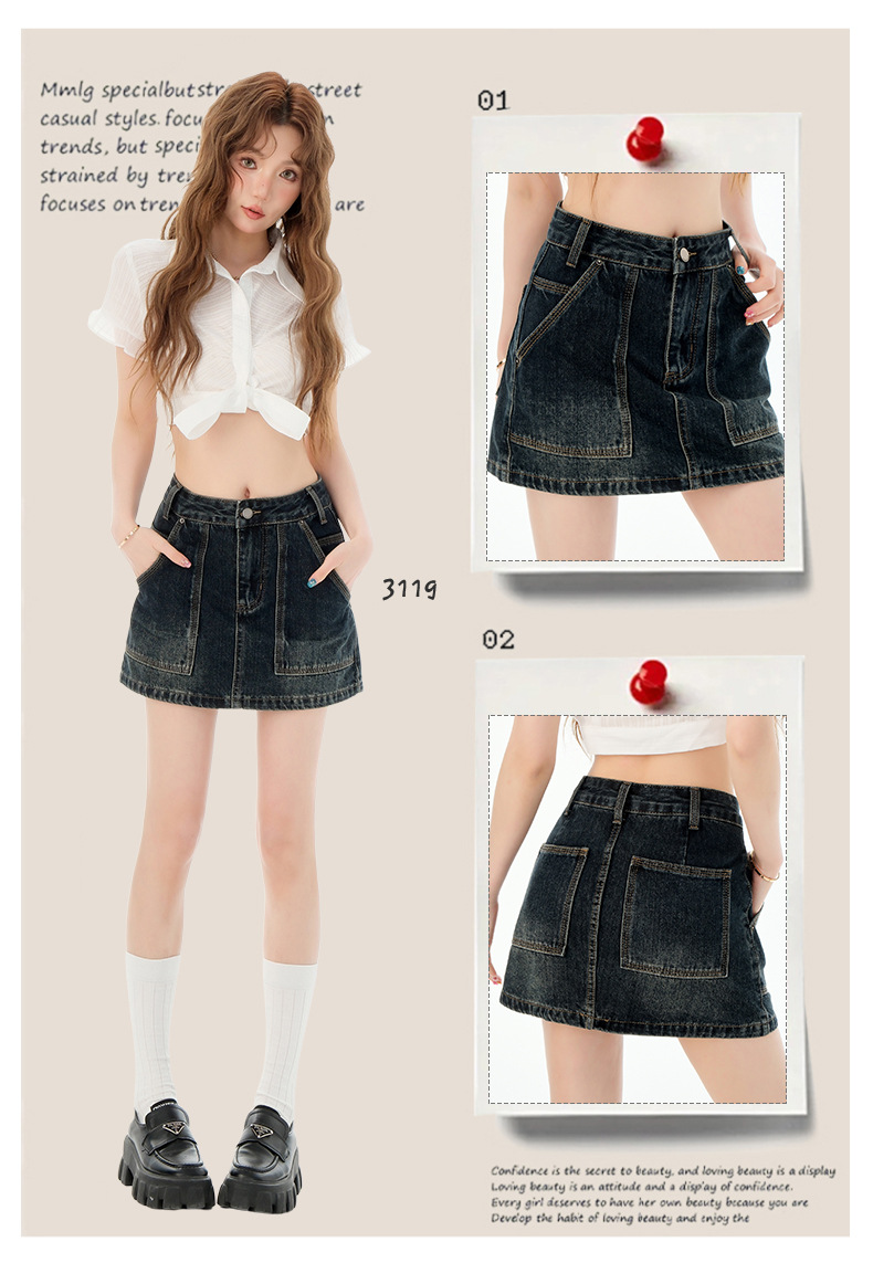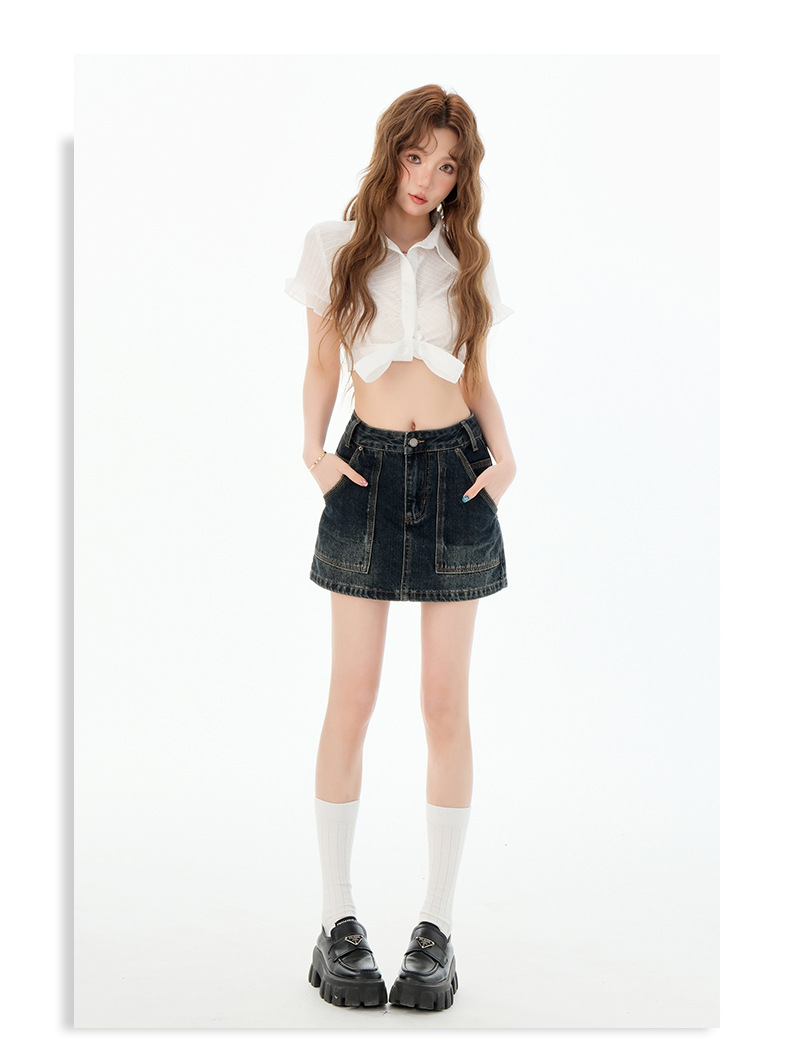 여성을위한 블루 그레이 데님 스커트 2025 여름 새로운 하이 웨이스트 슬리밍 다목적 노출 방지 핫 소녀 미니 스커트