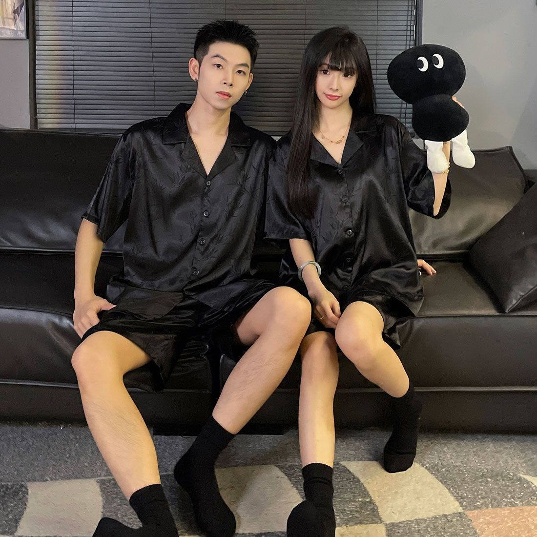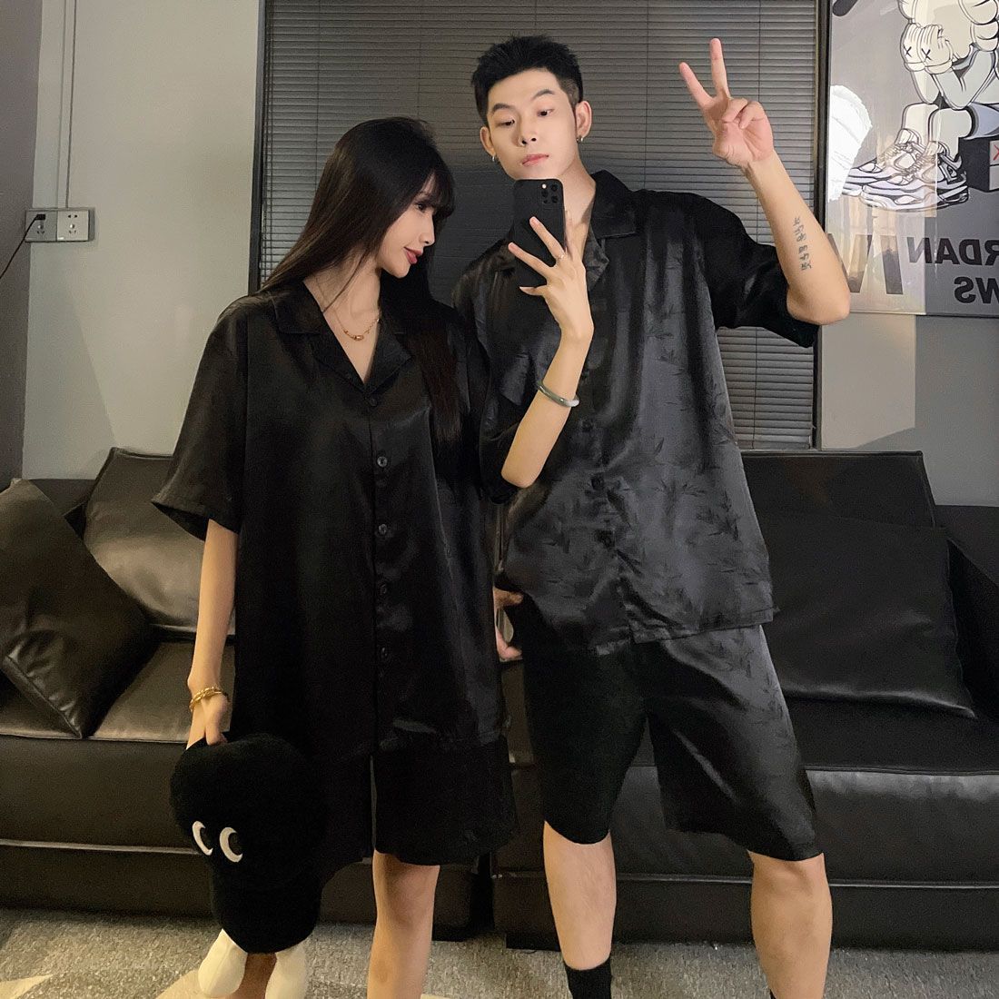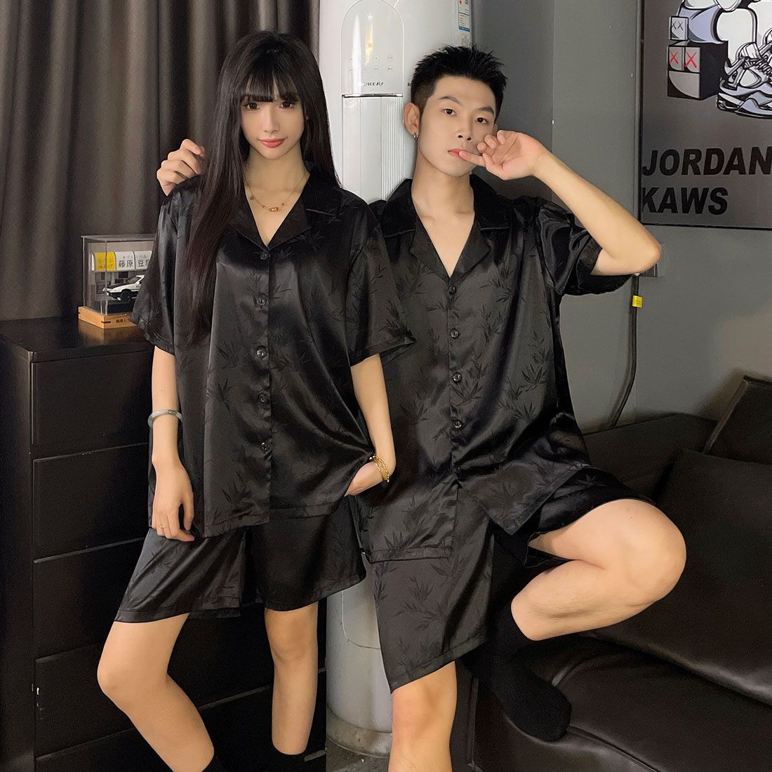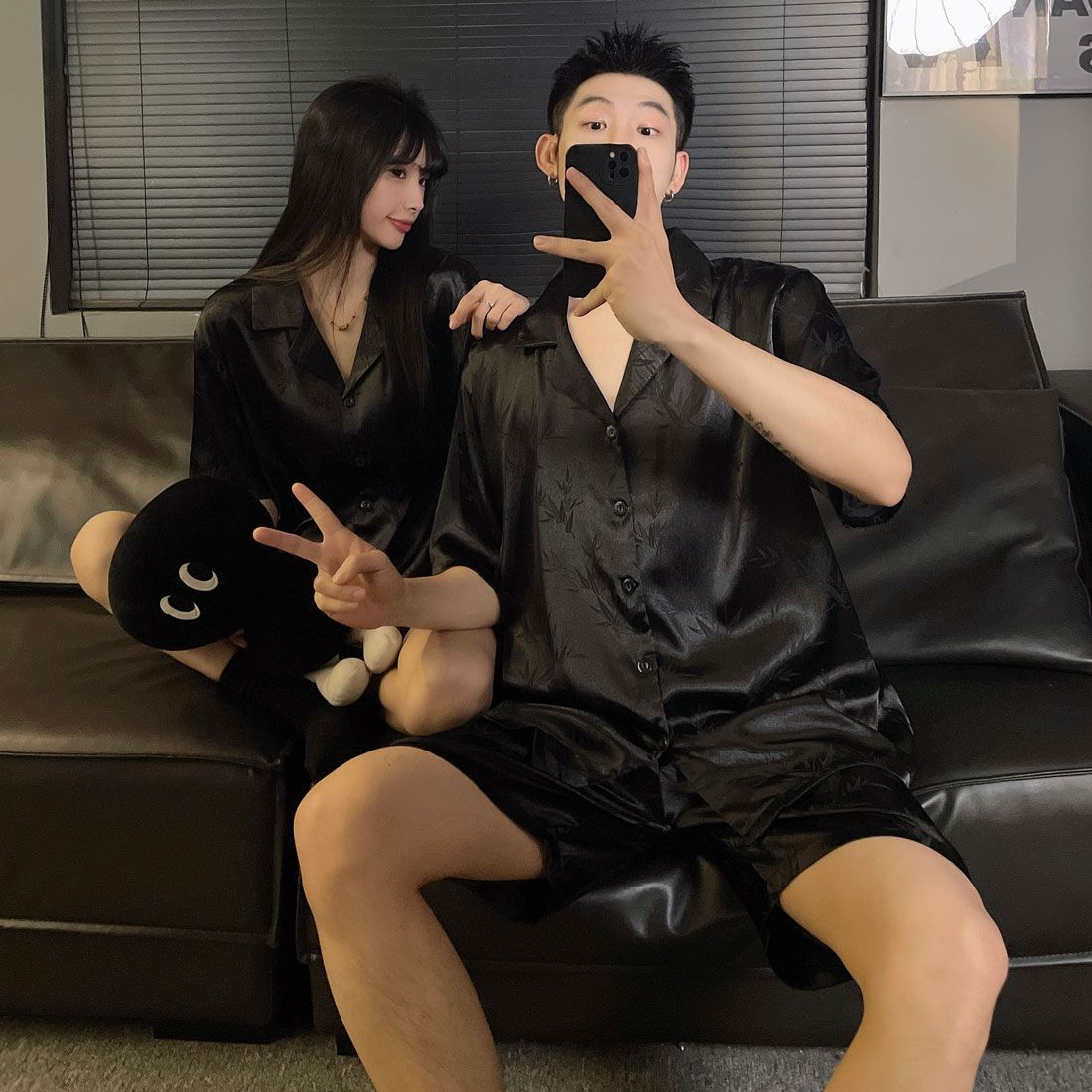여성을위한 커플 잠옷 여름 얇은 반팔 반바지 얼음 실크 하이 엔드 청소년 남성 여름 홈웨어 세트
