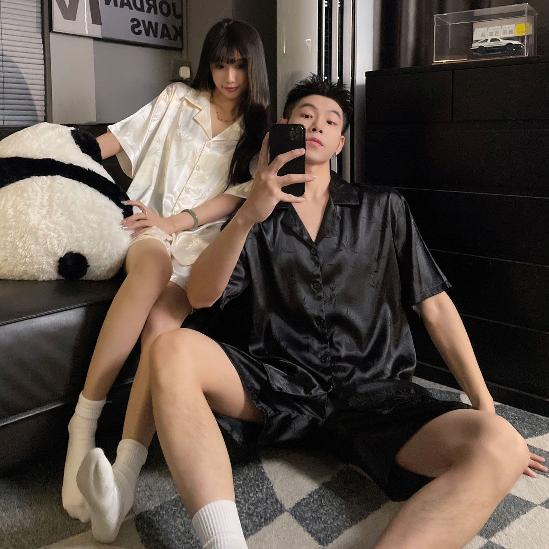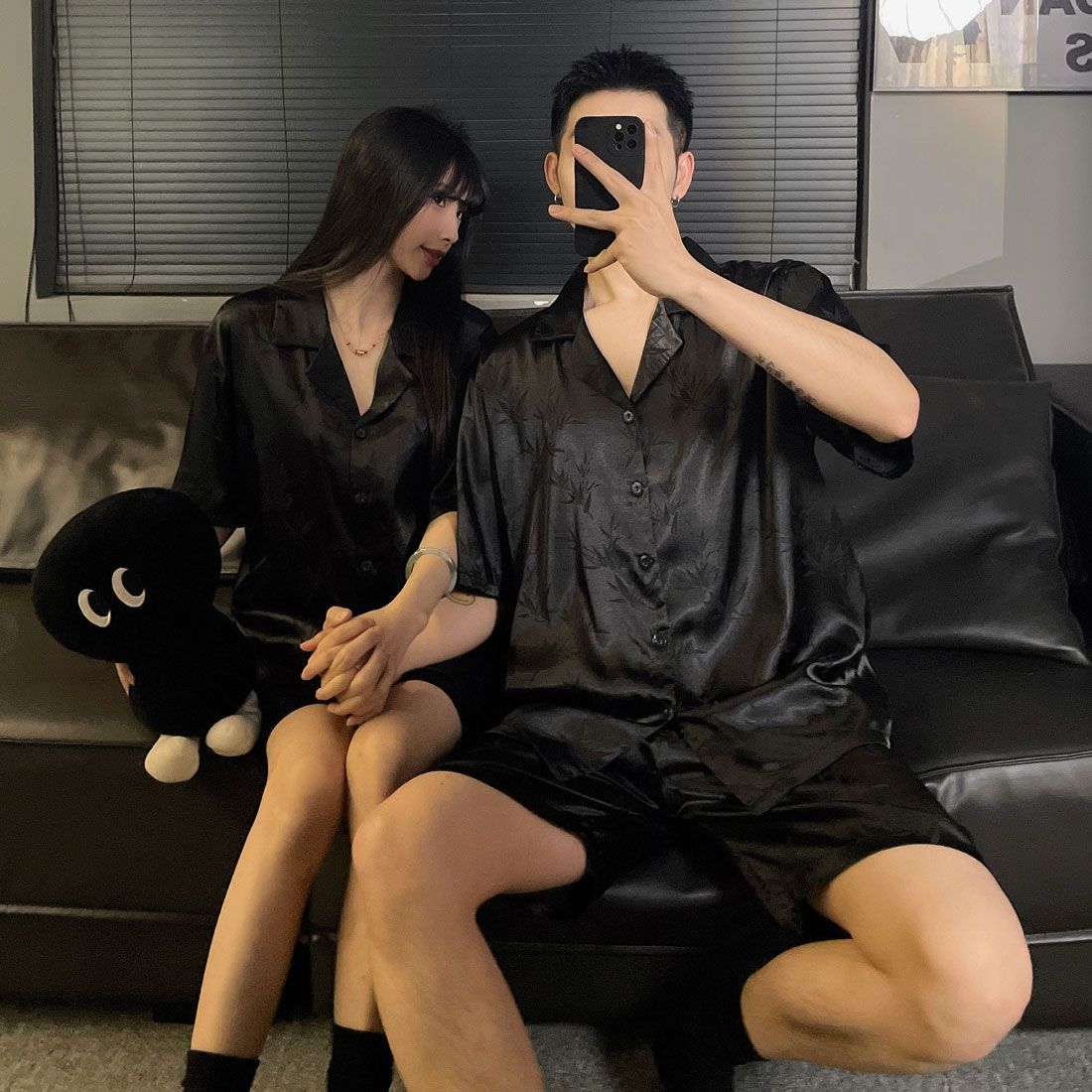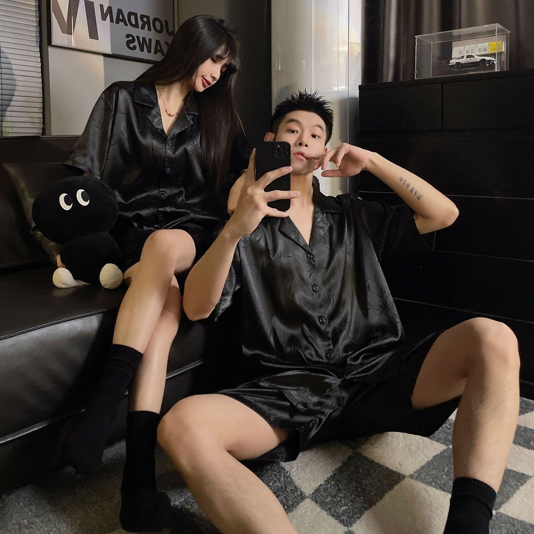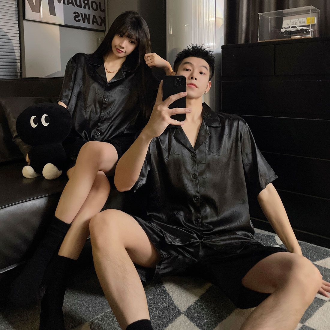 여성을위한 커플 잠옷 여름 얇은 반팔 반바지 얼음 실크 하이 엔드 청소년 남성 여름 홈웨어 세트