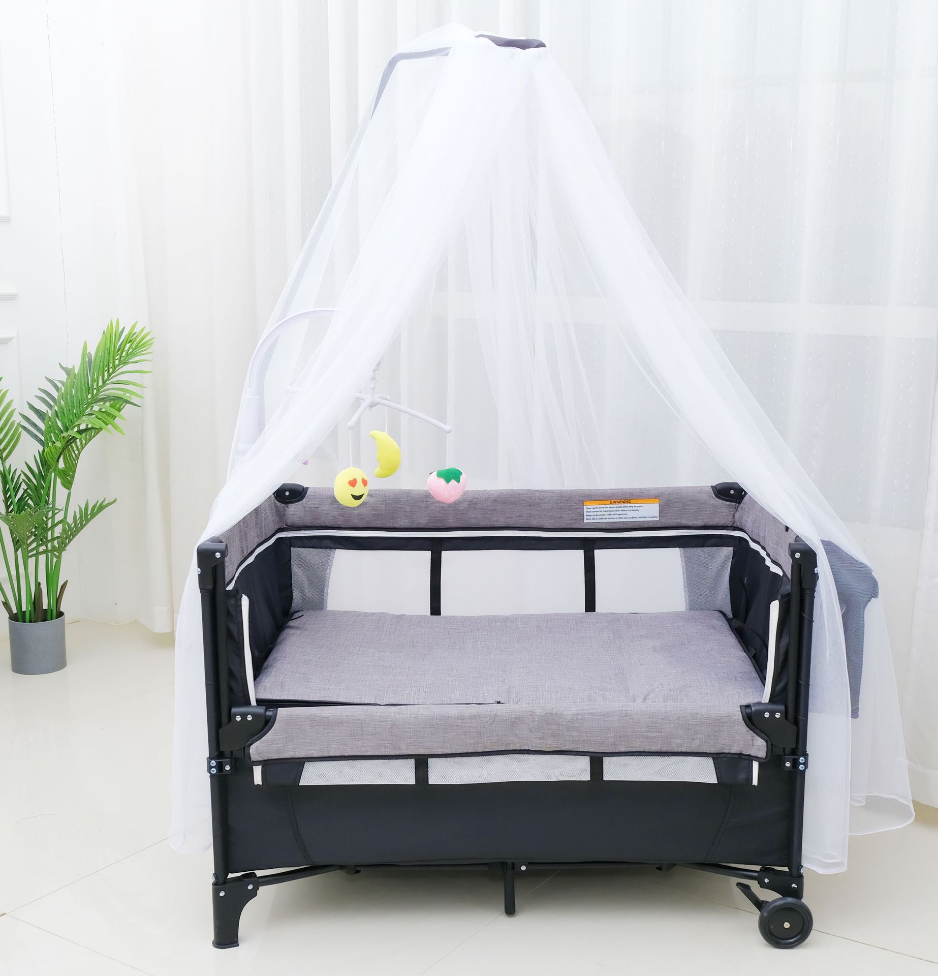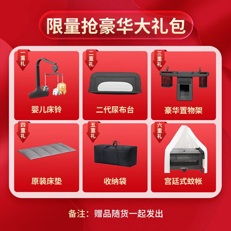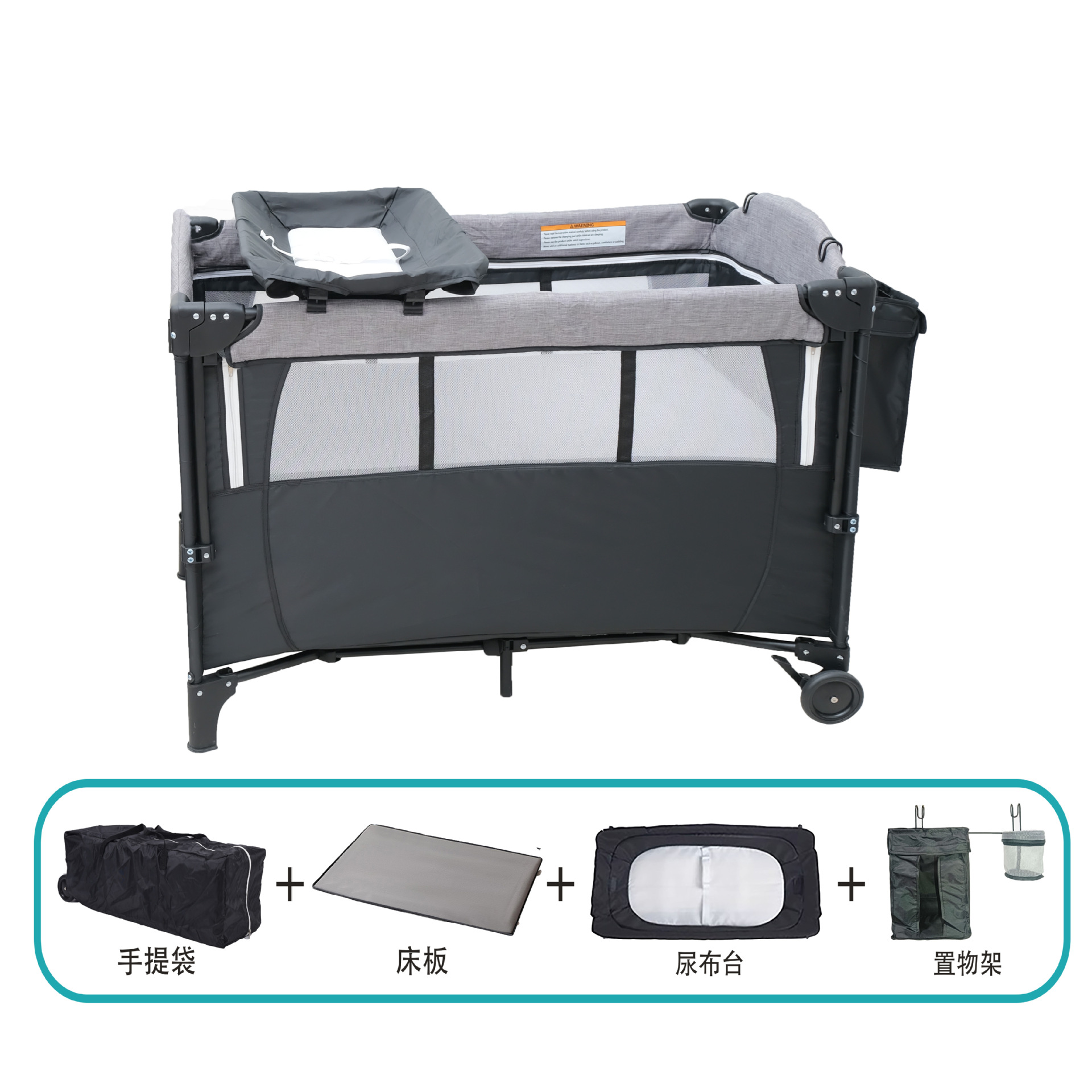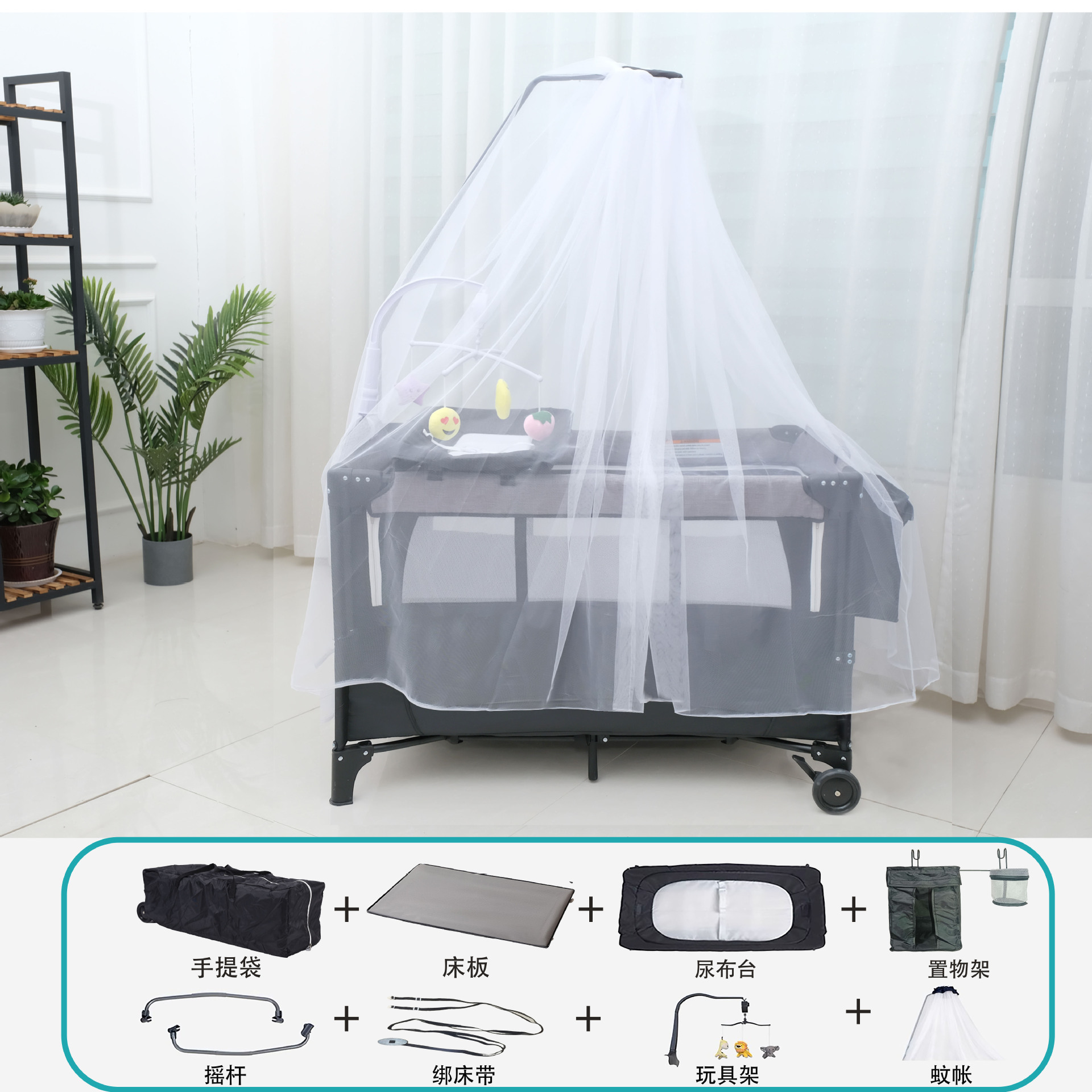 • 럭셔리 사륜 유니버셜 모리스 그레이 [핸드백 + 침대판 + 기저귀교환대 + 수납선반 + 로커 + 침대벨트 + 장난감걸이 + 모기장] 완비