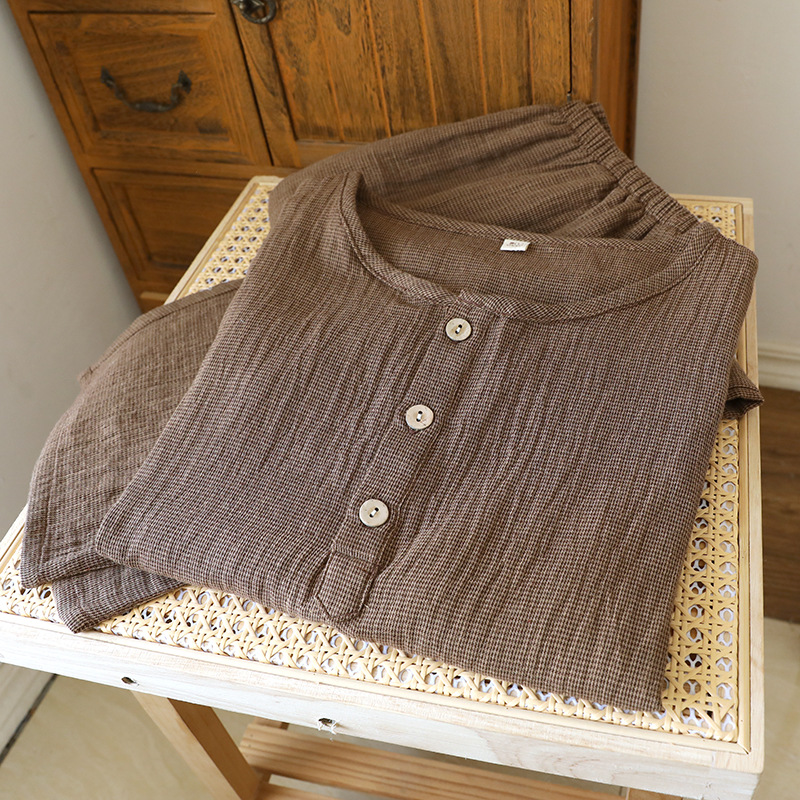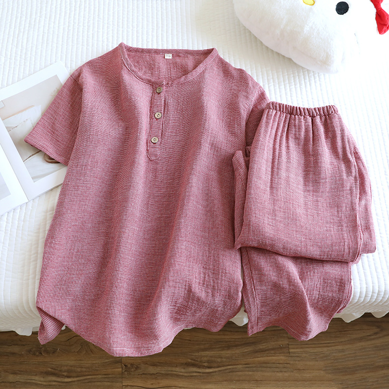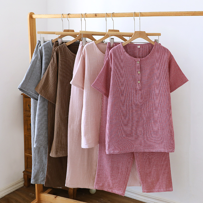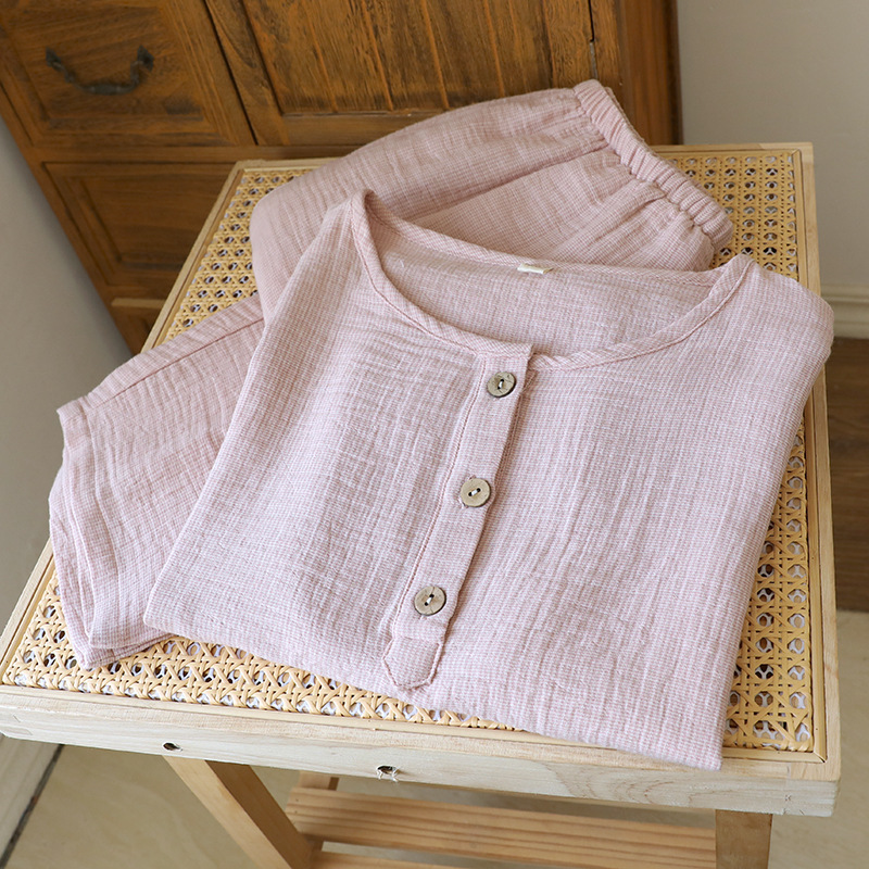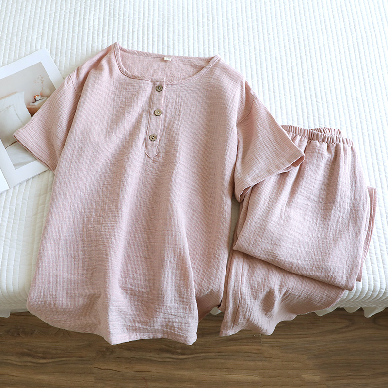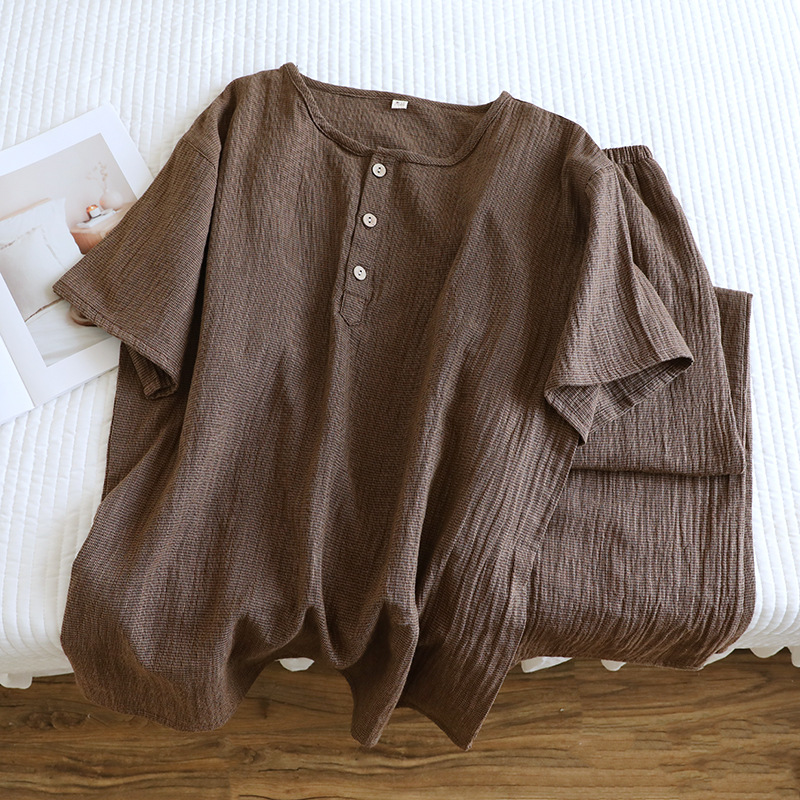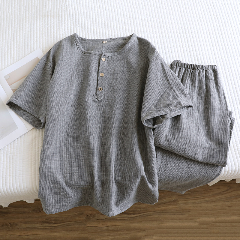 평범한 커플의 면 두 배 층 원사 반팔 바지 세트 간단한 둥근 목 파자마 캐주얼 외관이 느슨하게 착용