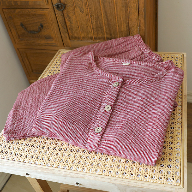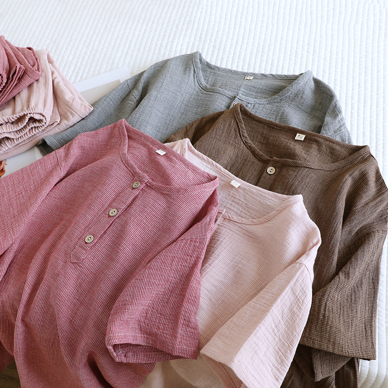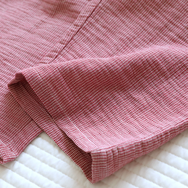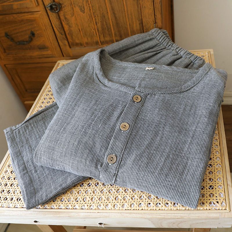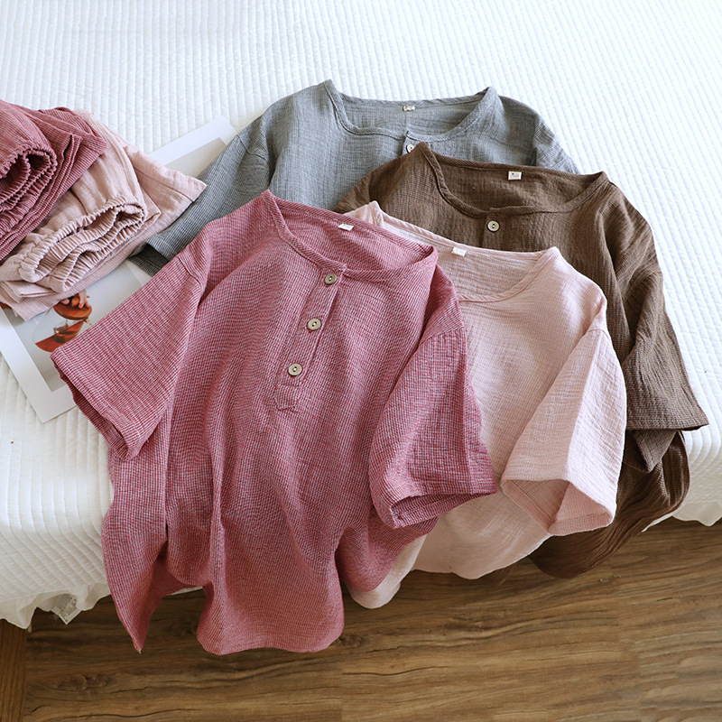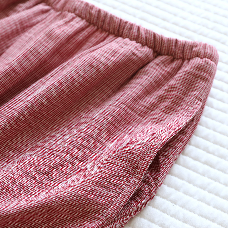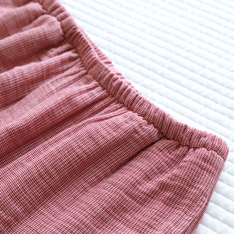 평범한 커플의 면 두 배 층 원사 반팔 바지 세트 간단한 둥근 목 파자마 캐주얼 외관이 느슨하게 착용