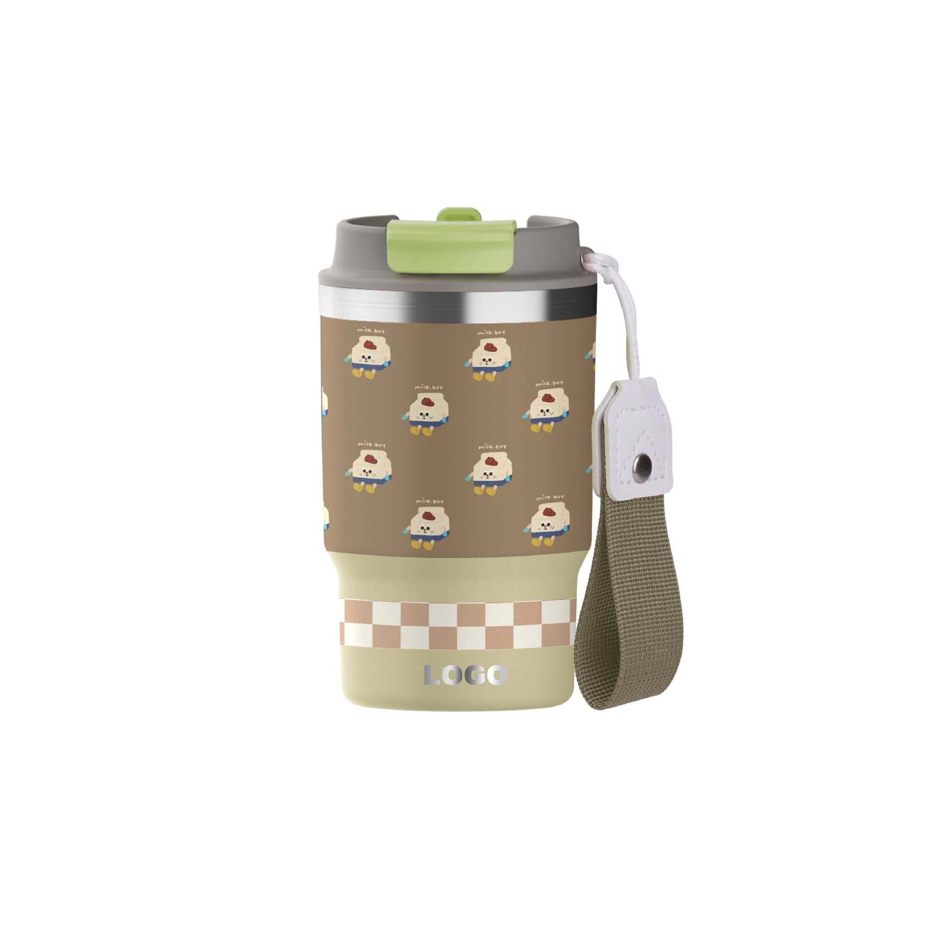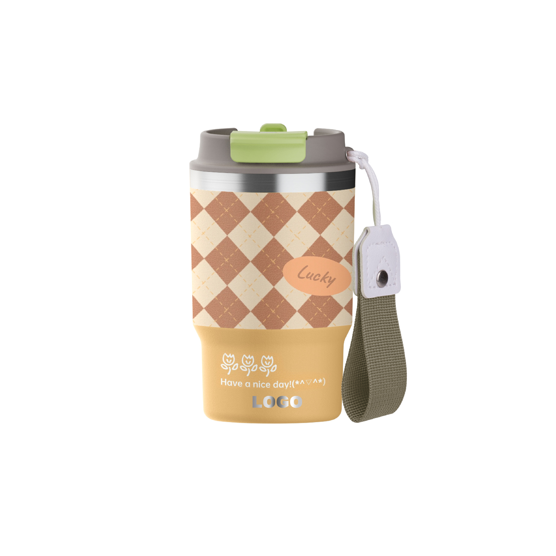 • 녹색 격자 무늬 꽃 커피 컵