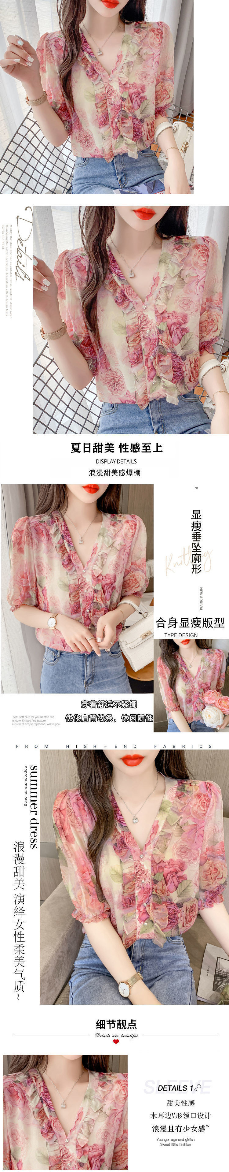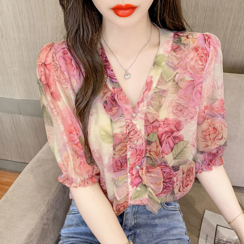 여성을위한 프렌치 V 넥 꽃 무늬 셔츠 여름 2025 새로운 스타일 프릴 패션 반팔 핑크 쉬폰 탑