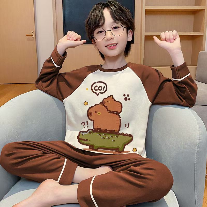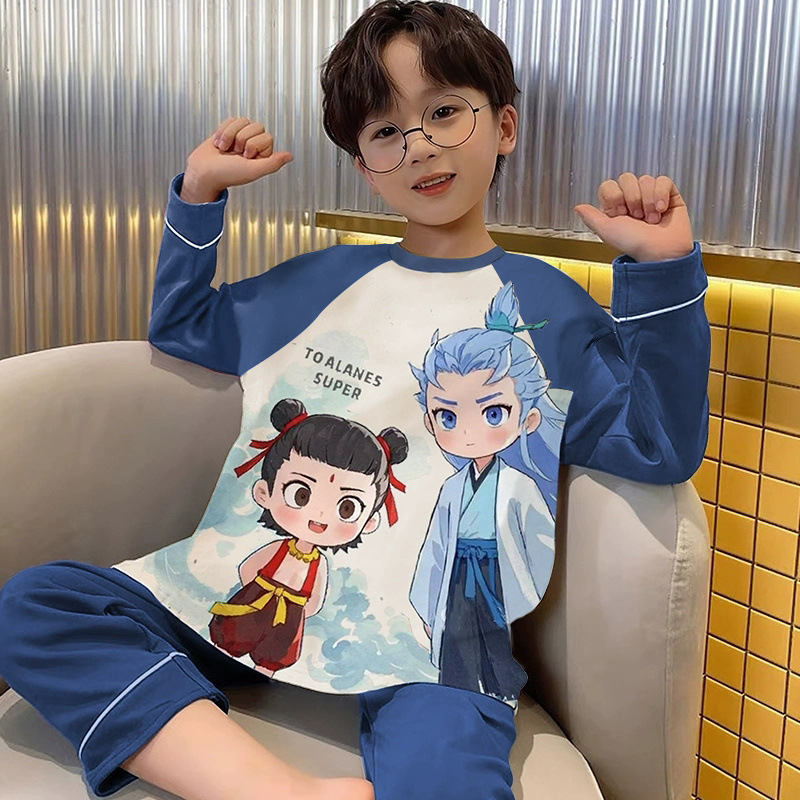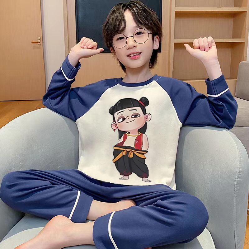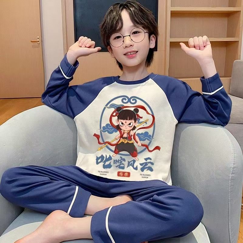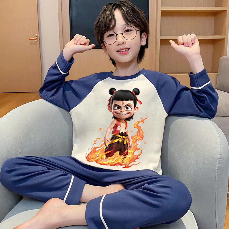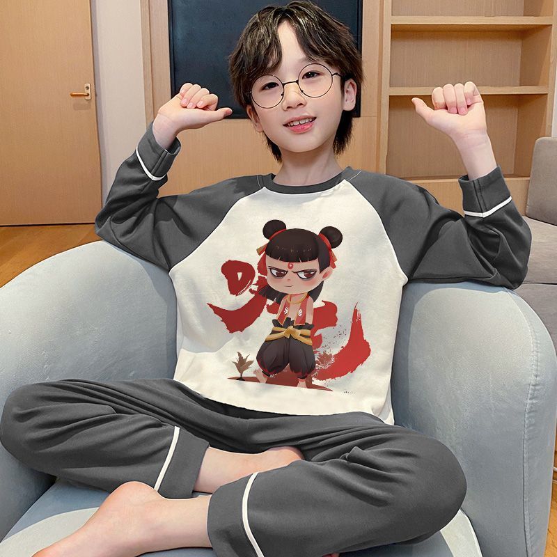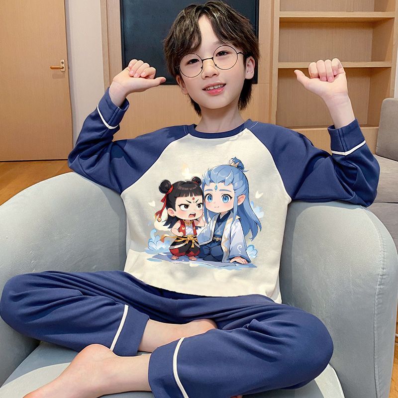어린이 잠옷 순면 긴팔 바지 2025 봄, 가을 새로운 Nezha 소년 중대형 소년 홈웨어 세트