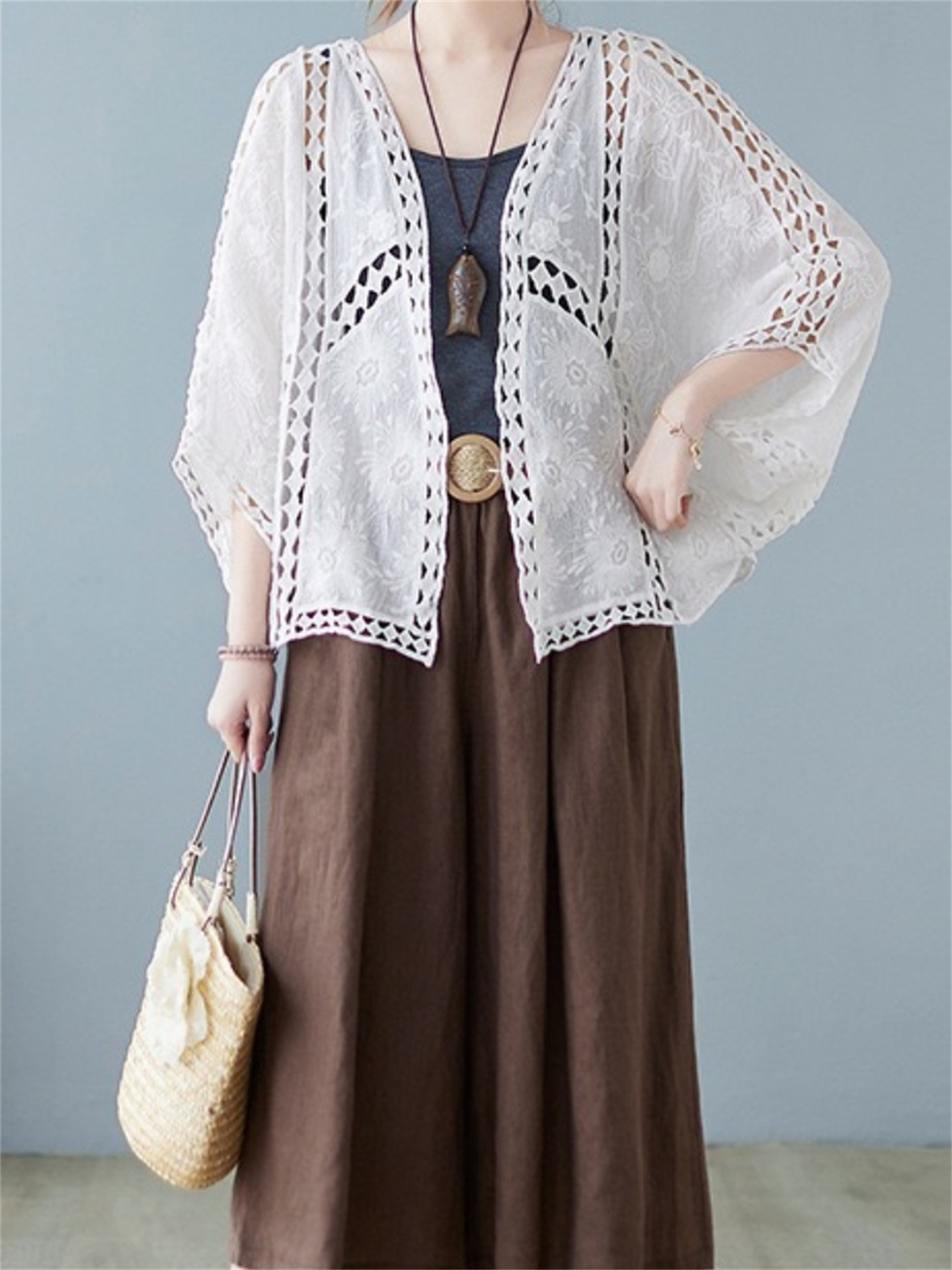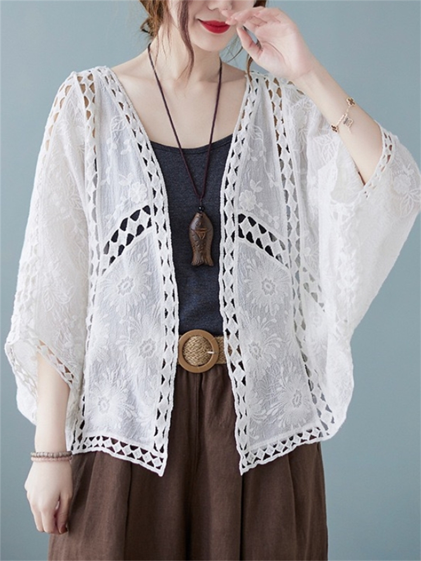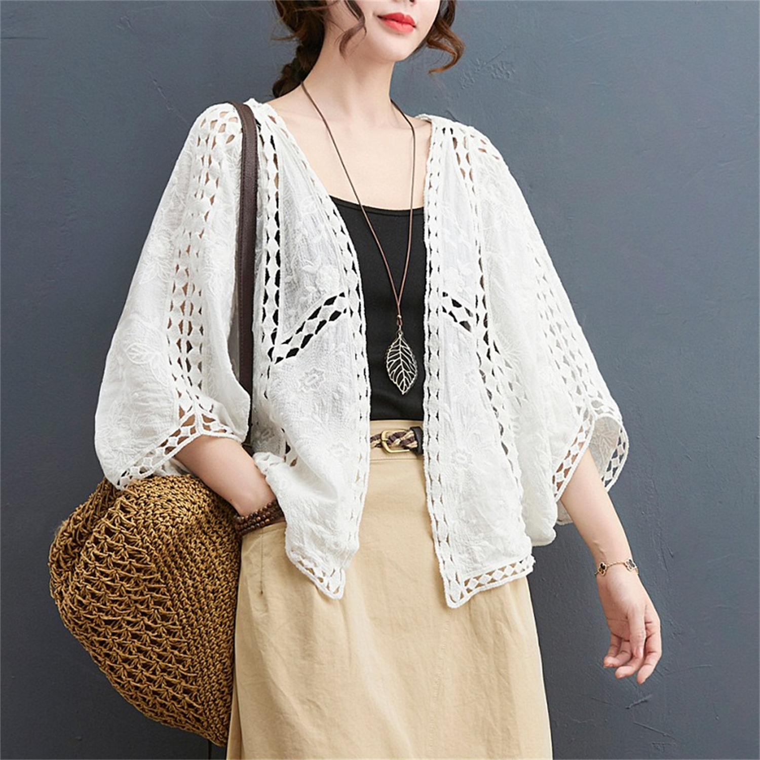 짧은 옷 탑 외부 태양 보호 코트 착용 여성 의류 외부 카디건 자수 중공 보헤미안 민족 스타일 와이드