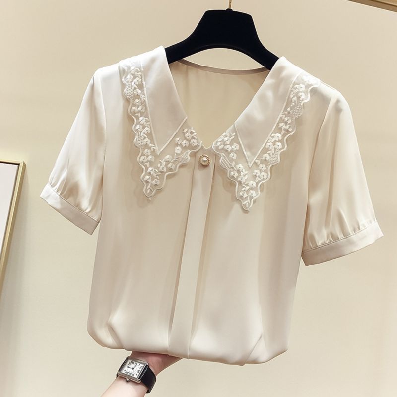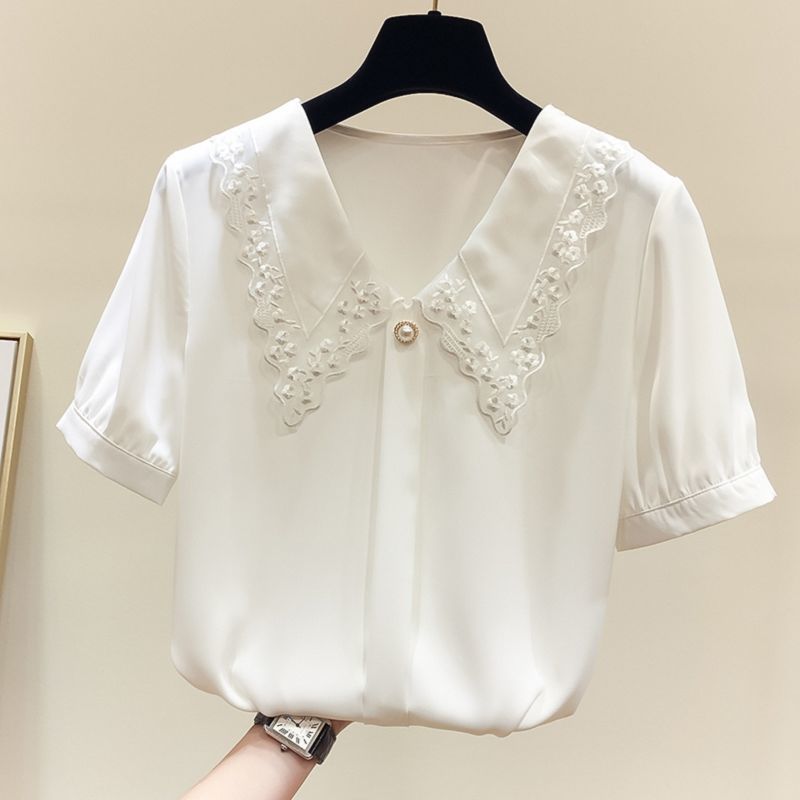 시폰 셔츠 여성용 반팔 2025 여름 신작 한국식 하이 엔드 루즈 슬리밍 인형 칼라 스위트 스타일 트렌디 스몰 셔츠스토어 가기
