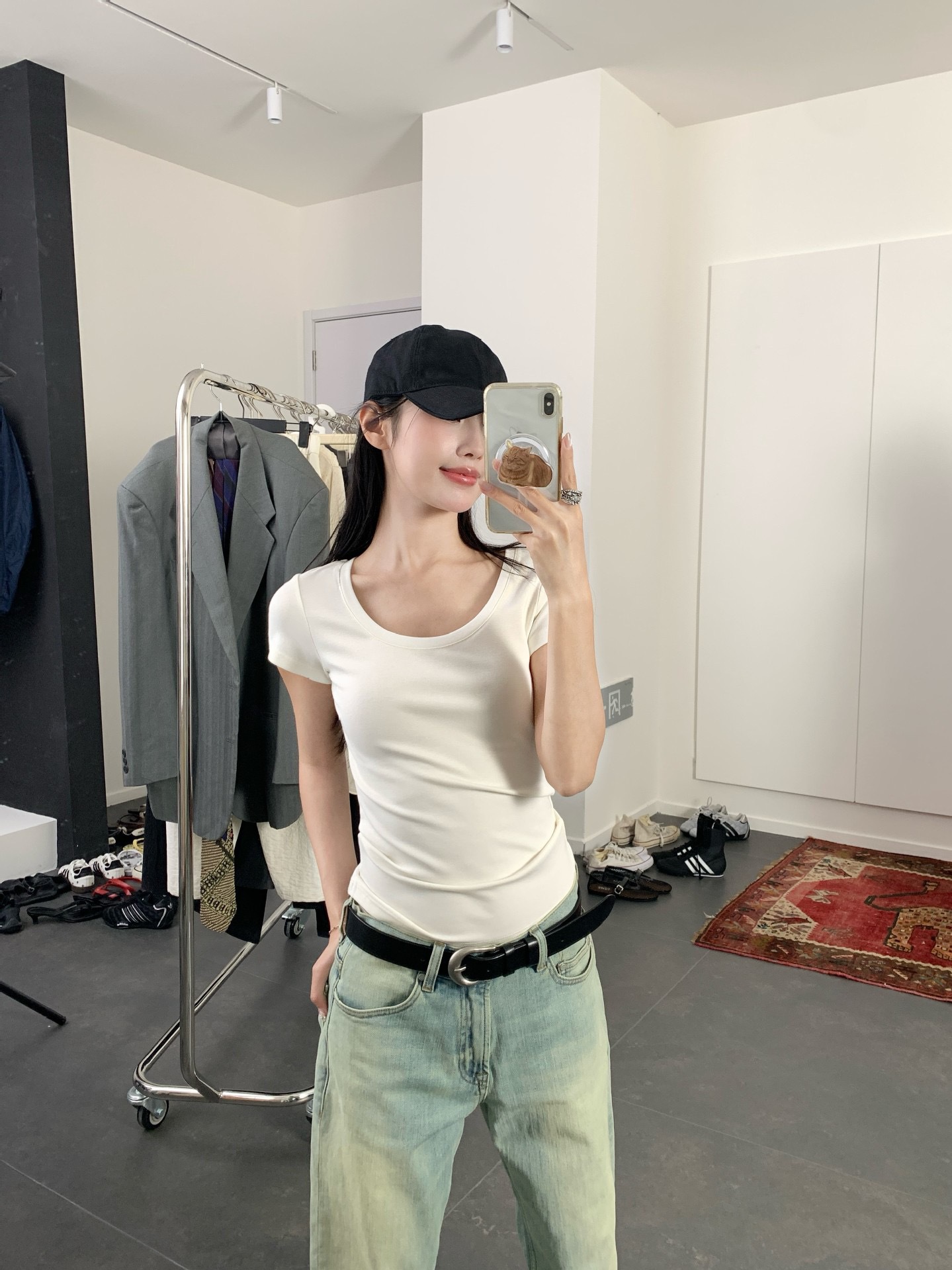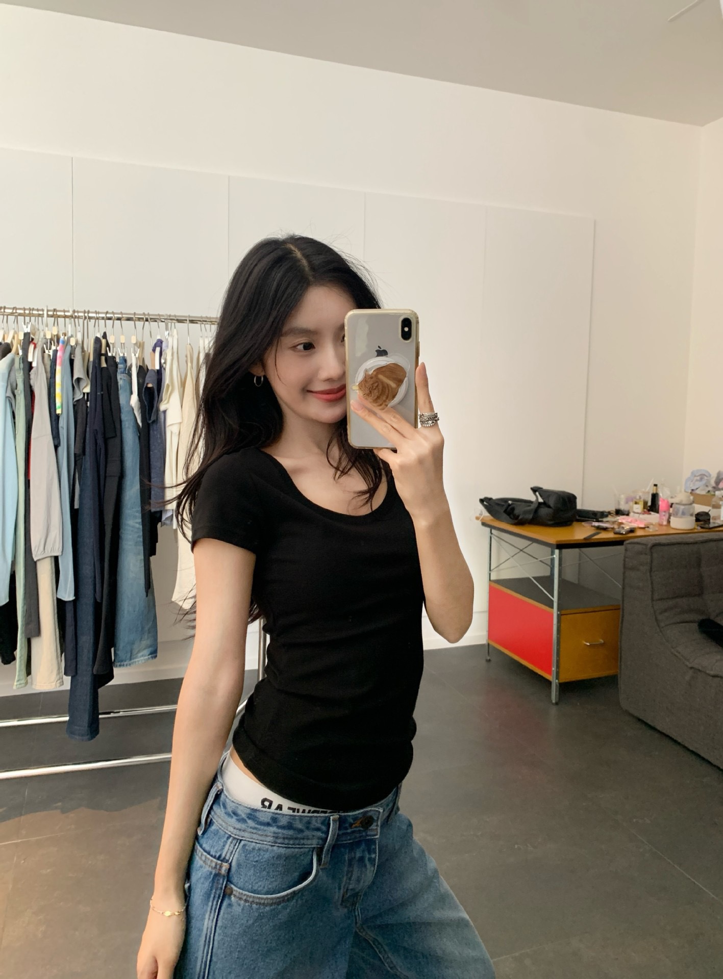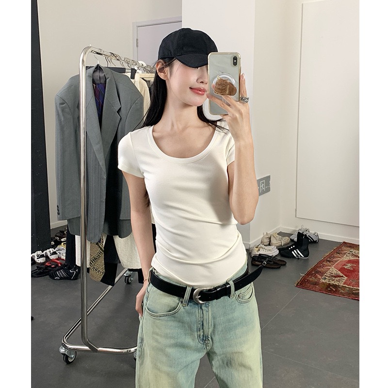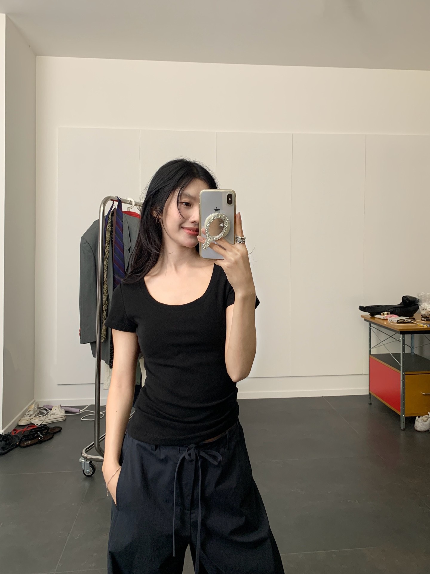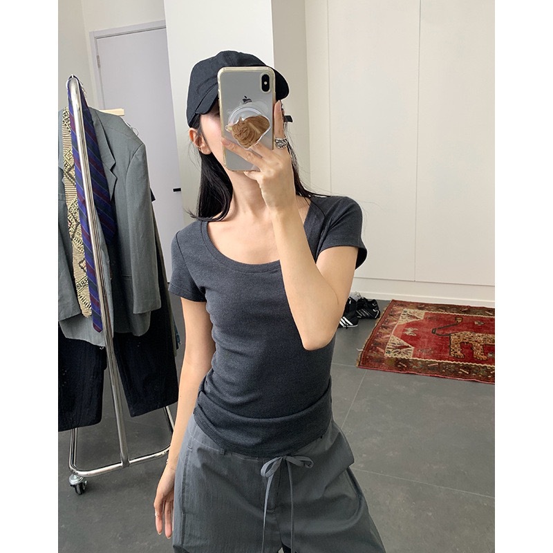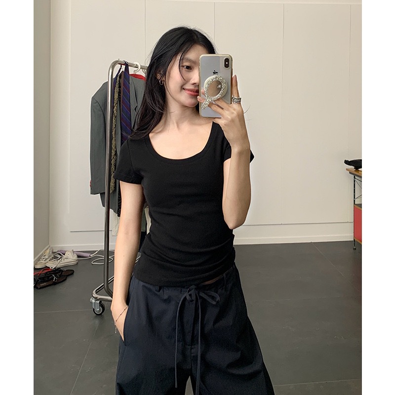 콰이 리 베이직 U 칼라 반팔 티셔츠 여성용 여름 새로운 슬림 핏 슬리밍 스킨 친화적 인 스트레치 어깨 타이트 웨이스트 탑스토어 가기