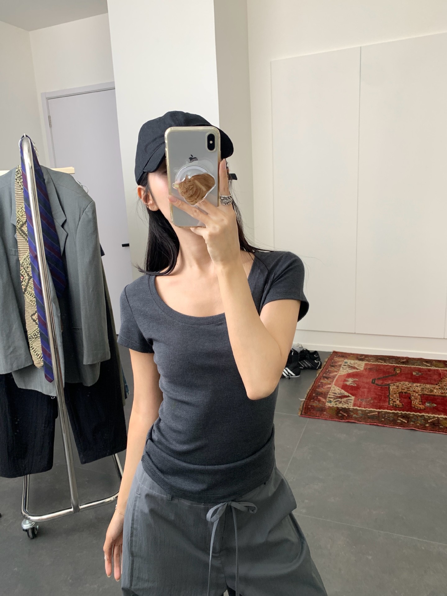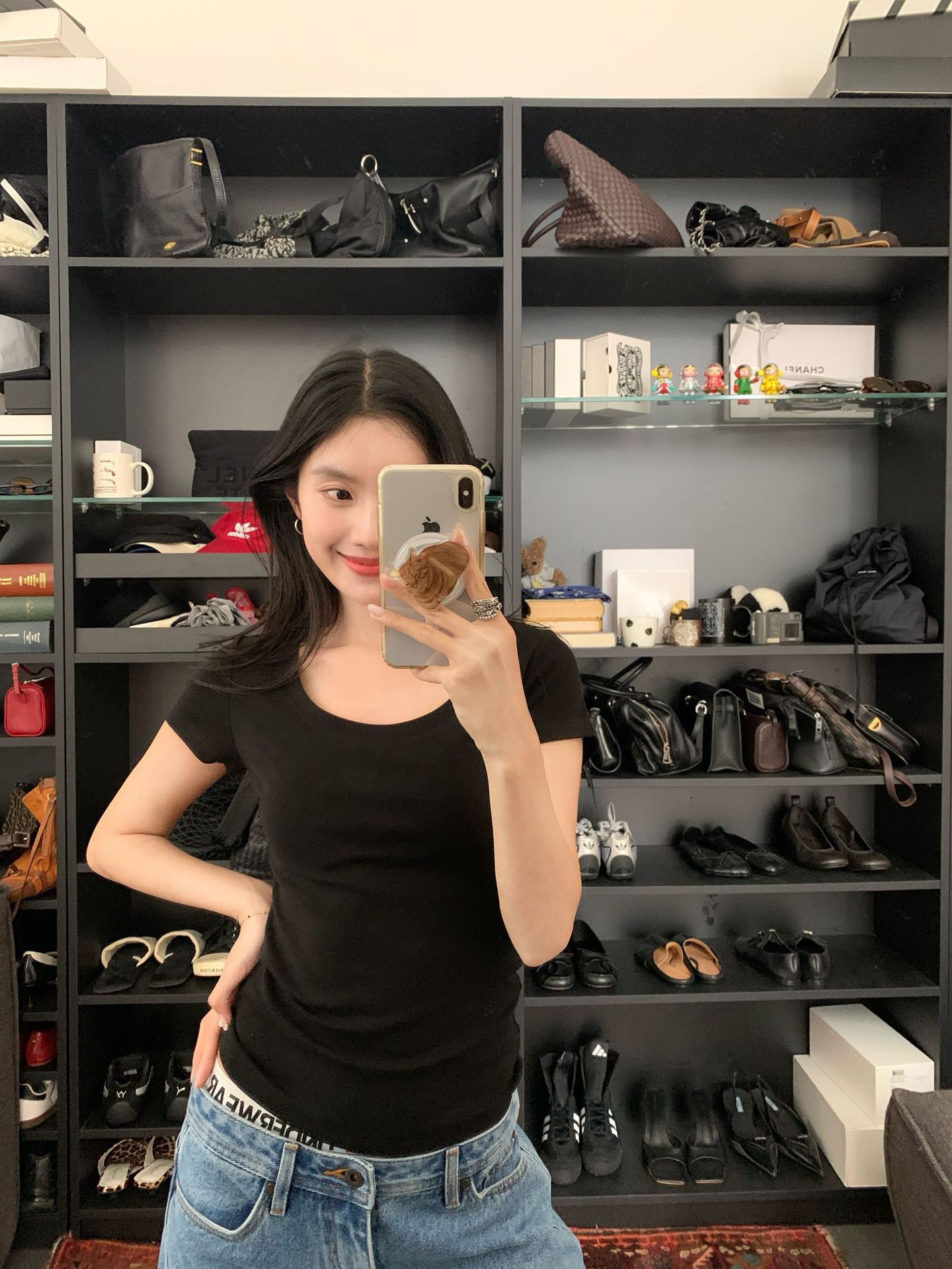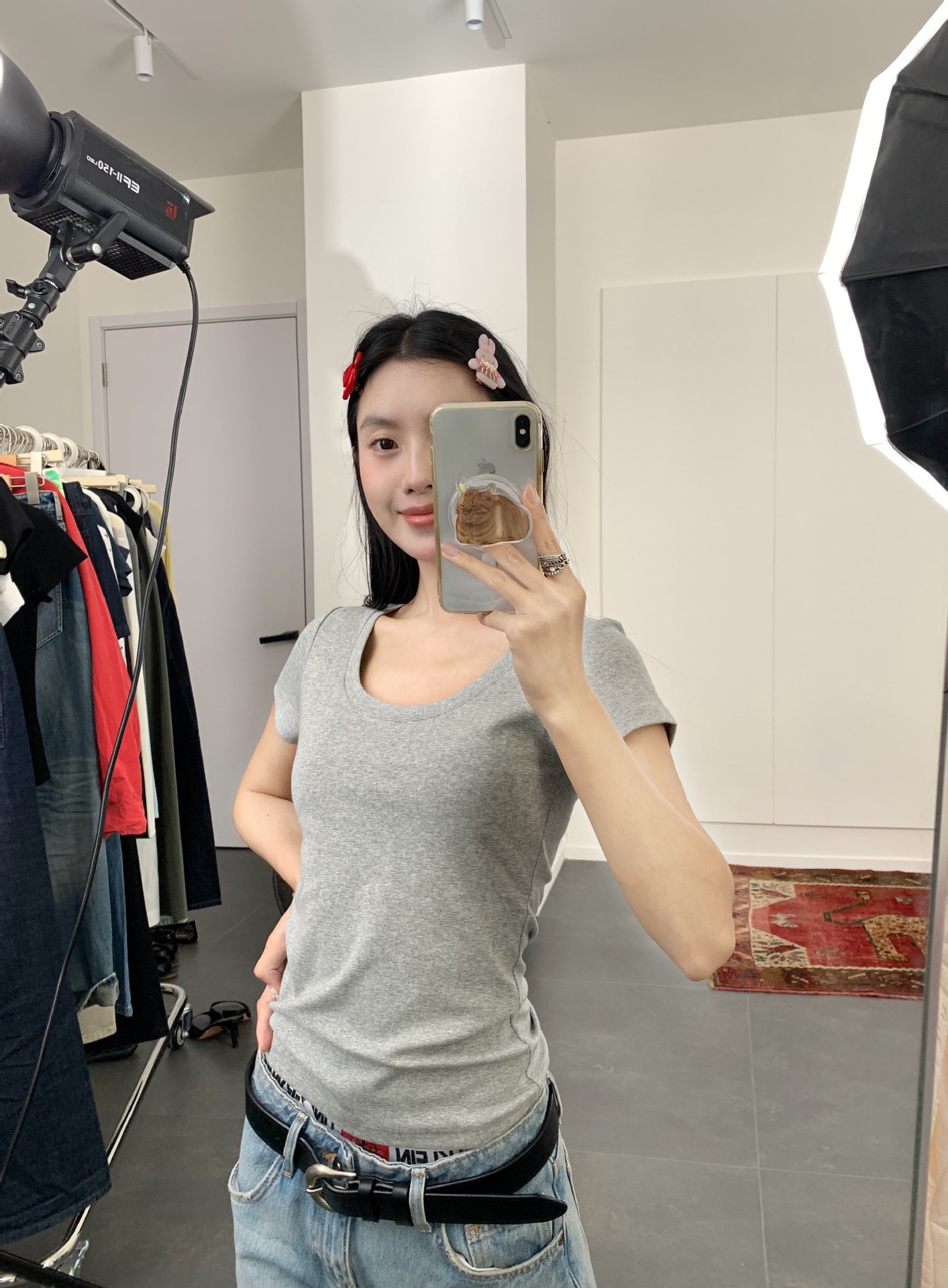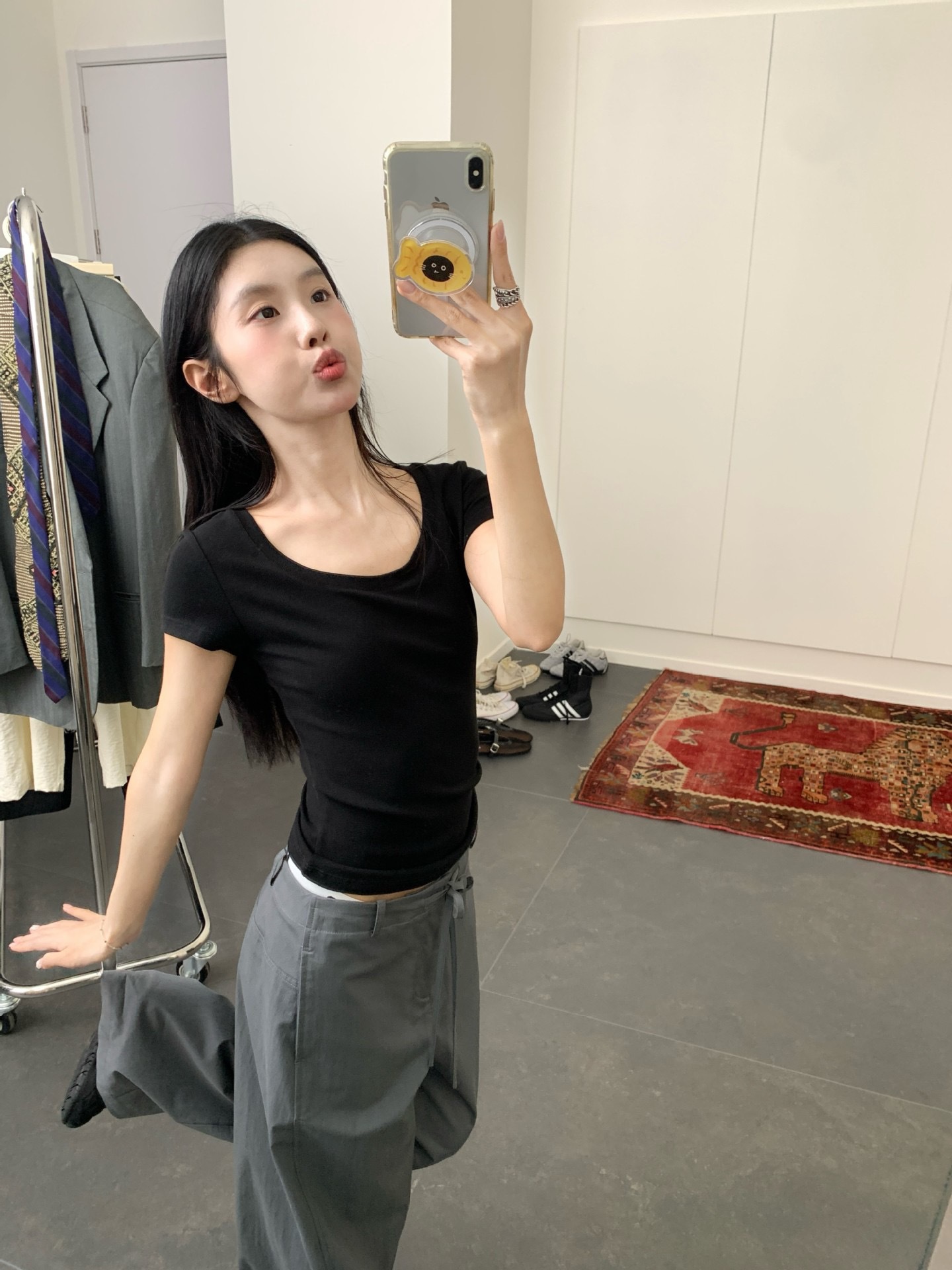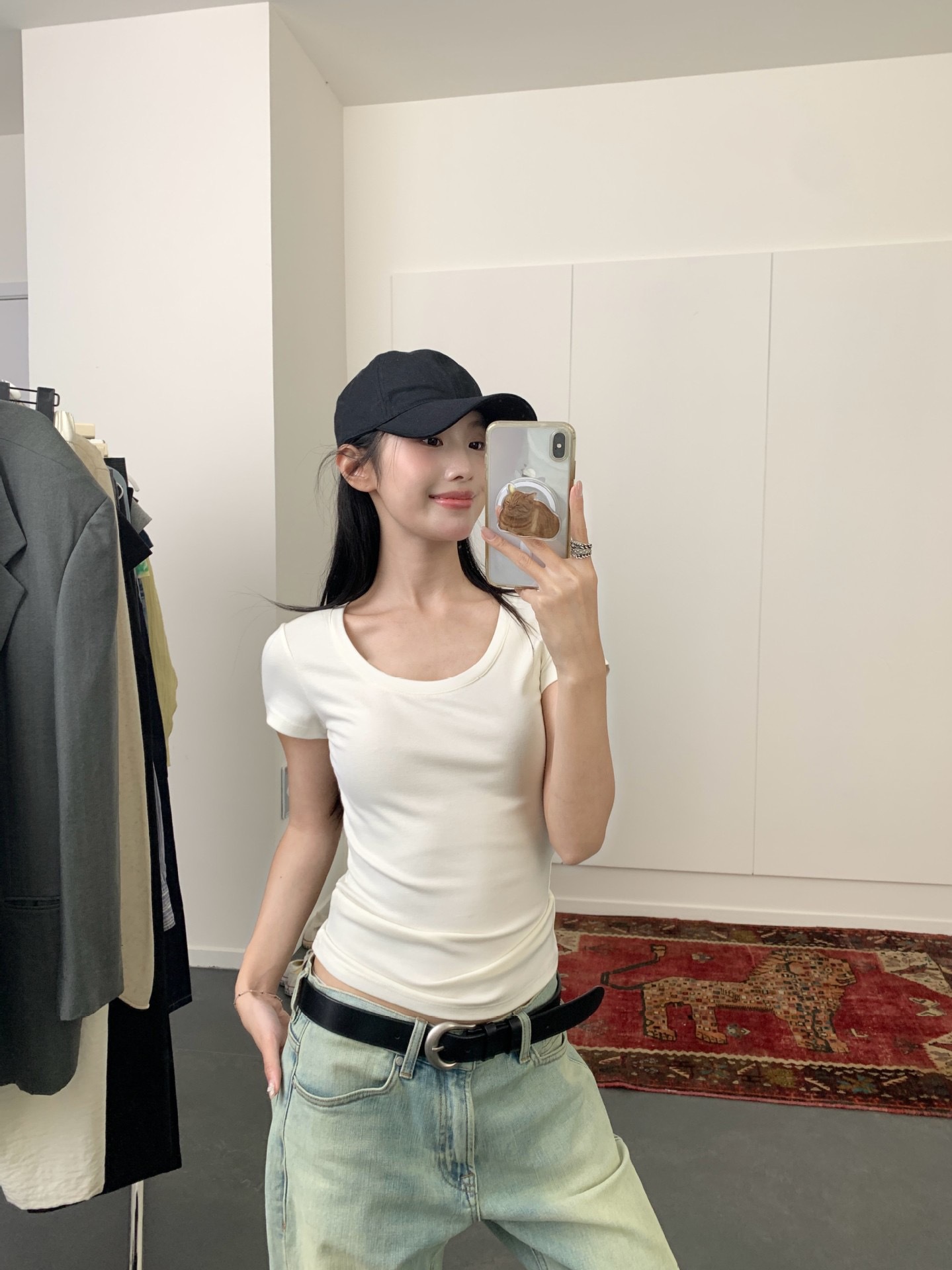 콰이 리 베이직 U 칼라 반팔 티셔츠 여성용 여름 새로운 슬림 핏 슬리밍 스킨 친화적 인 스트레치 어깨 타이트 웨이스트 탑스토어 가기