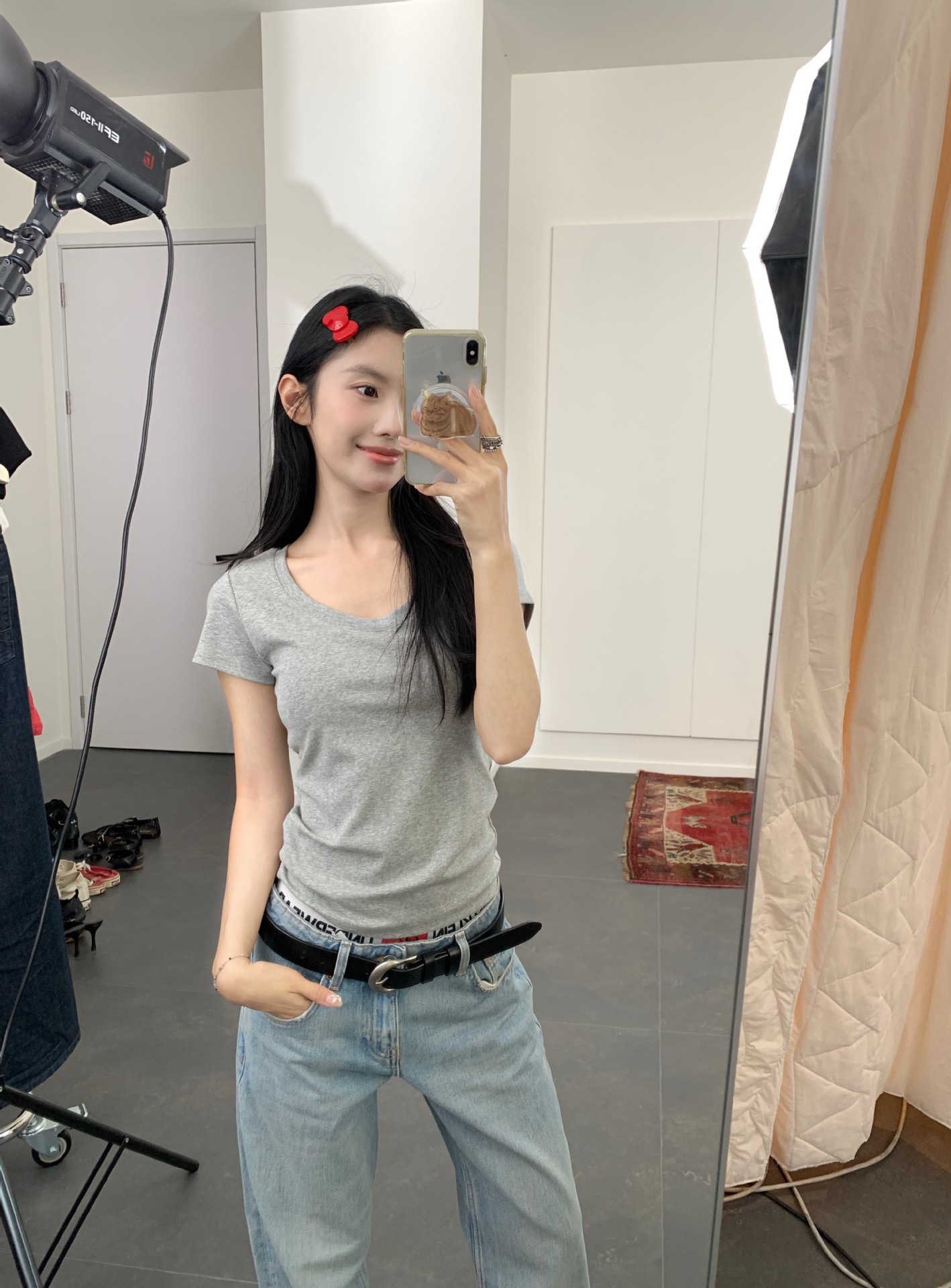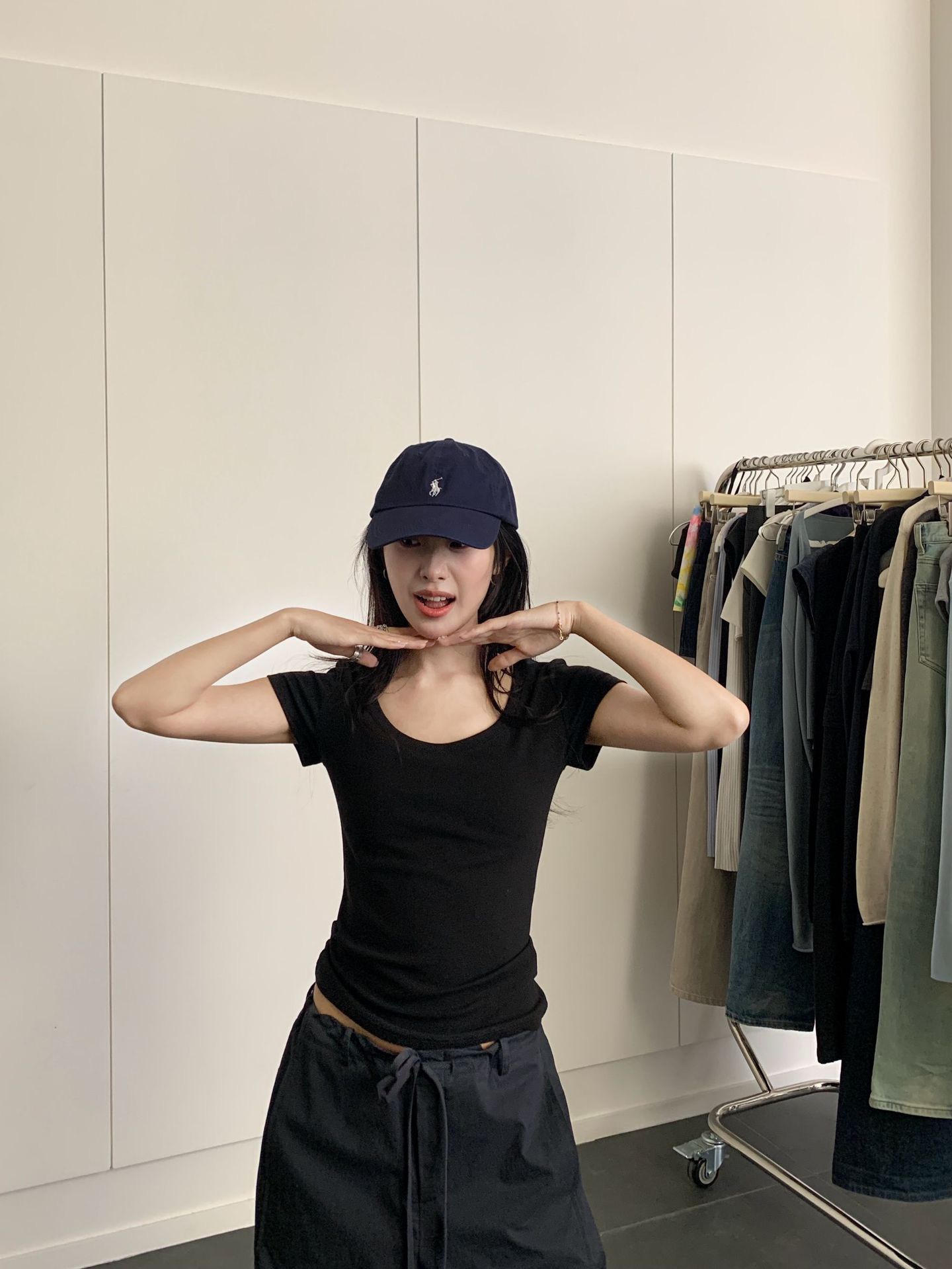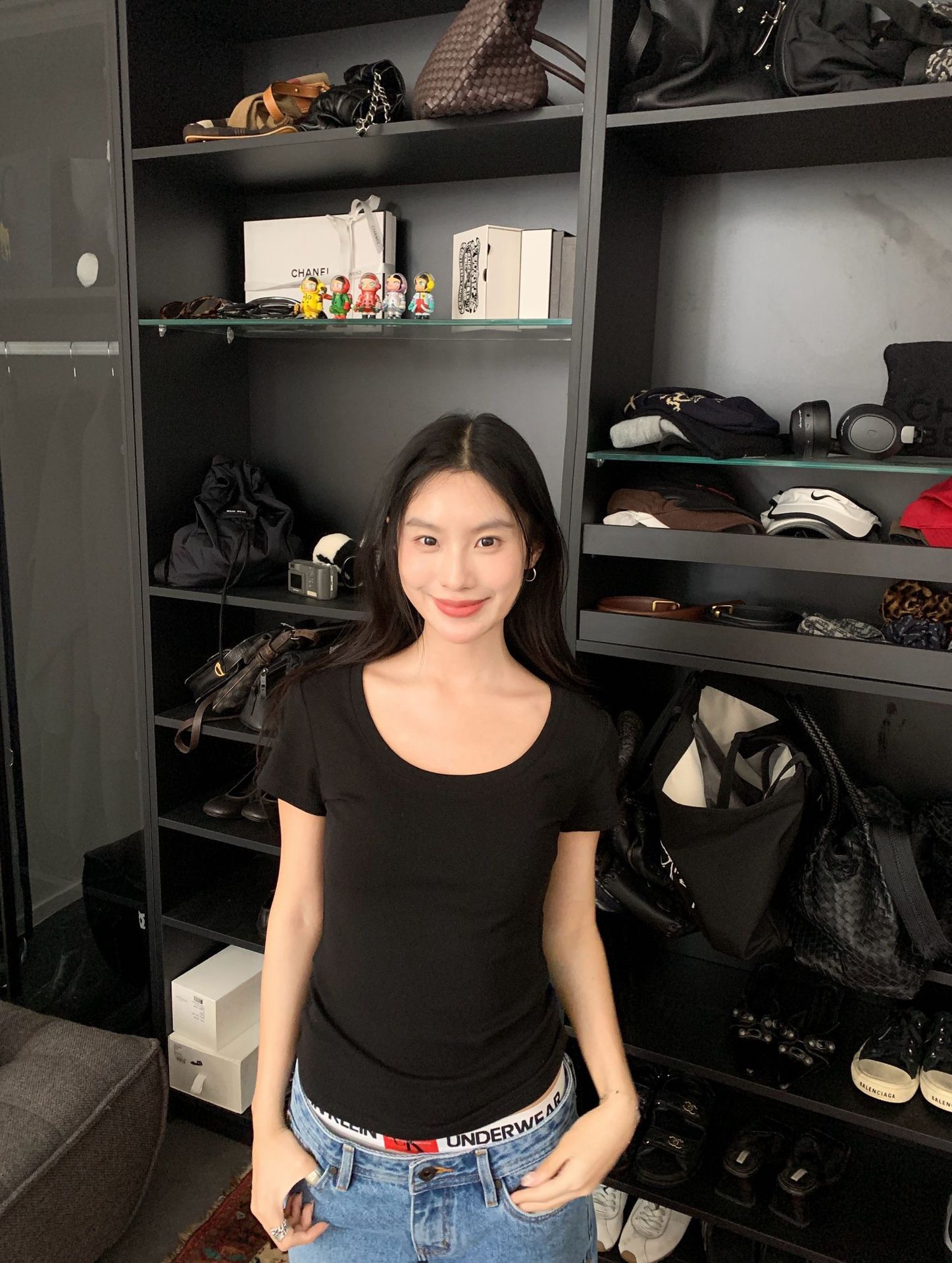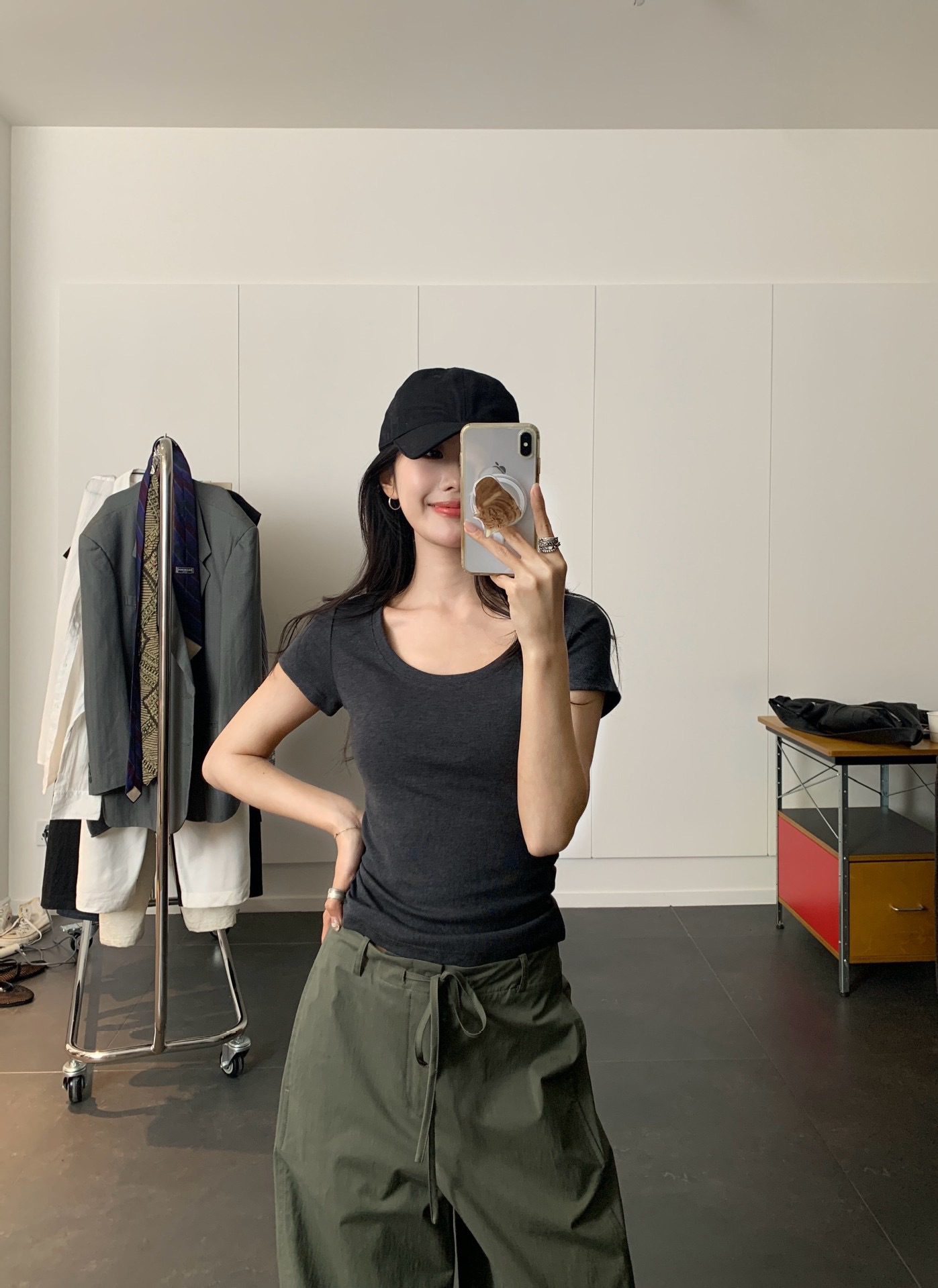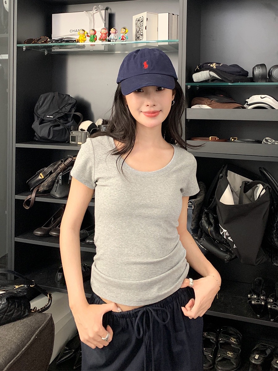 콰이 리 베이직 U 칼라 반팔 티셔츠 여성용 여름 새로운 슬림 핏 슬리밍 스킨 친화적 인 스트레치 어깨 타이트 웨이스트 탑스토어 가기