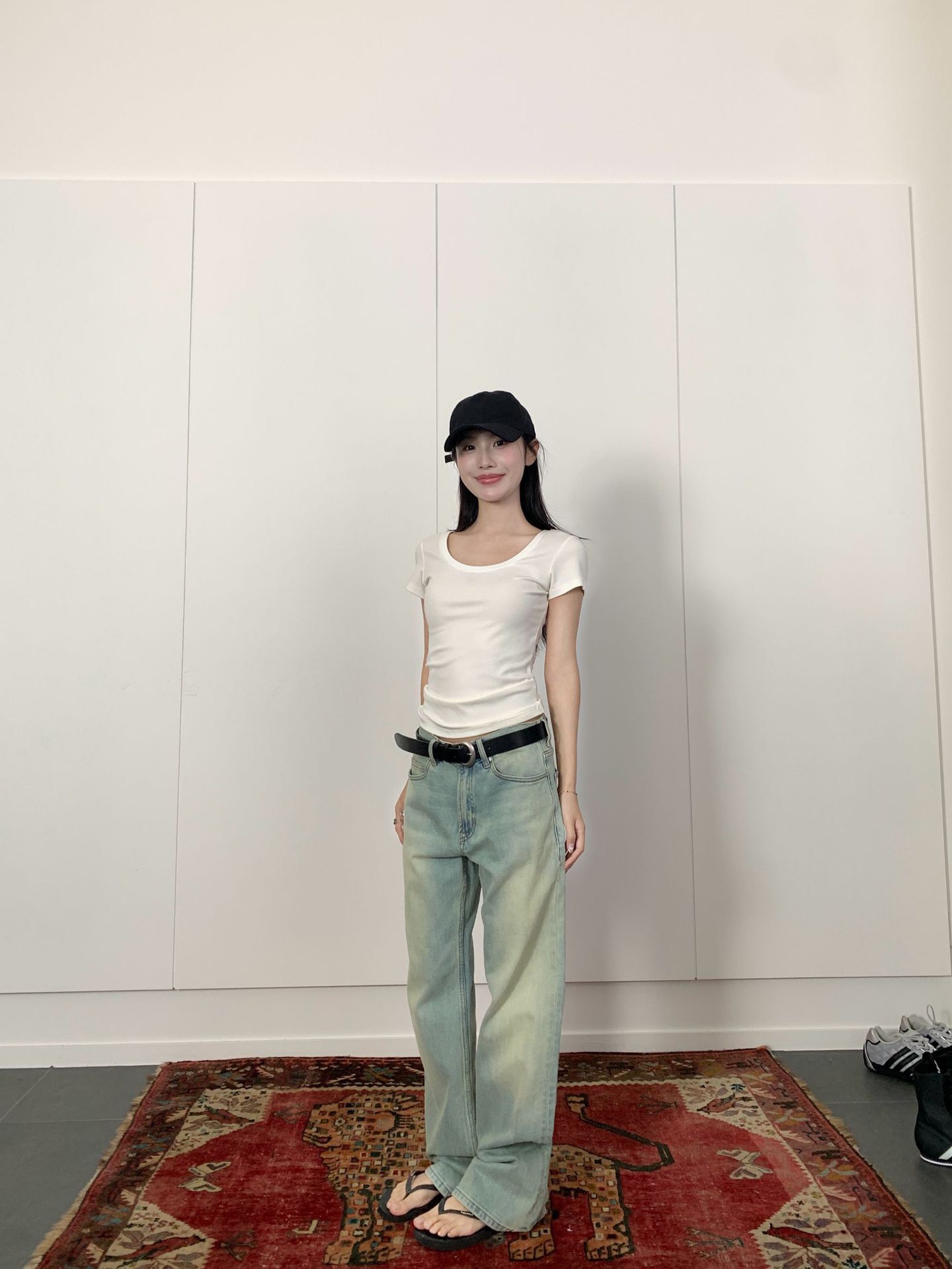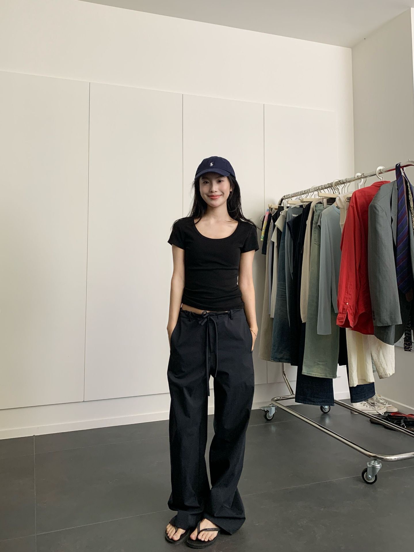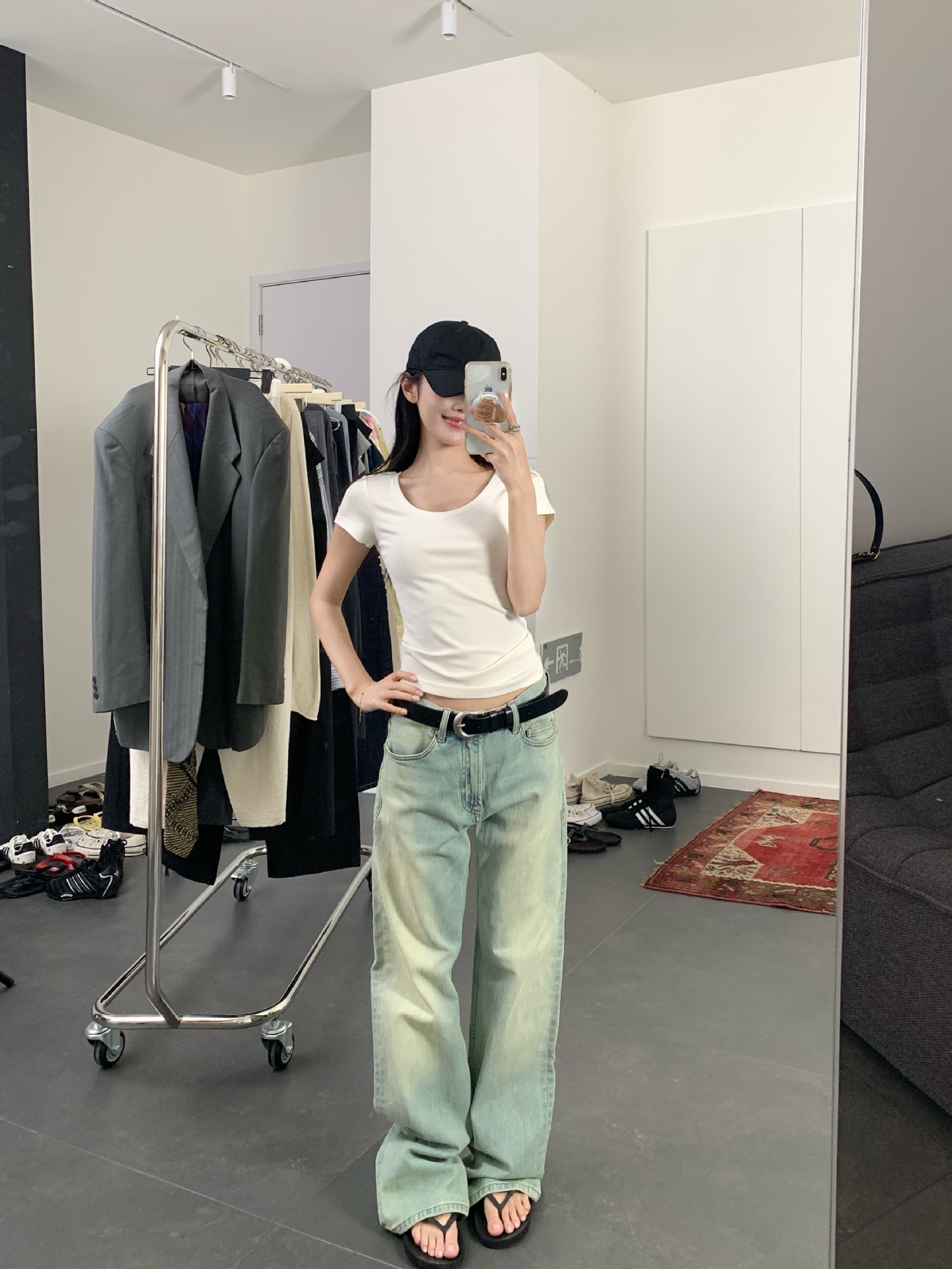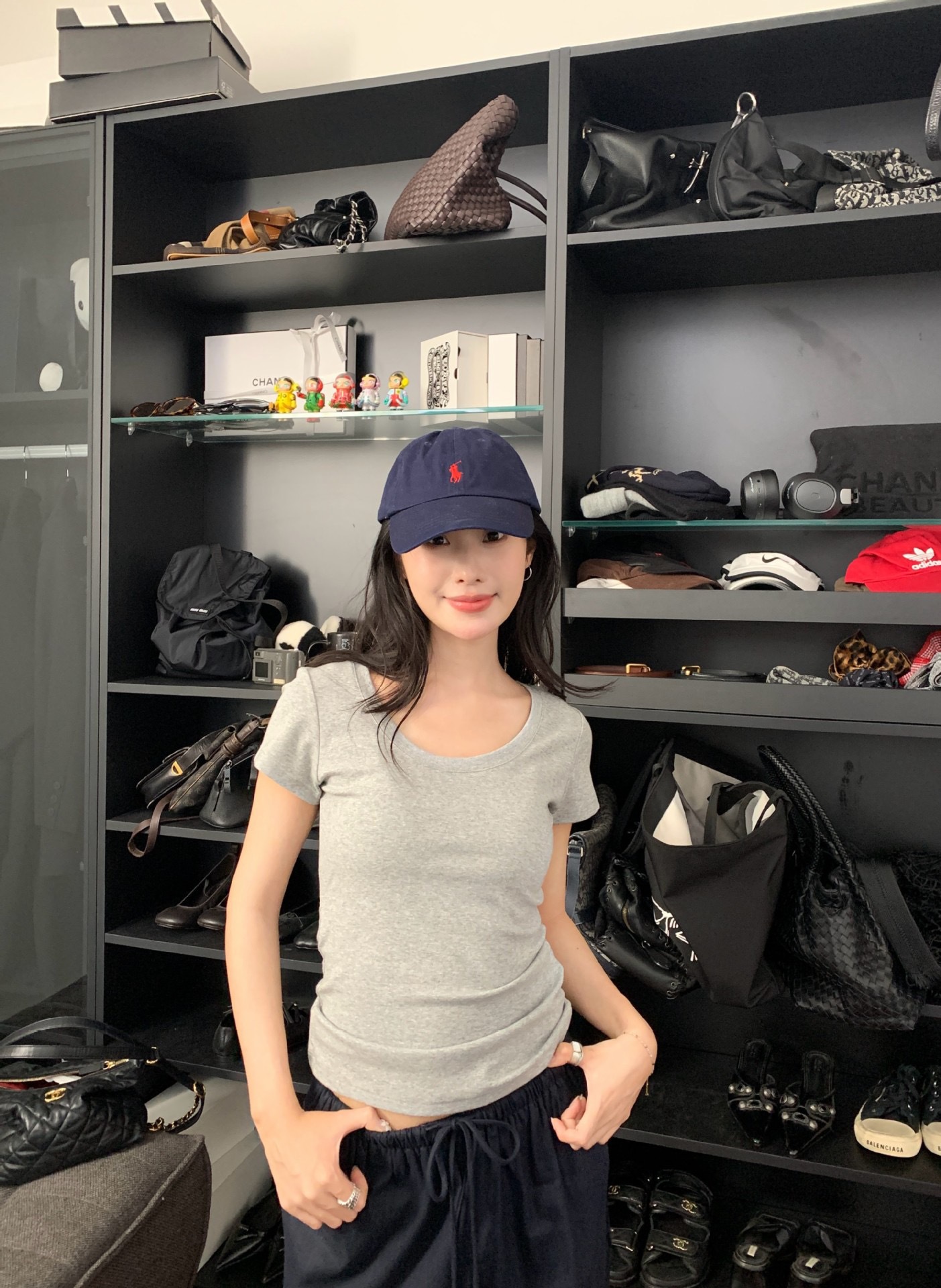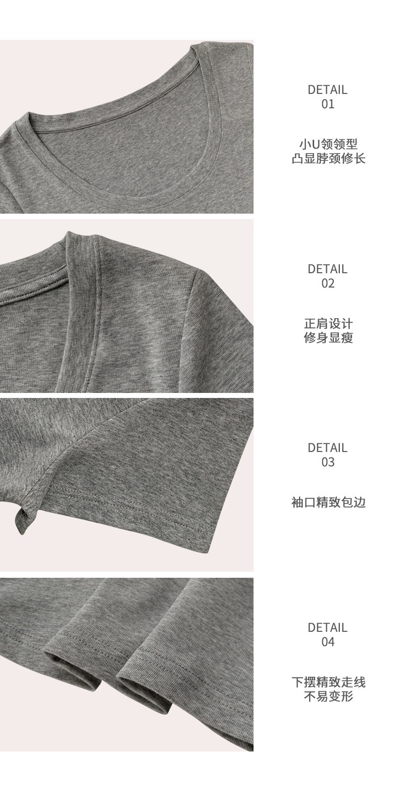 콰이 리 베이직 U 칼라 반팔 티셔츠 여성용 여름 새로운 슬림 핏 슬리밍 스킨 친화적 인 스트레치 어깨 타이트 웨이스트 탑스토어 가기