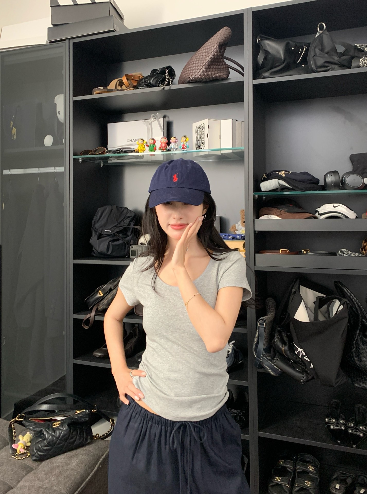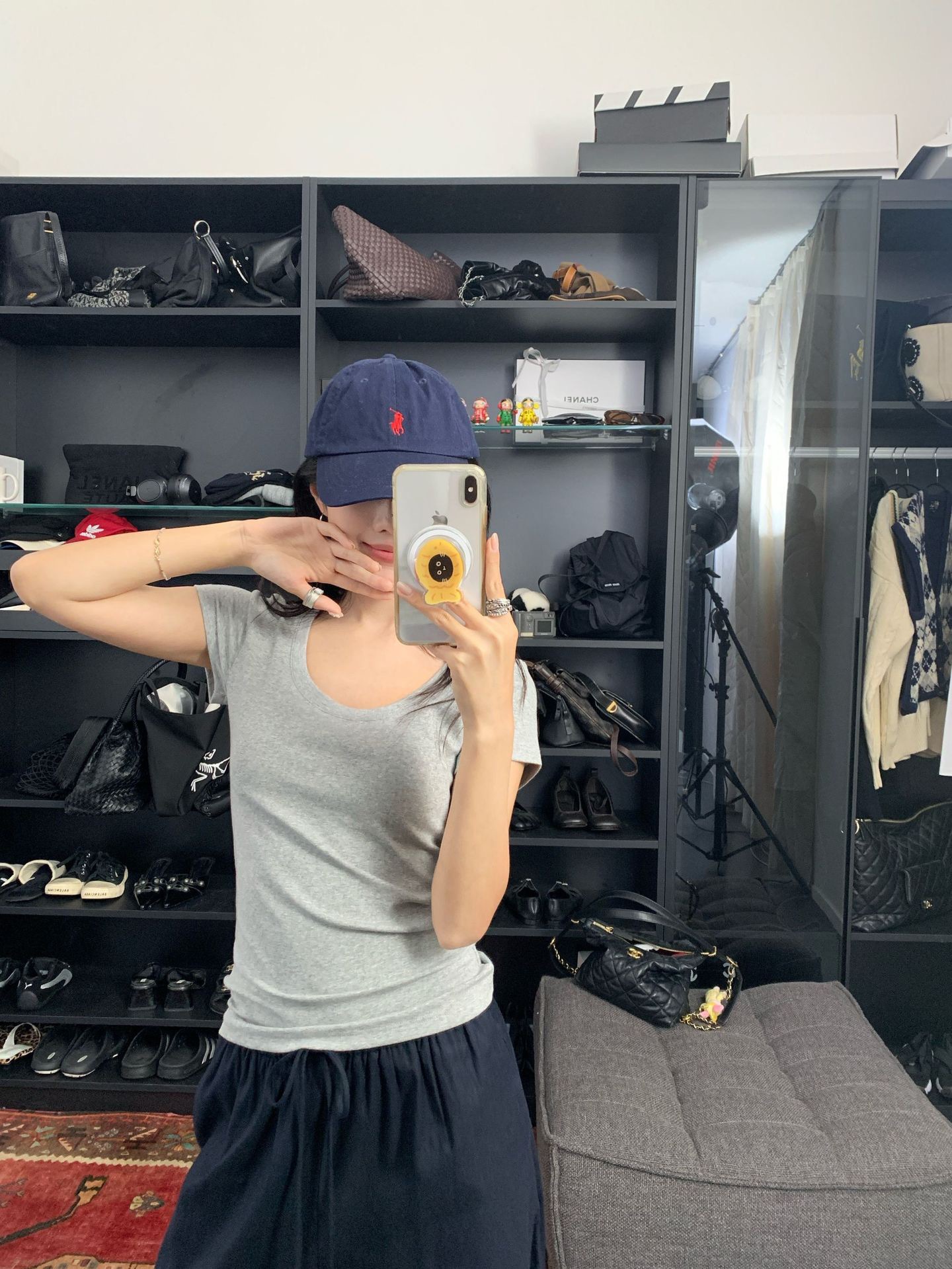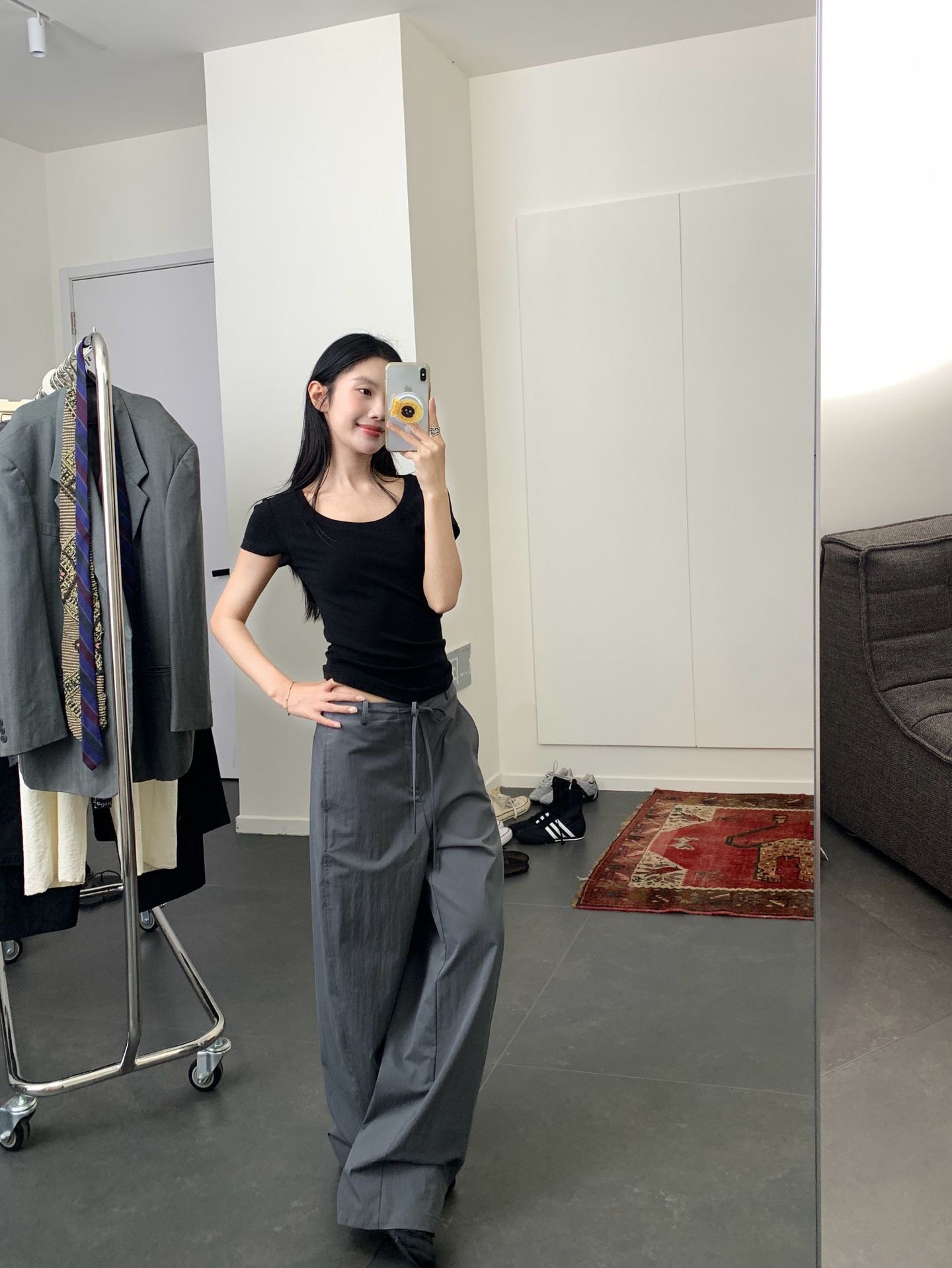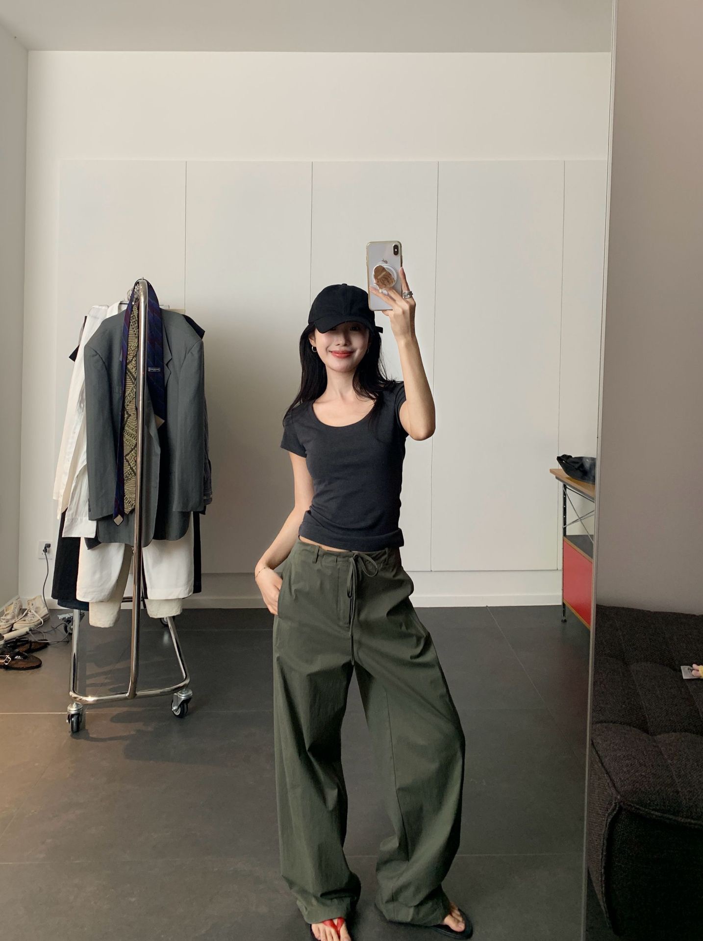 콰이 리 베이직 U 칼라 반팔 티셔츠 여성용 여름 새로운 슬림 핏 슬리밍 스킨 친화적 인 스트레치 어깨 타이트 웨이스트 탑스토어 가기