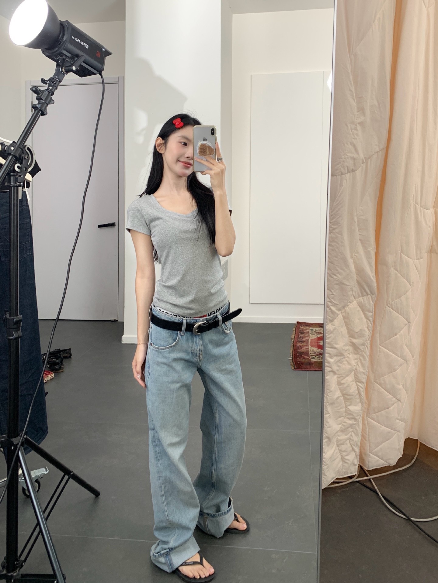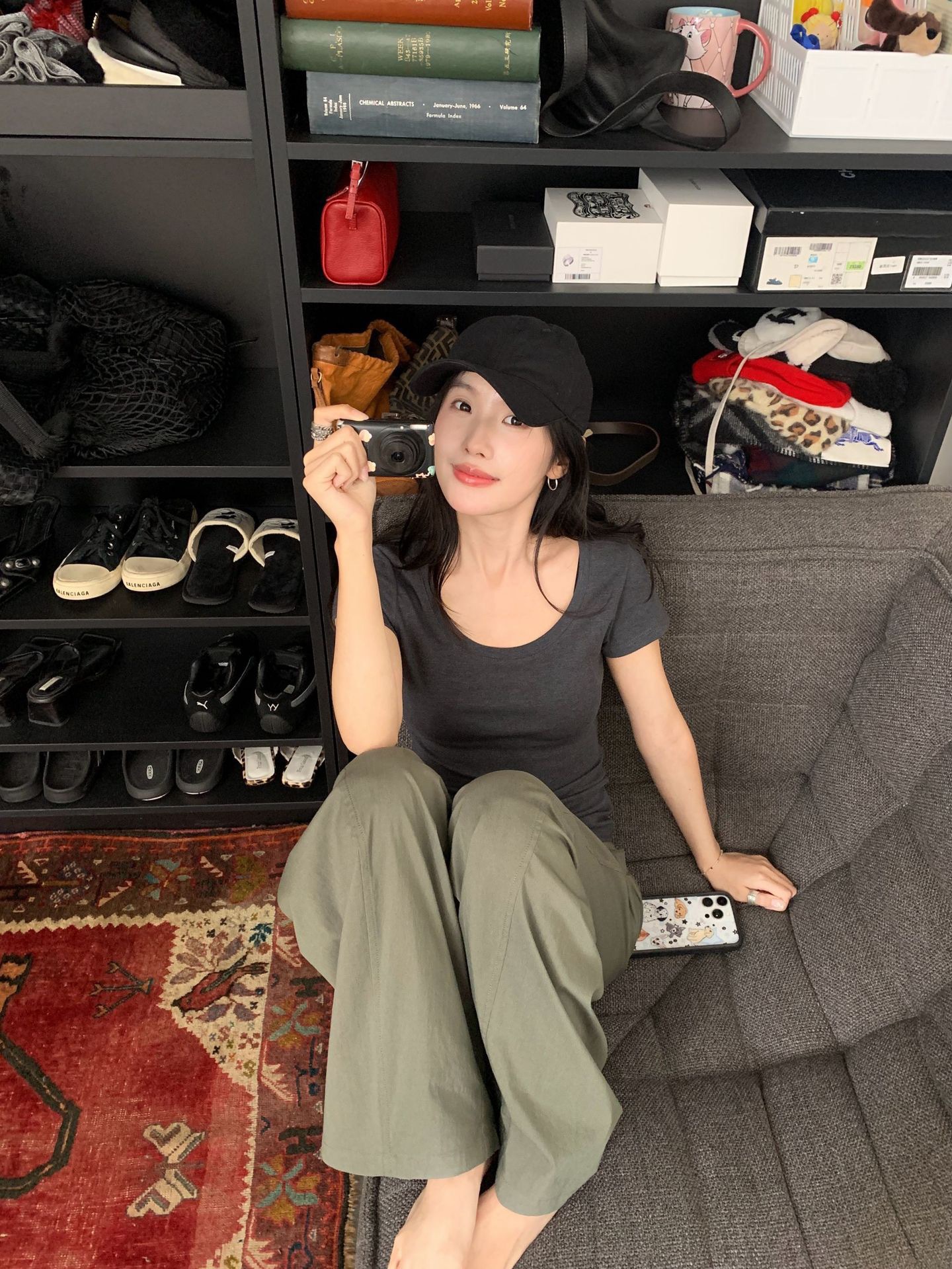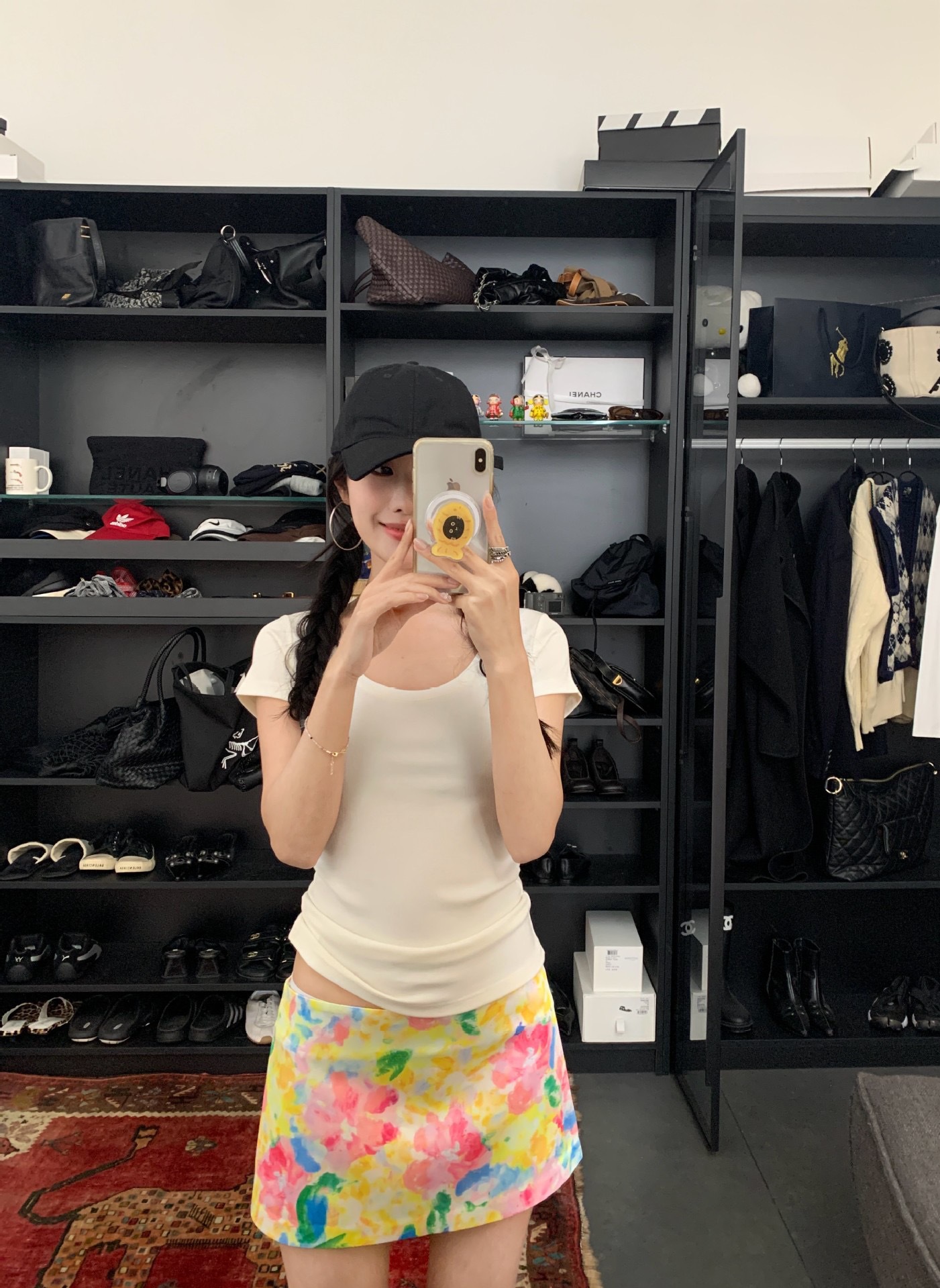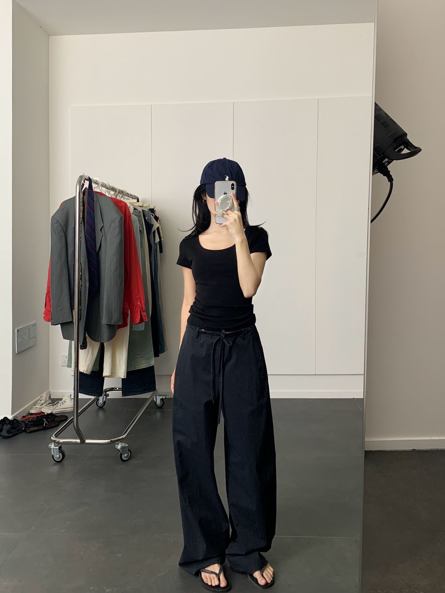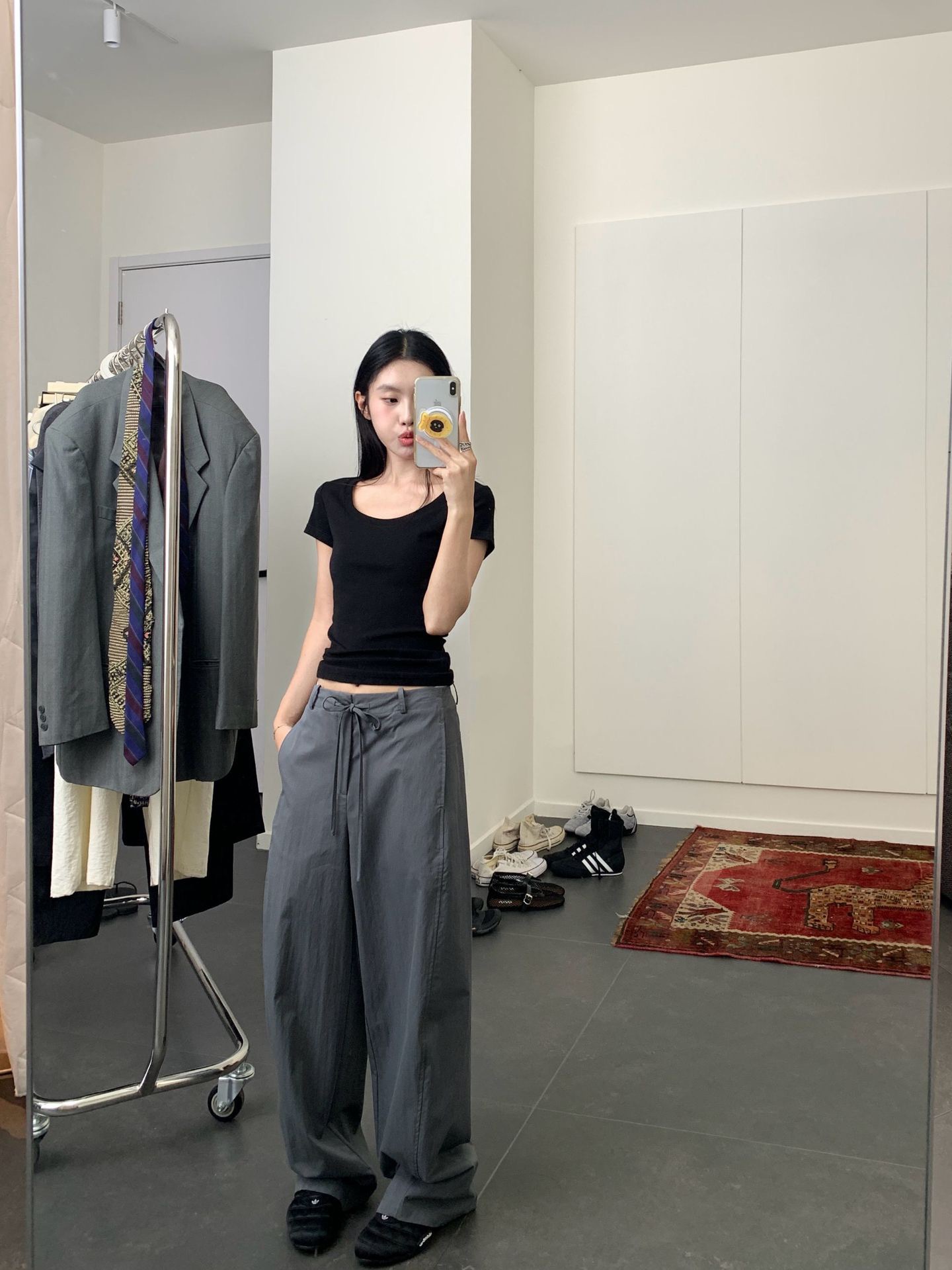 콰이 리 베이직 U 칼라 반팔 티셔츠 여성용 여름 새로운 슬림 핏 슬리밍 스킨 친화적 인 스트레치 어깨 타이트 웨이스트 탑스토어 가기