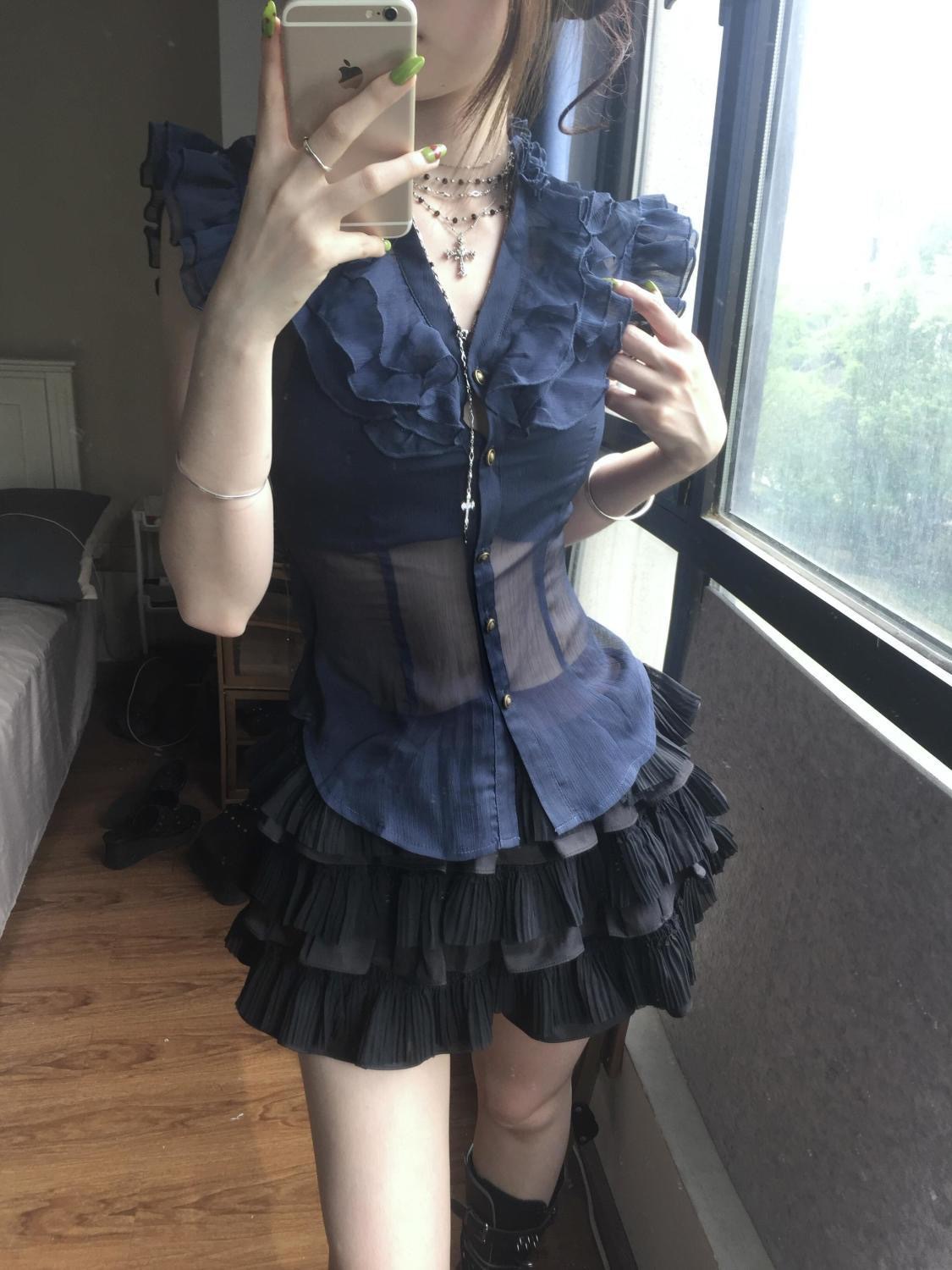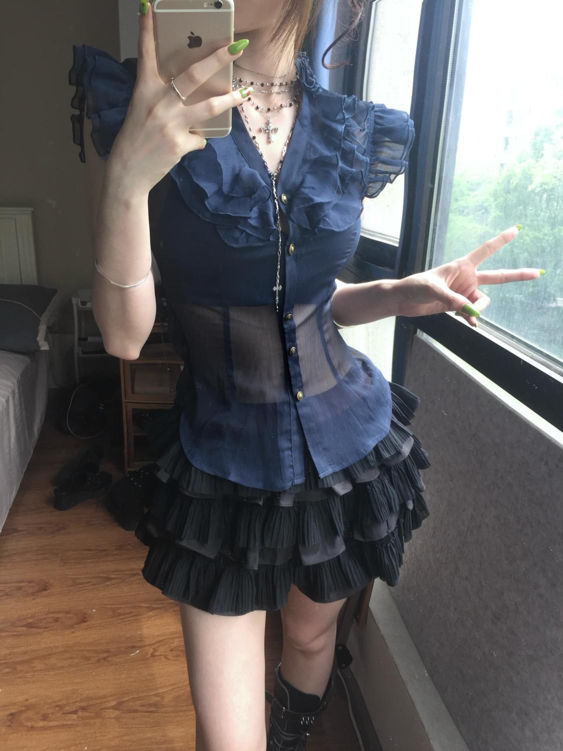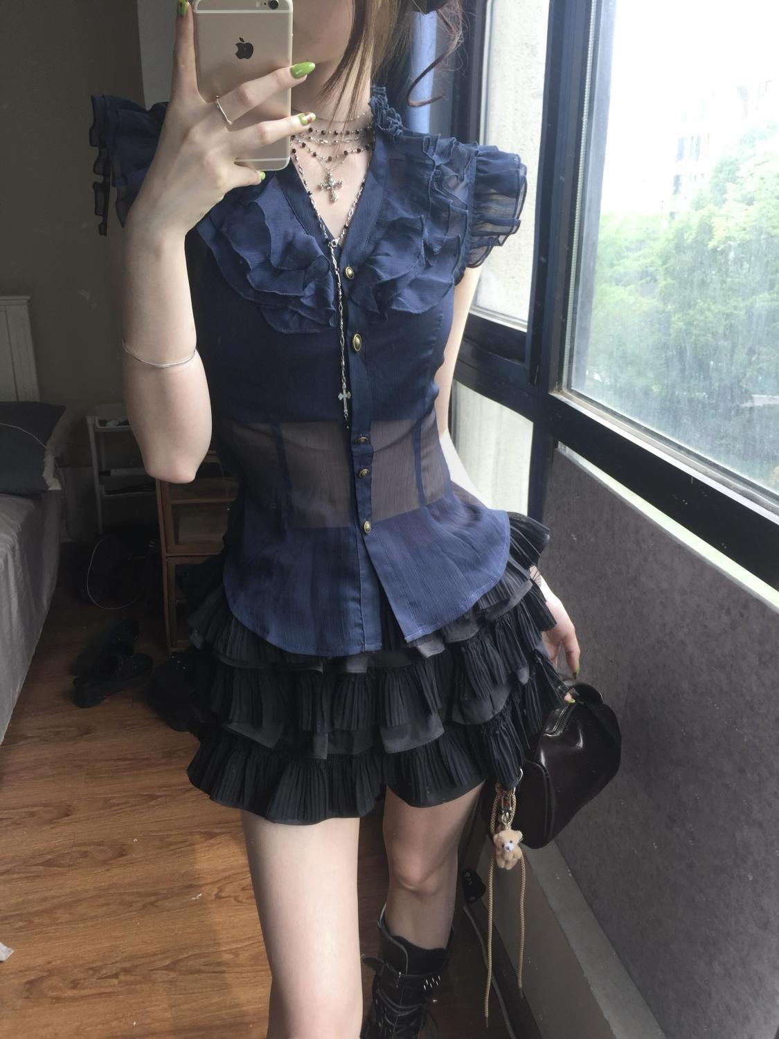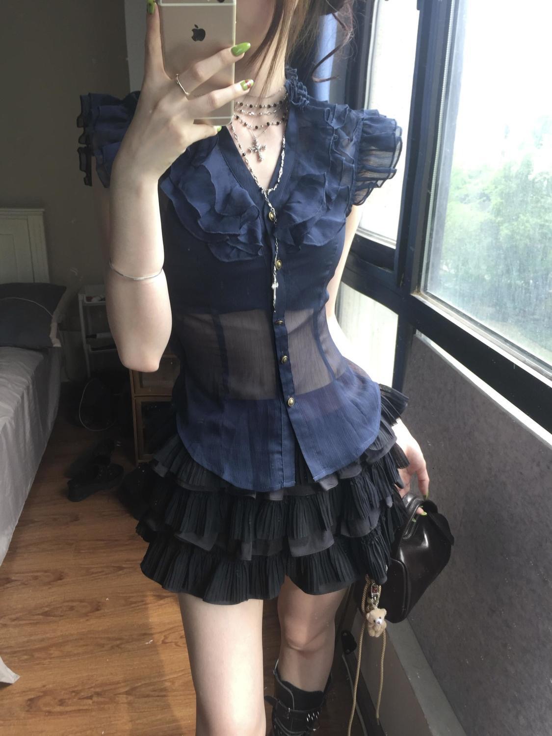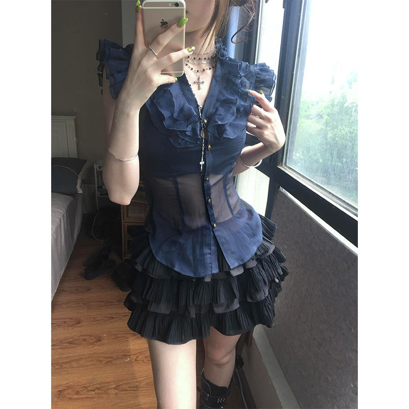 프랑스 러플 마이크로 투명 플라잉 슬리브 셔츠 여성의 여름 2025 새로운 허리 슬리밍 싱글 브레스트 빈티지 탑스토어 가기