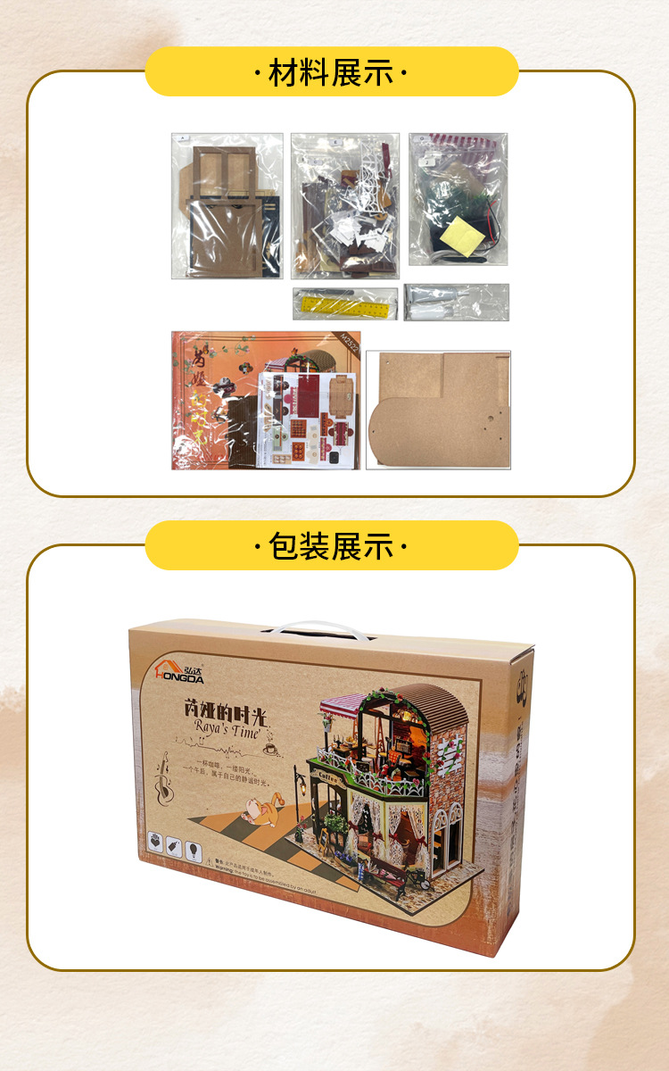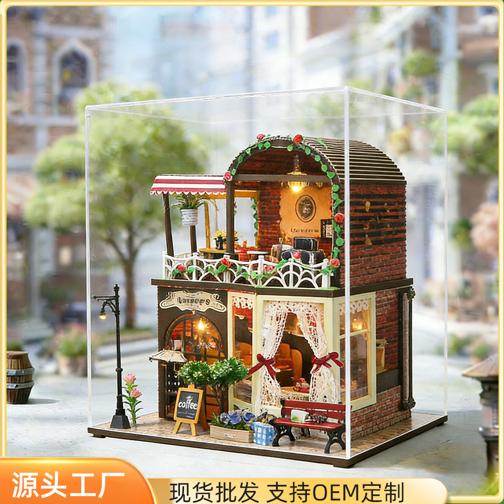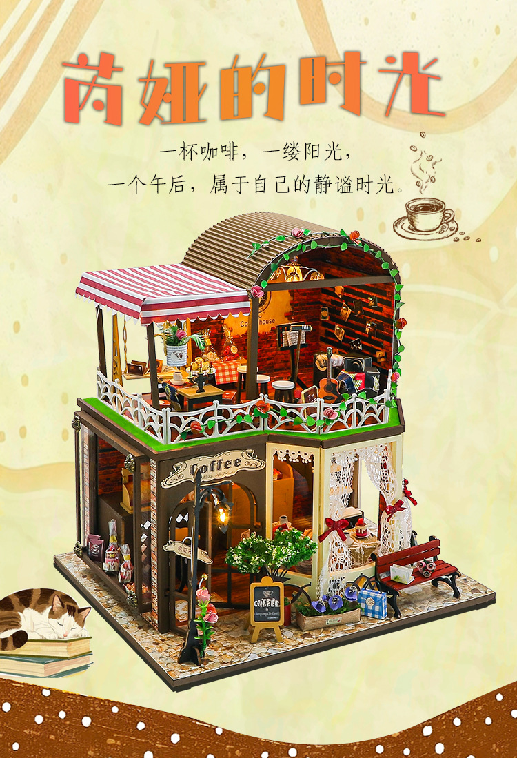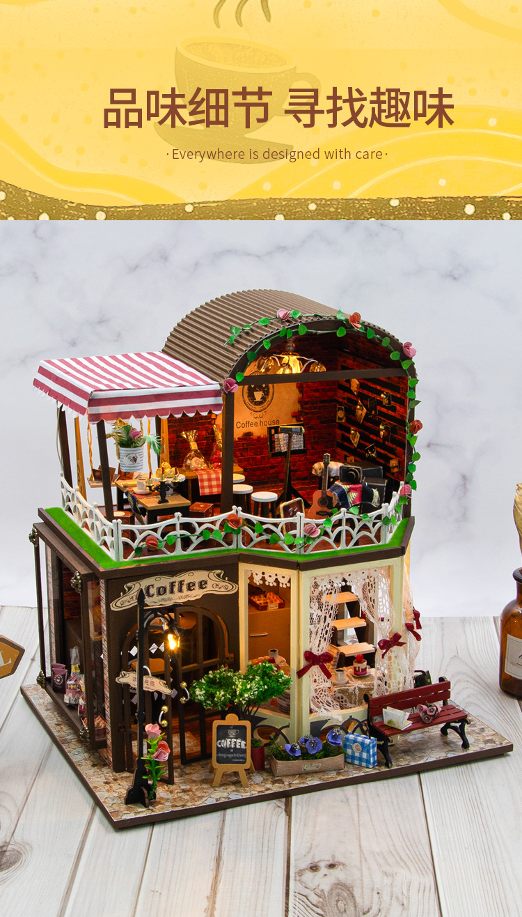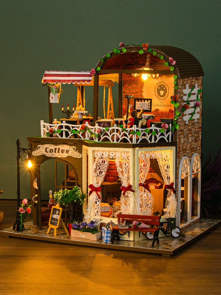 Hongda 선물 diy 수제 나무 인형 집 더블 레이어 커피 복고풍 하우스 미니 3D 건물 조립 모델스토어 가기