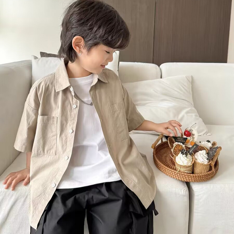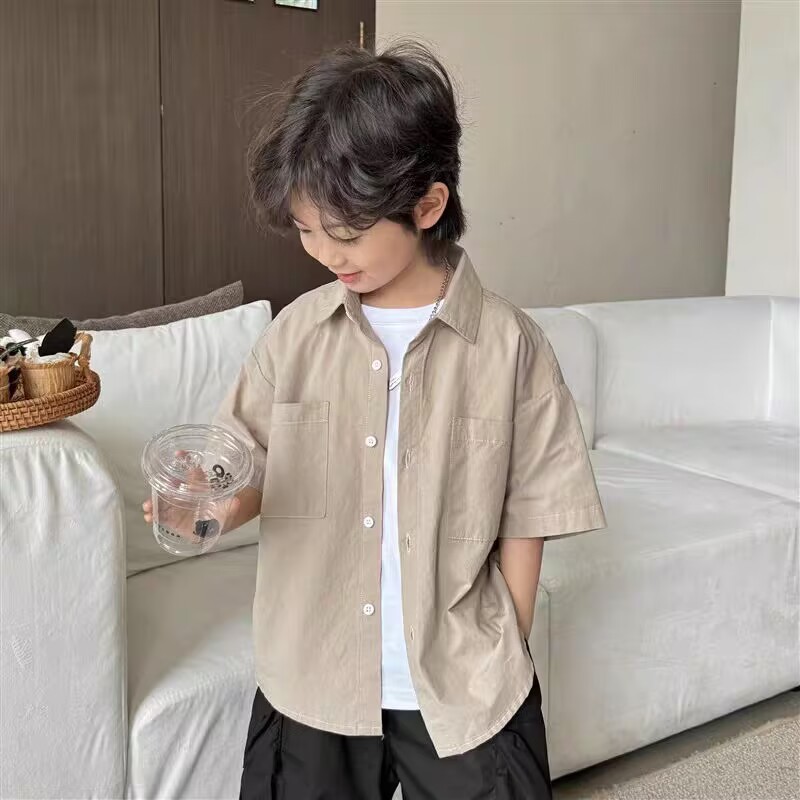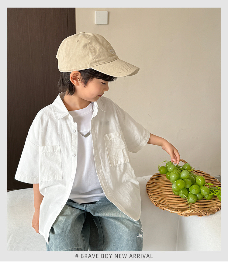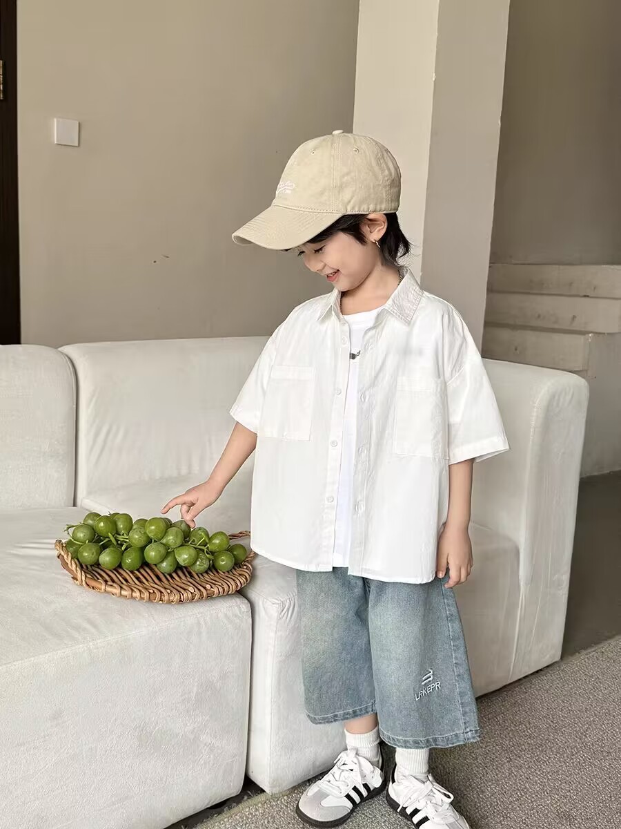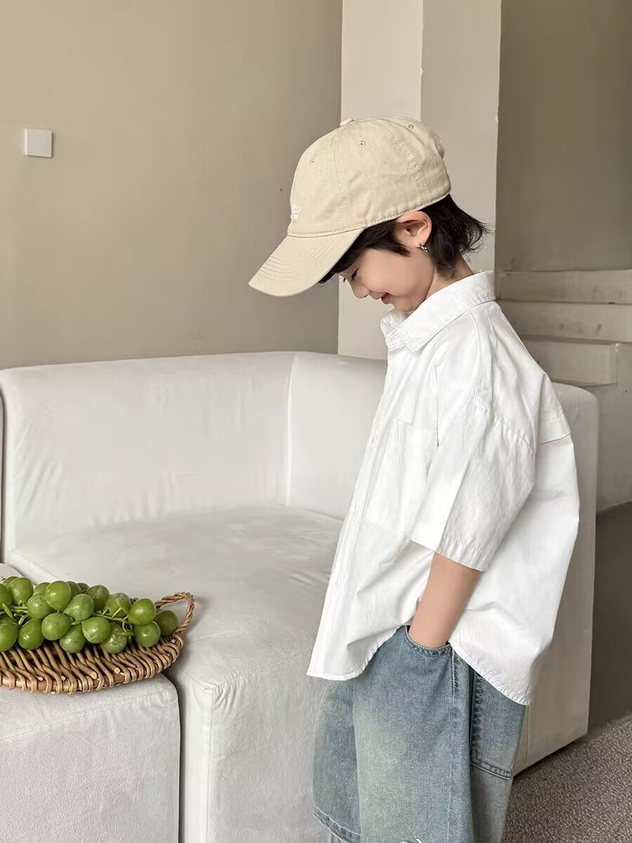 아동용 여름 셔츠 얇은 코트 2025 새로운 스타일 소년 면화 탑 흰색 반팔 셔츠 어린 소년 잘 생긴스토어 가기