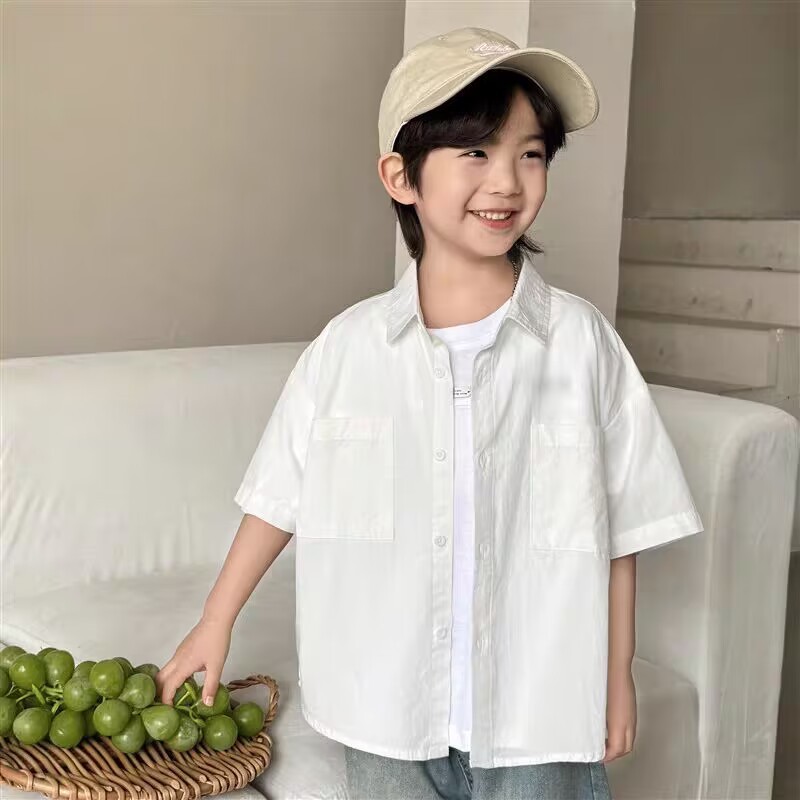 아동용 여름 셔츠 얇은 코트 2025 새로운 스타일 소년 면화 탑 흰색 반팔 셔츠 어린 소년 잘 생긴