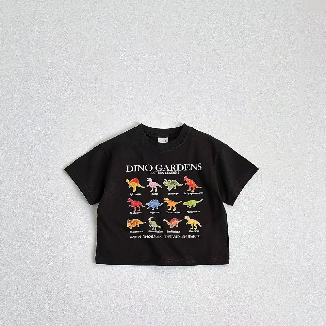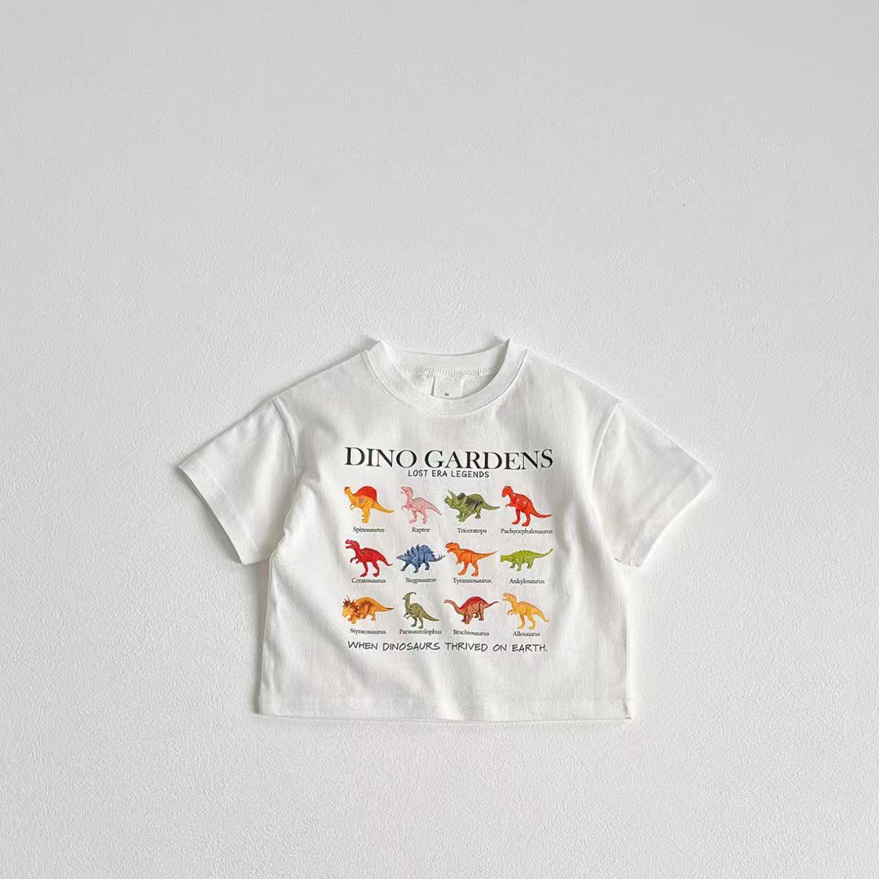 2025 여름 새로운 어린이 발 크기 짧은 소매 티셔츠 화이트 T 최고 소년 캐주얼 패션 공룡 탑스토어 가기