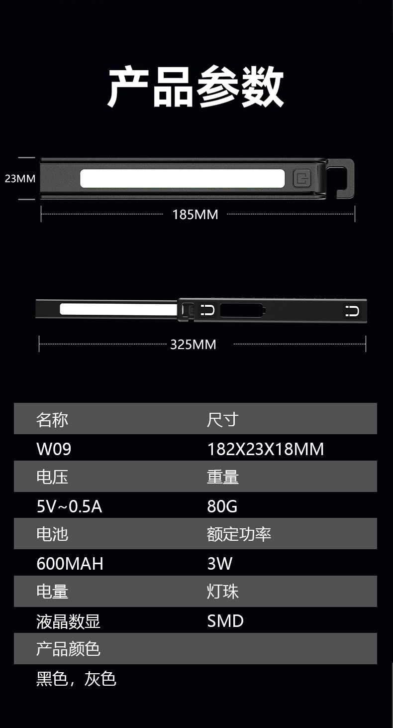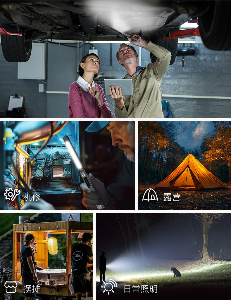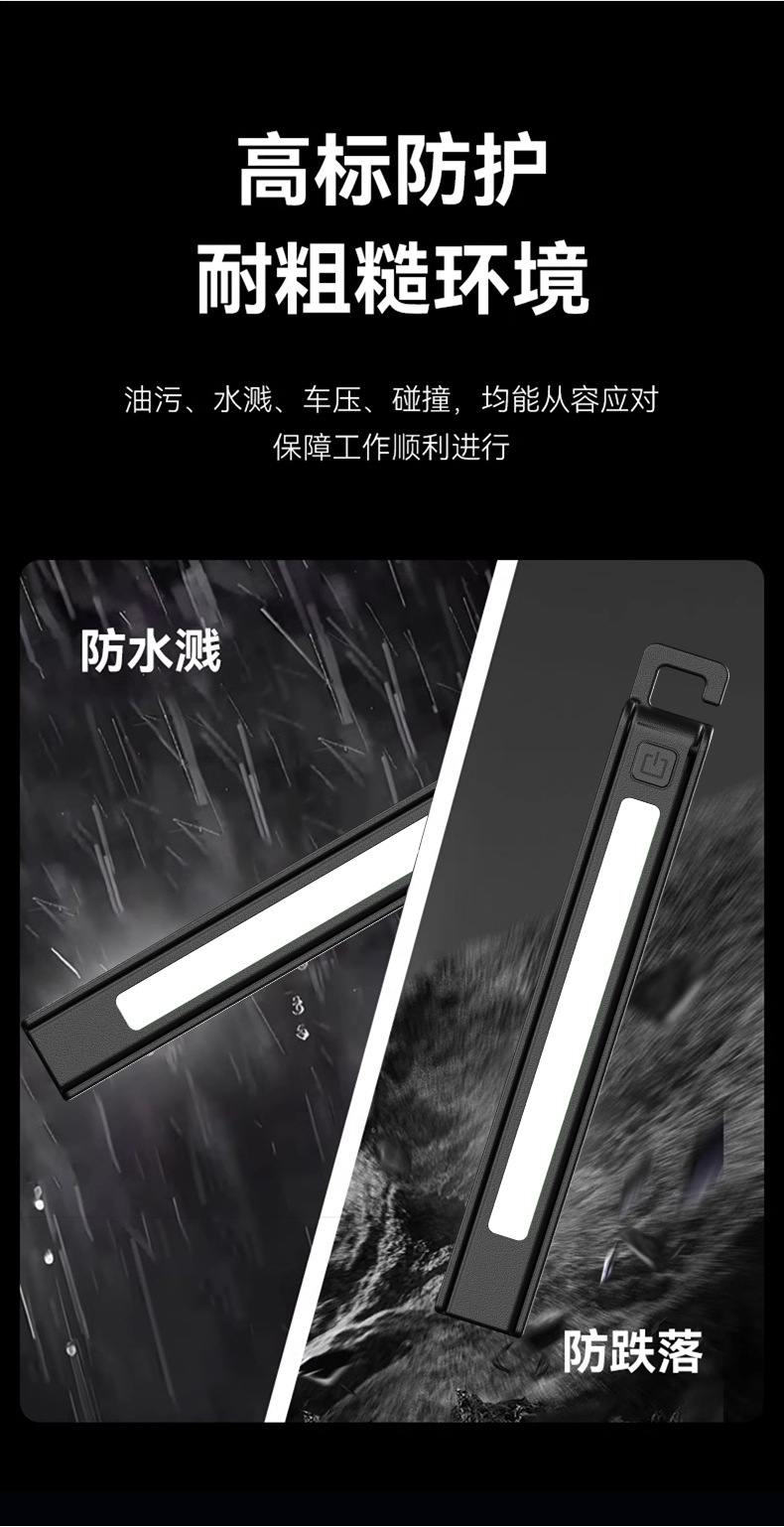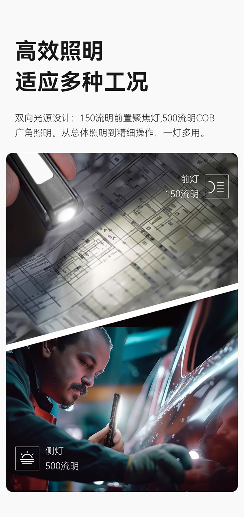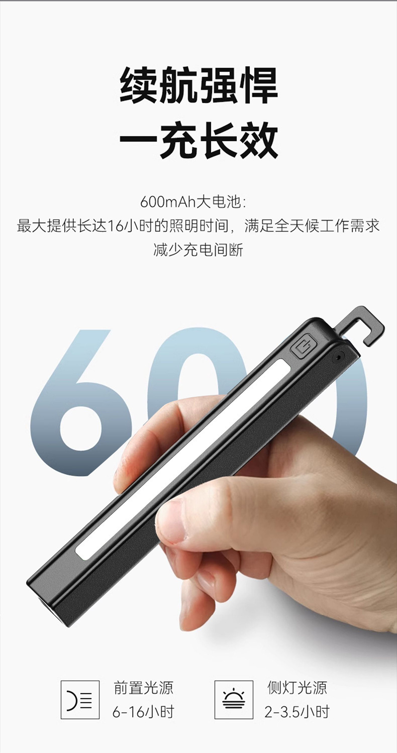 【工作档位】:前灯强光-前灯弱光-侧灯白光-侧灯暖光-侧灯红光-侧灯红光闪