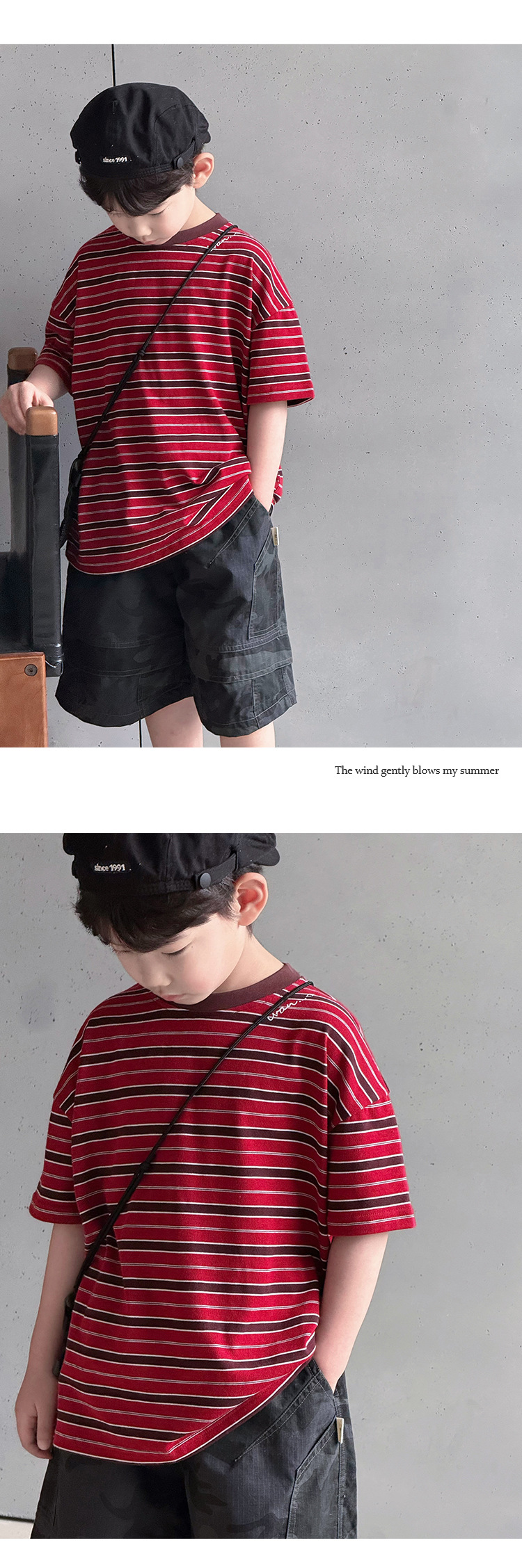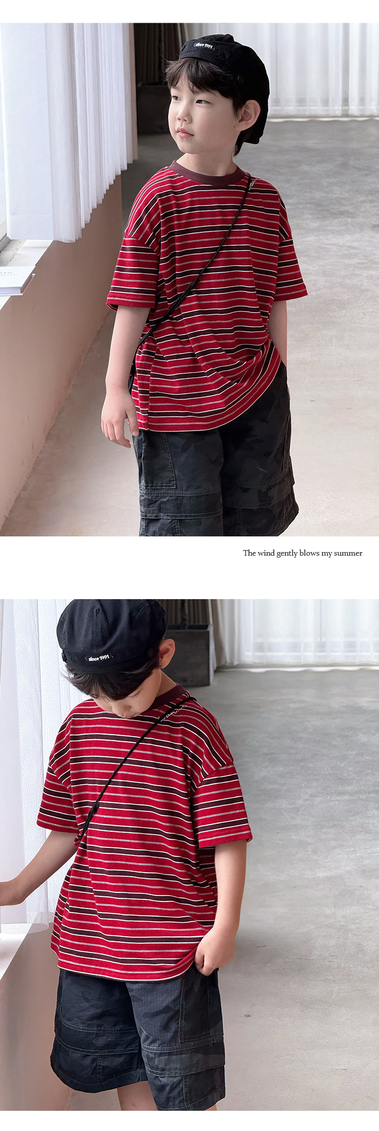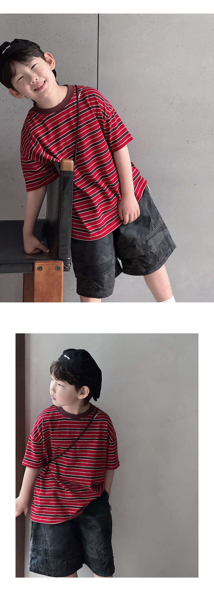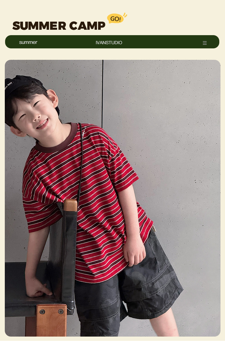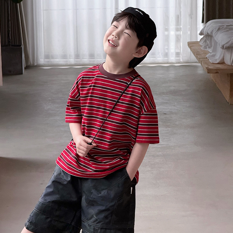 여름 신형 한국식 올매치 중견 어린이 여름착용 스트라이프 반팔 티셔츠 아동복 2025 소년 소녀를위한 트렌디 쿨탑스토어 가기