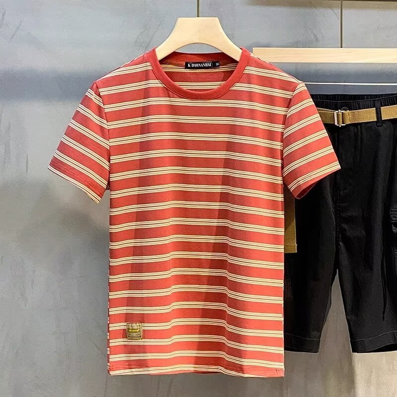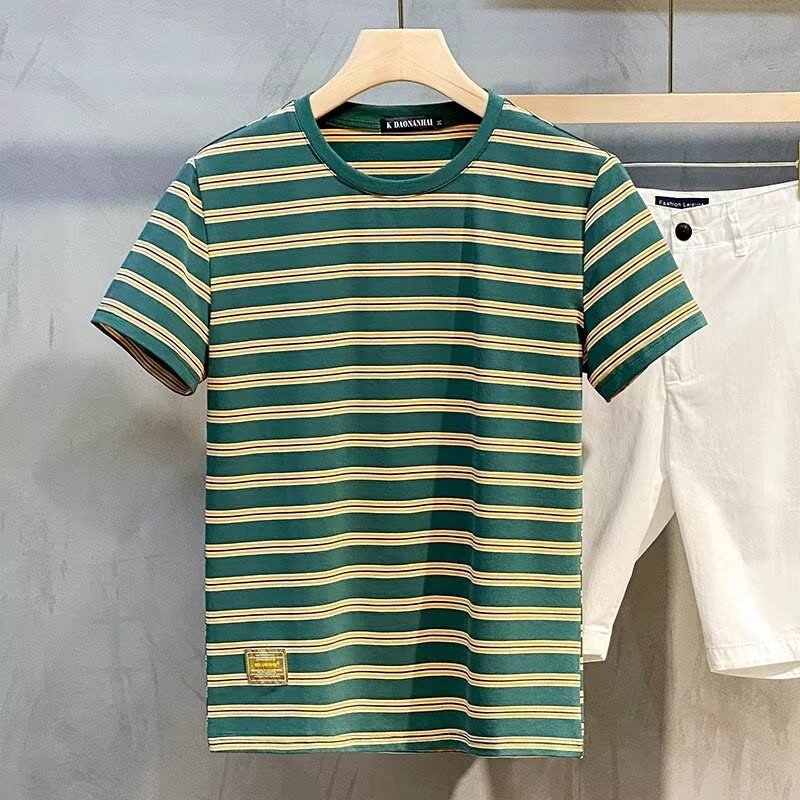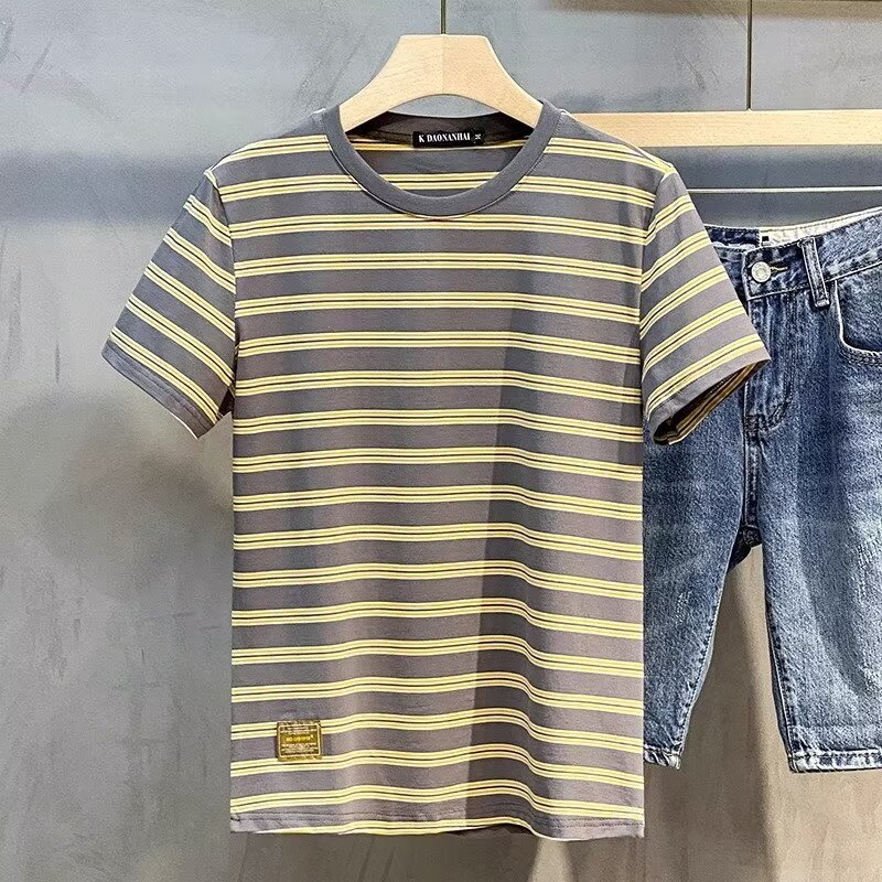 남성용 반팔 티셔츠 2024 여름 신상 하이 엔드 라운드 넥 가로 줄무늬 티셔츠 트렌디 브랜드 반팔 탑