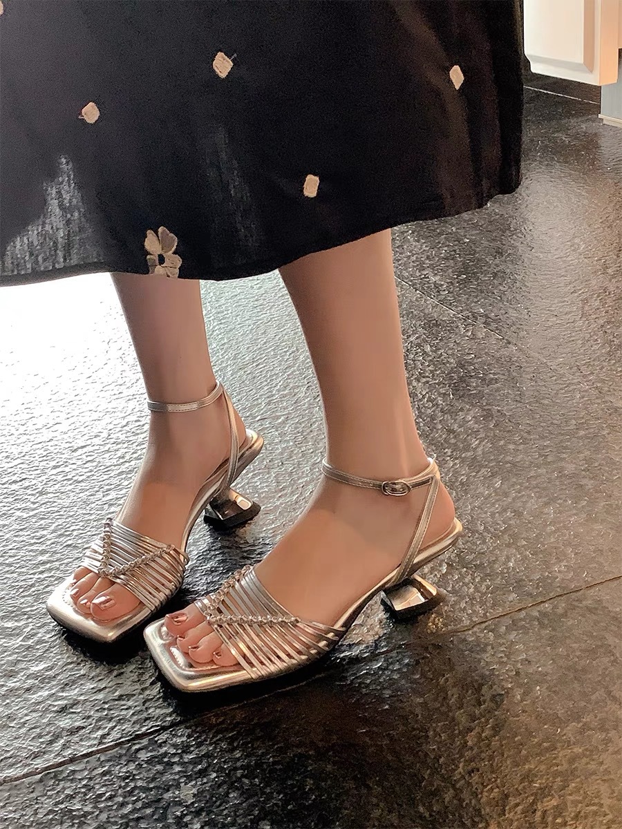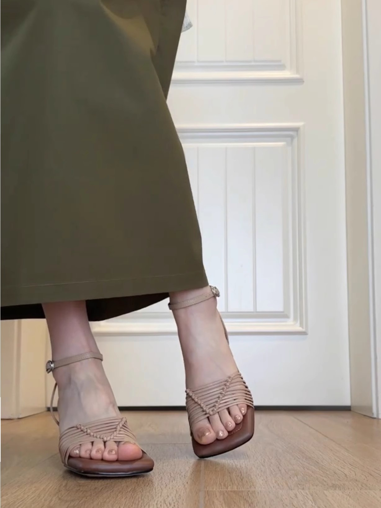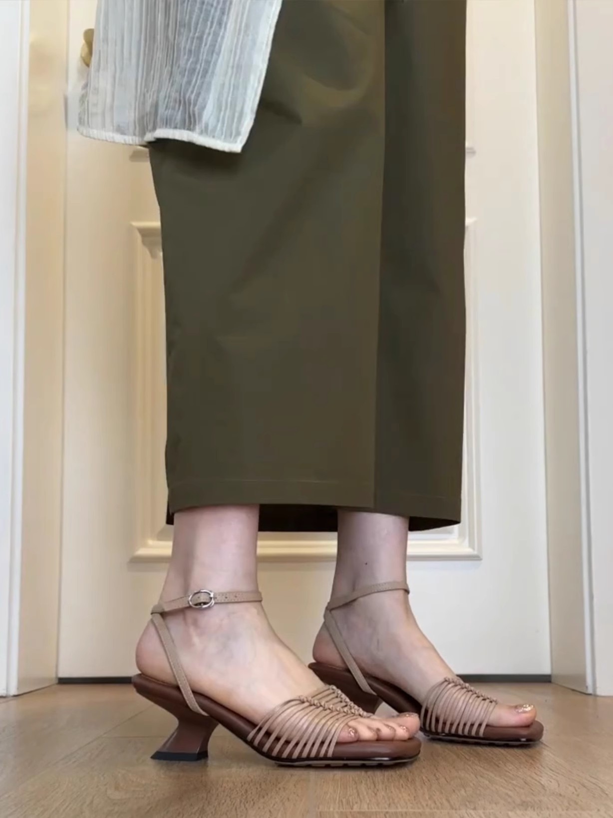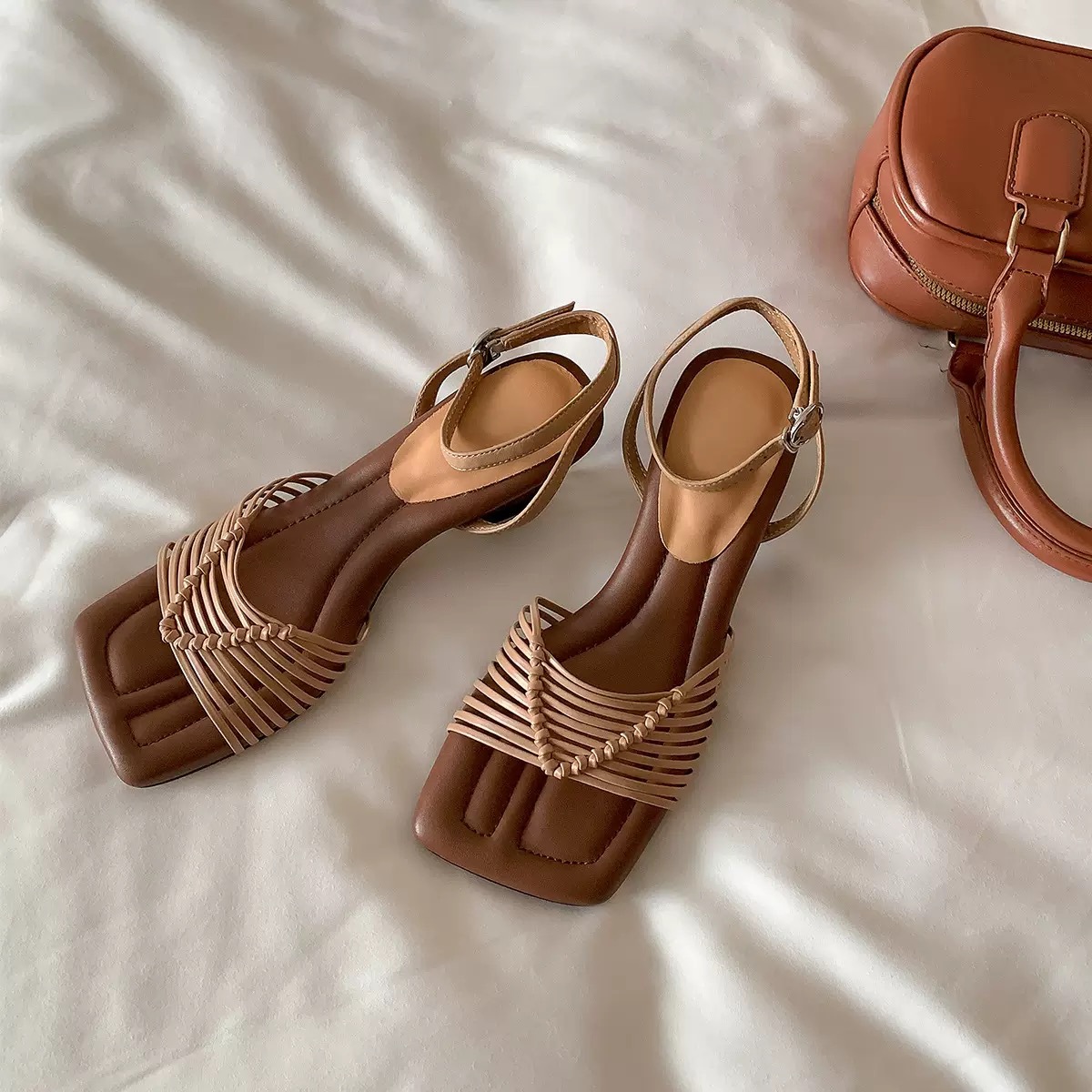 Cowhide 버전 ~ 정품 가죽 프렌치 레트로 짠 할로우 샌들 여성용 여름 아웃웨어 아름다운 하이힐 로마 신발스토어 가기