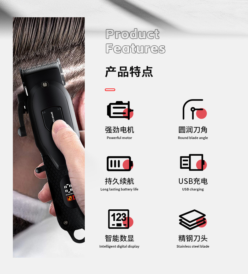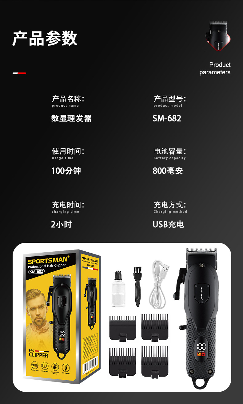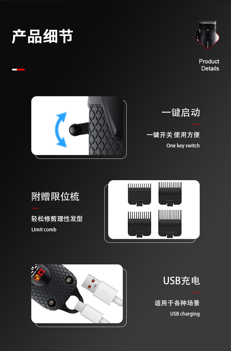 套装内含:理发器主机一个,限位梳4个,1.5,3.5,4.5,5.5mm,USB充电线,清洁刷,润滑油,英文说明书