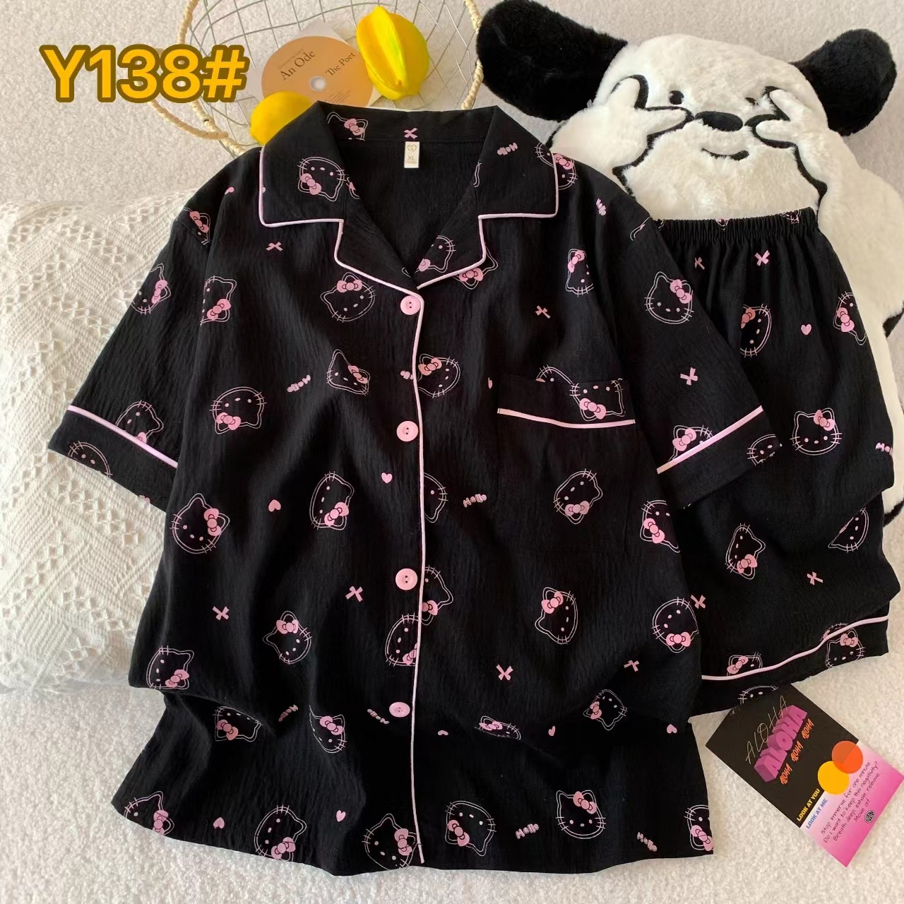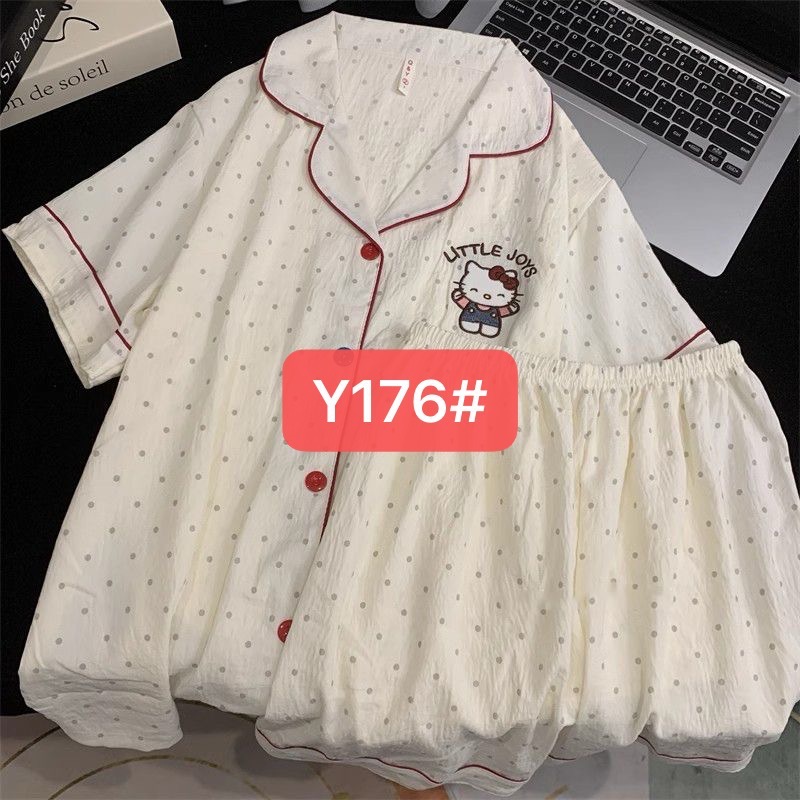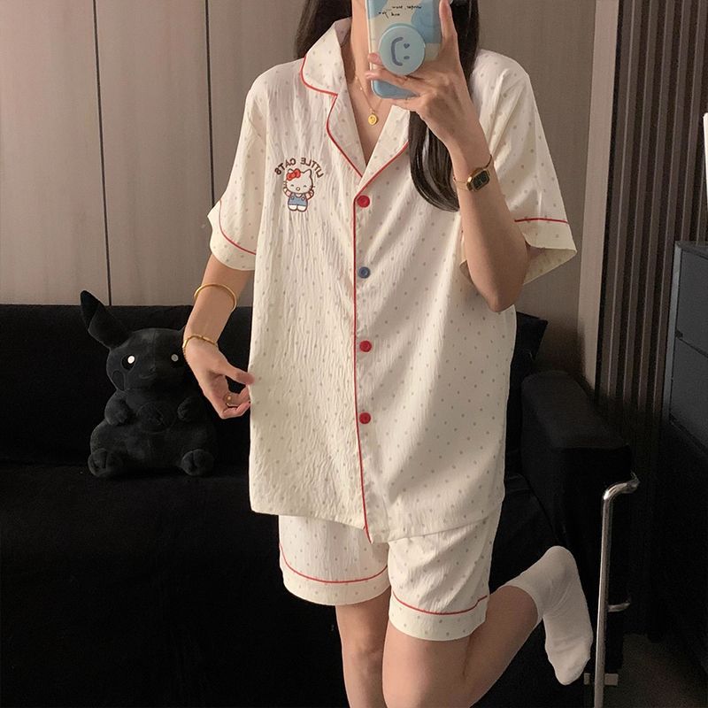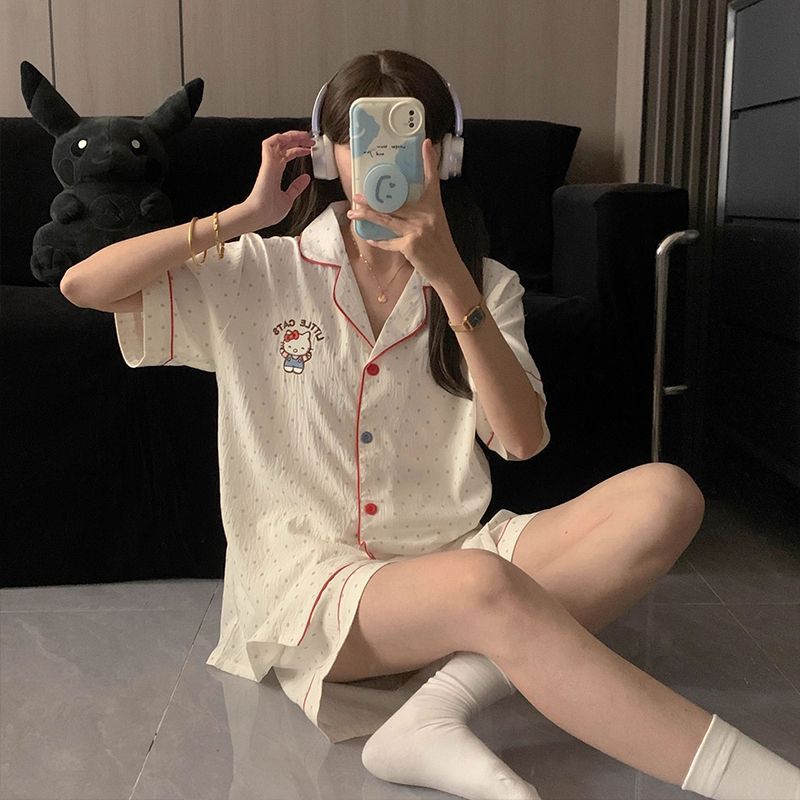 도트 KT 고양이 구름면 반팔 투피스 세트 파자마 여성 여름 새 한국 스타일 2025 카디건 홈 의류스토어 가기