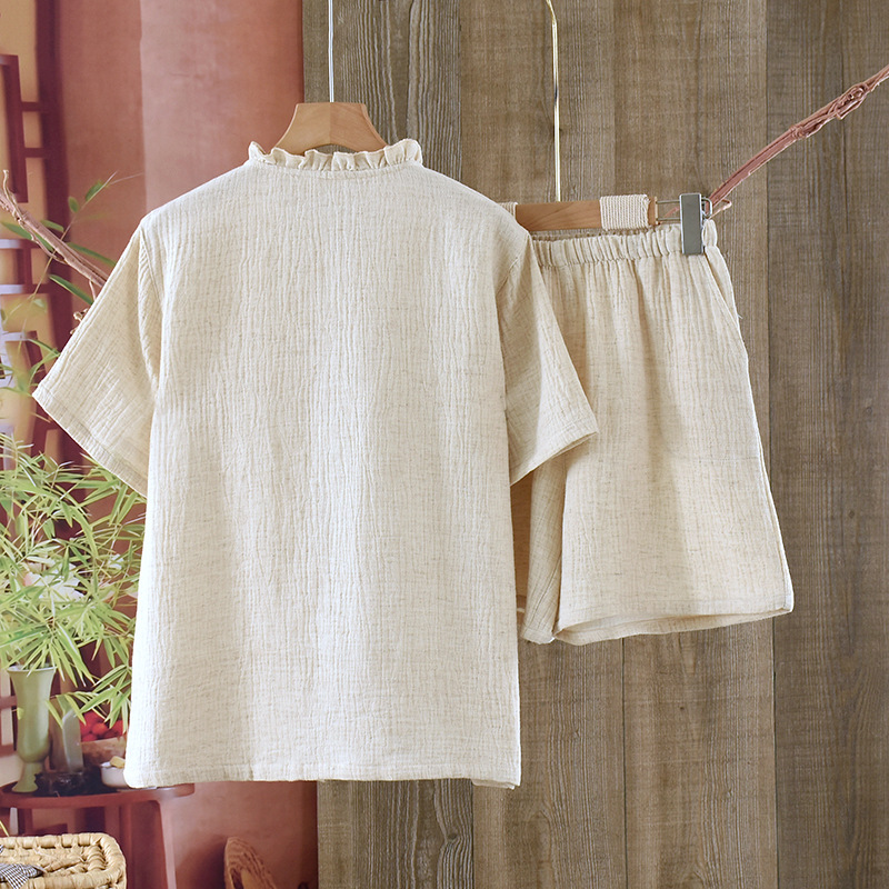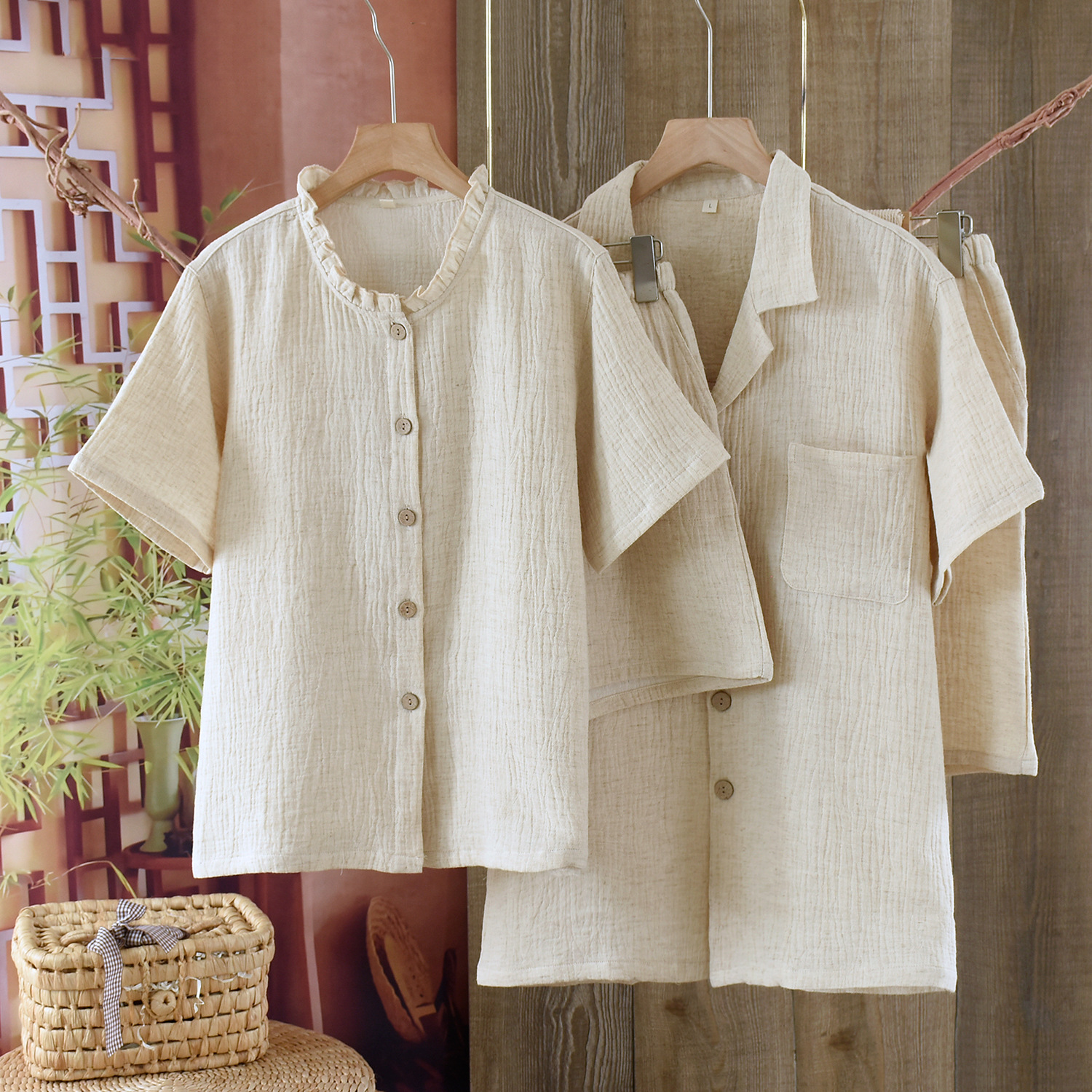 Wuyin Fengfeng 봄과 여름 커플 얇은 세트 캐주얼 간단한 짧은 소매 반바지 남성과 여성의 잠옷 리넨 홈 옷