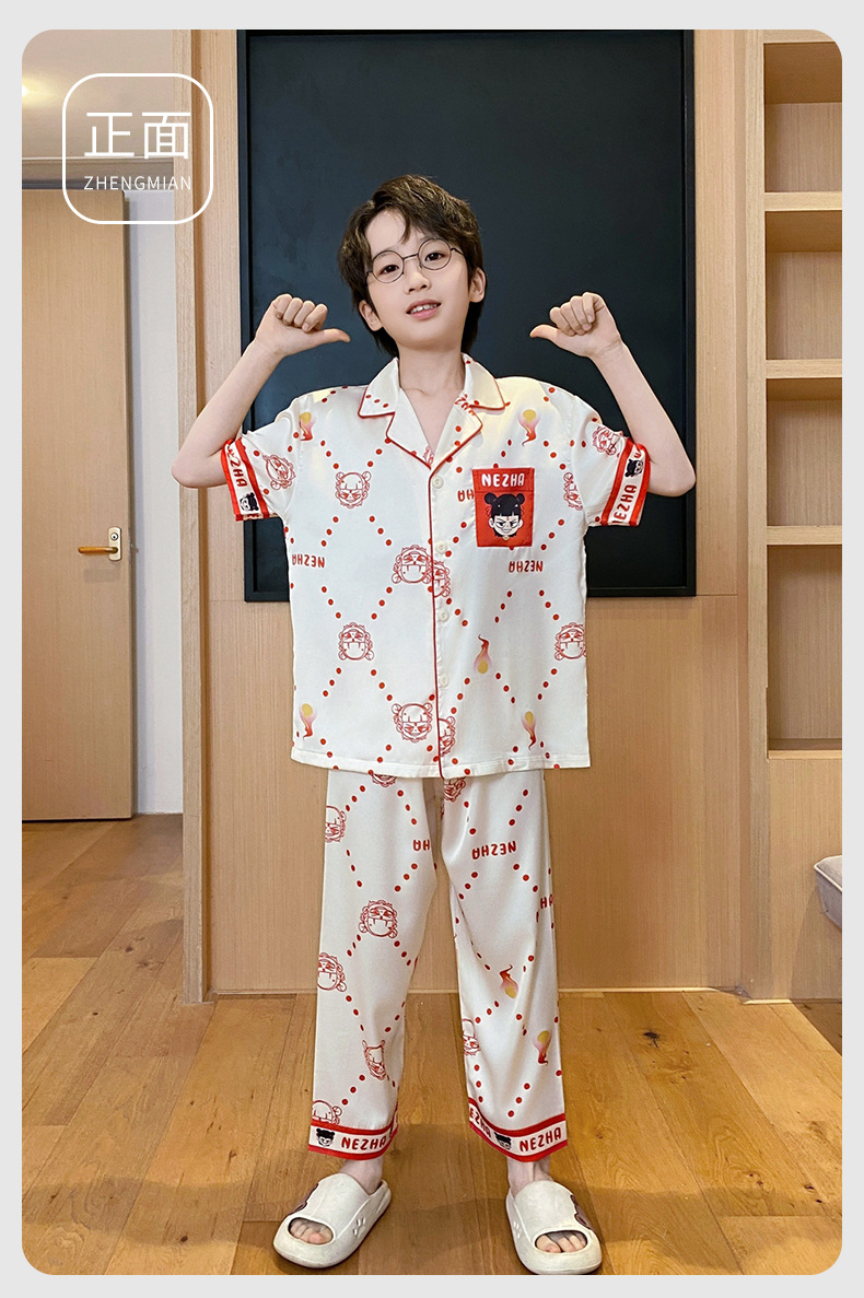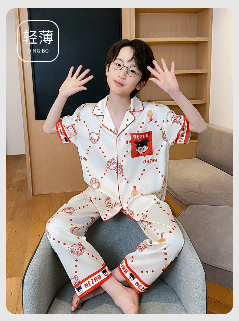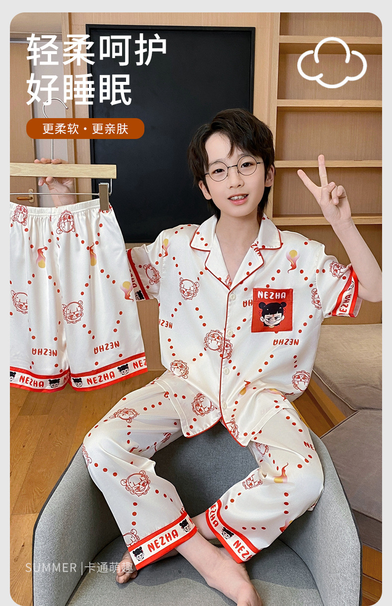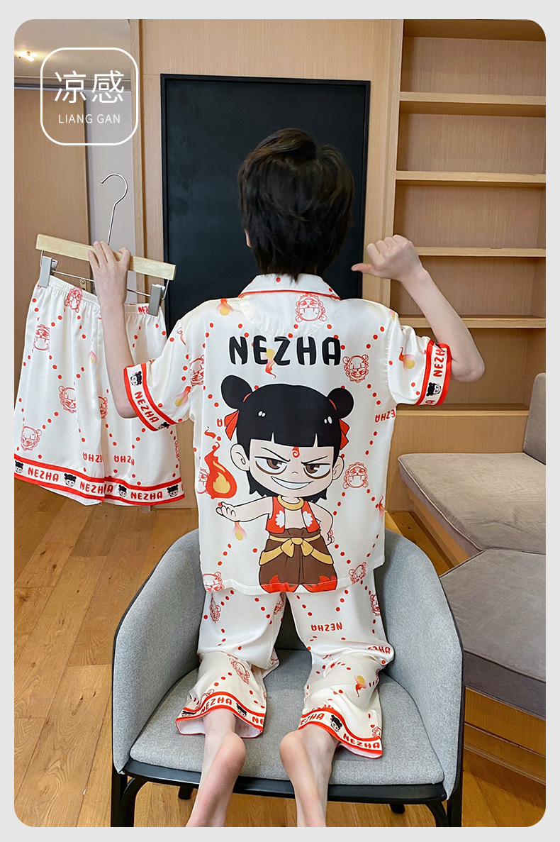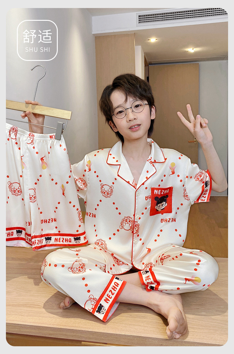 어린이 잠옷 소년 얇은 여름 얼음 실크 어린 소년 큰 어린이 실크 3 피스 세트 Nezha 2025 새로운 여름