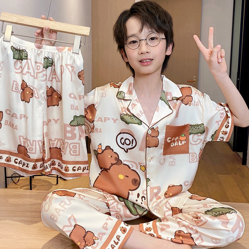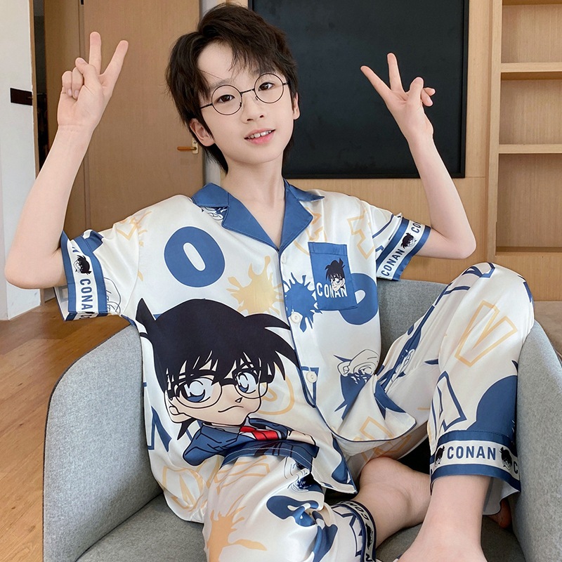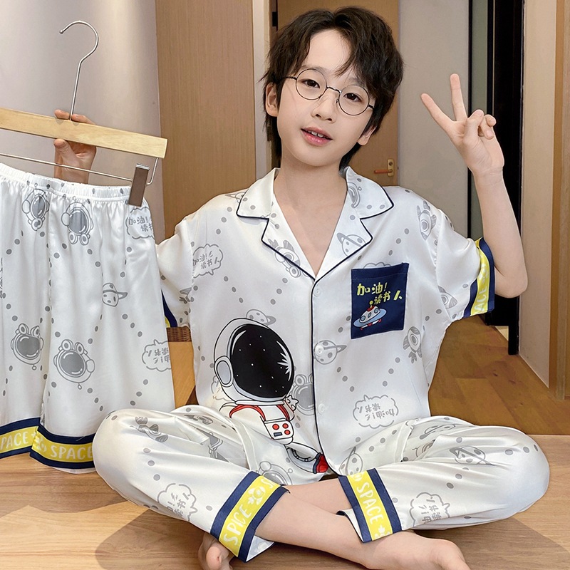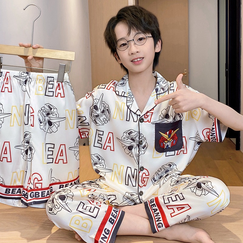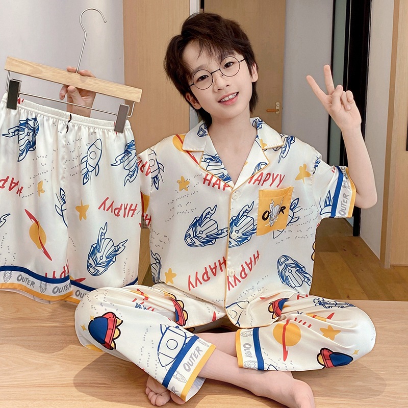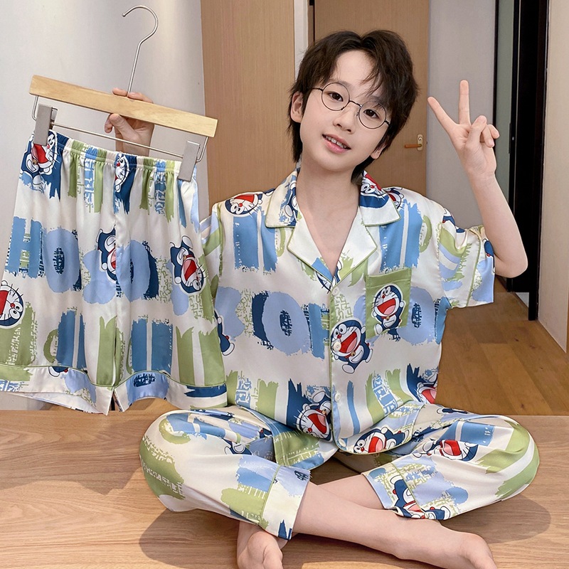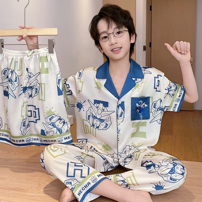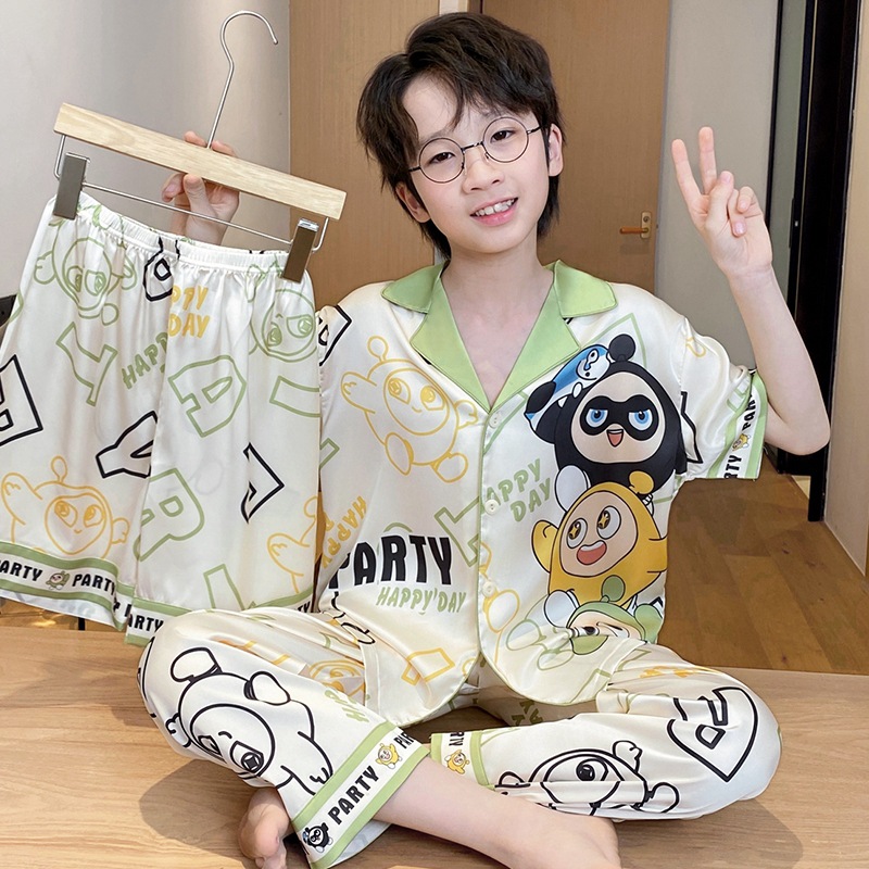 어린이 잠옷 소년 얇은 여름 얼음 실크 어린 소년 큰 어린이 실크 3 피스 세트 Nezha 2025 새로운 여름