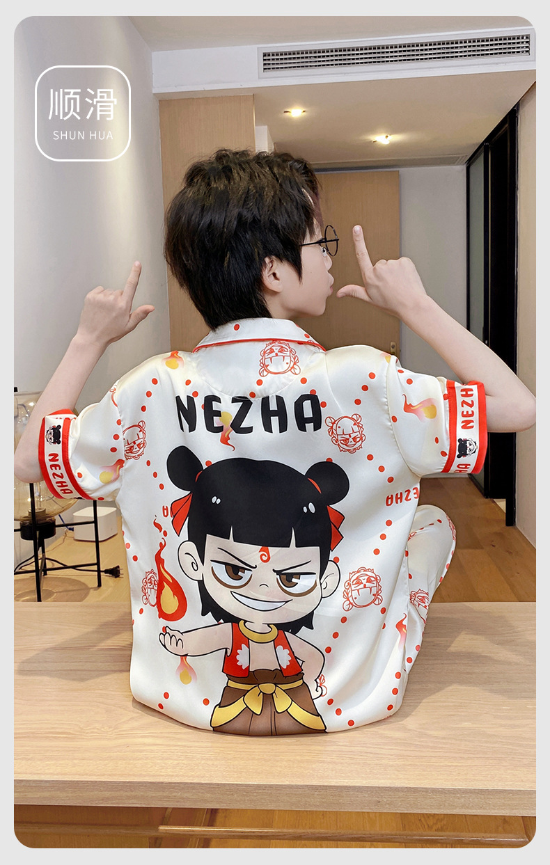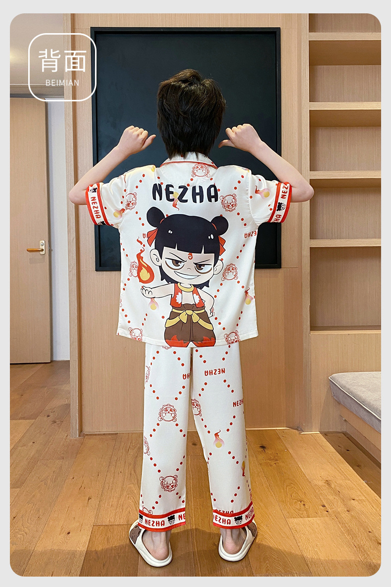어린이 잠옷 소년 얇은 여름 얼음 실크 어린 소년 큰 어린이 실크 3 피스 세트 Nezha 2025 새로운 여름스토어 가기