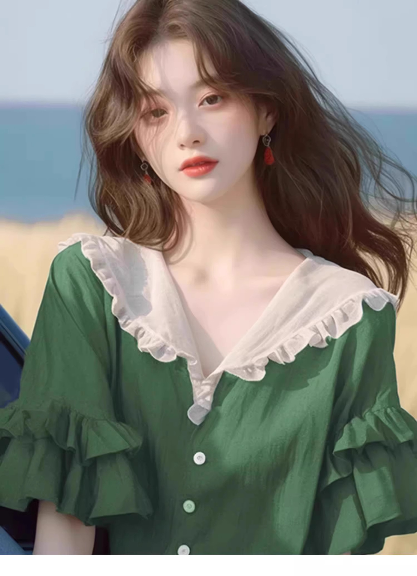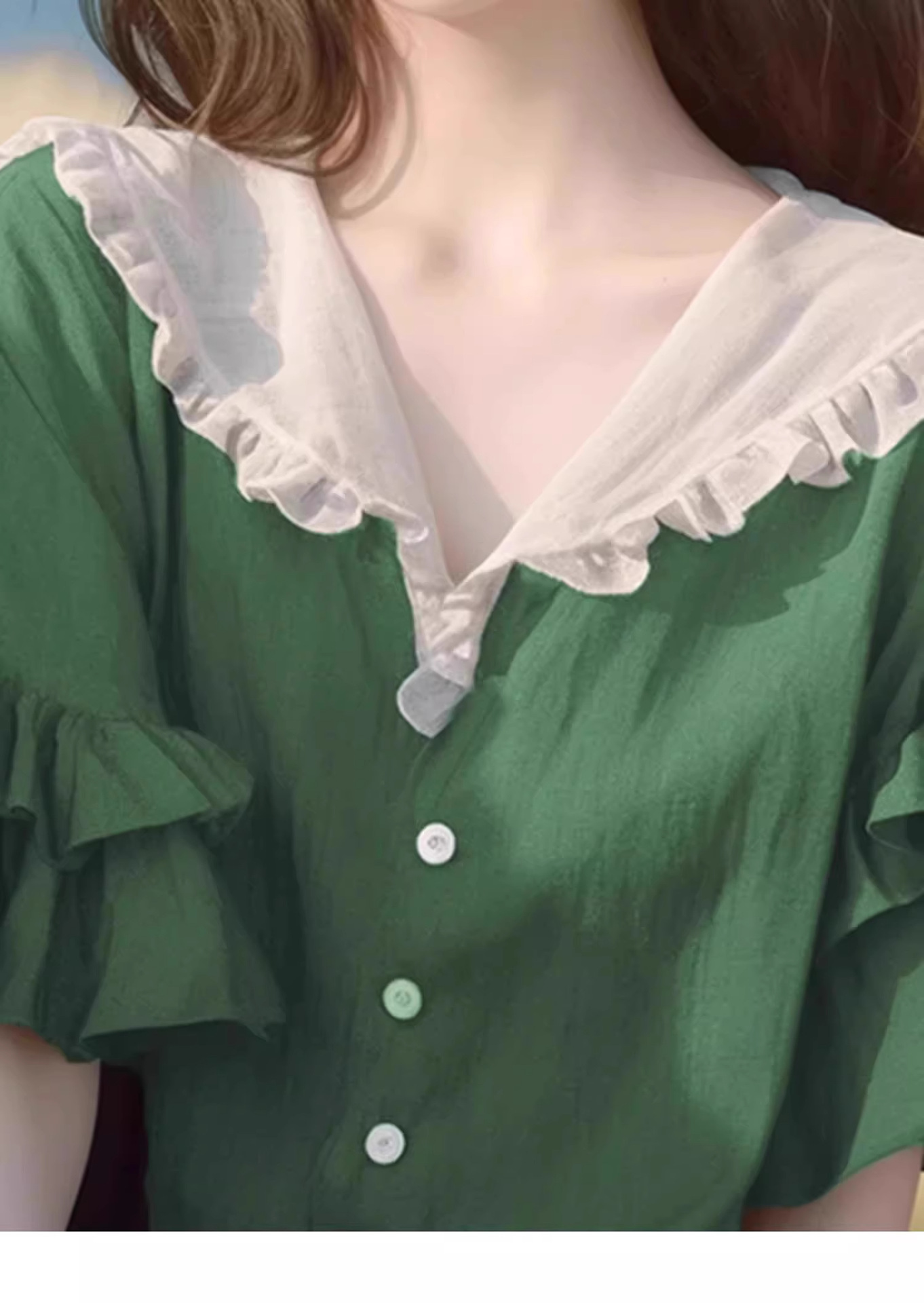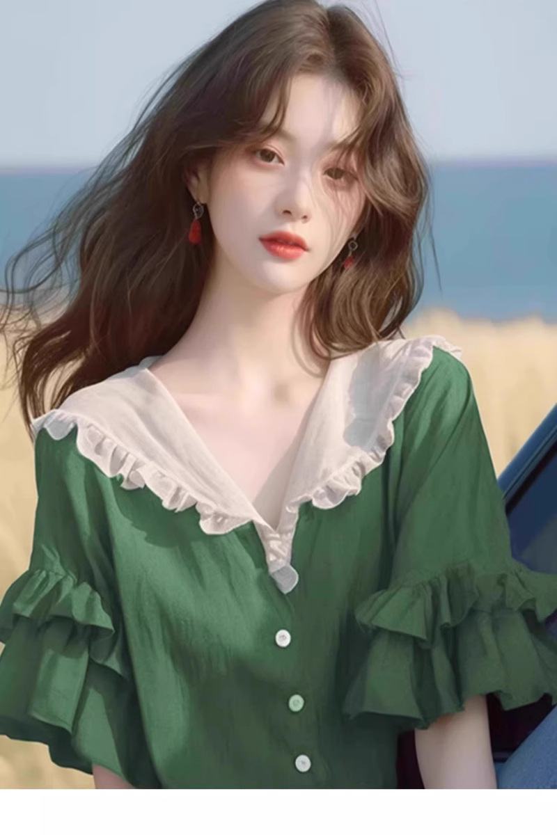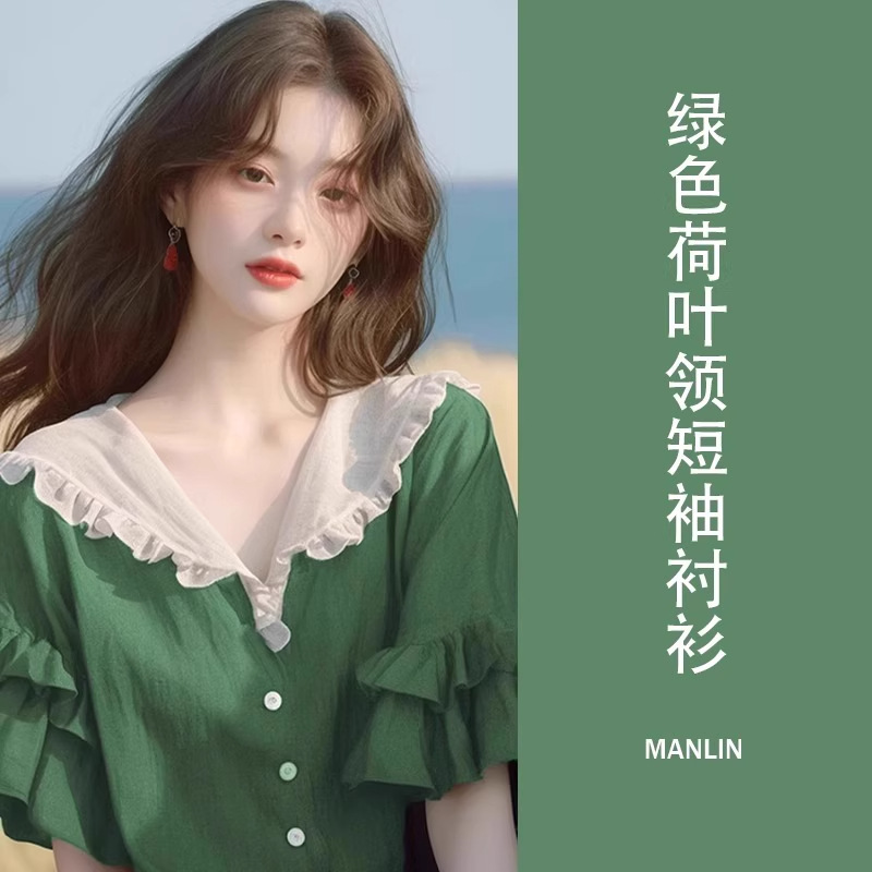 반팔 셔츠 2026 신상 여성 여름 녹색 러플 디자인 루즈핏 유니크하고 예쁜 탑스토어 가기