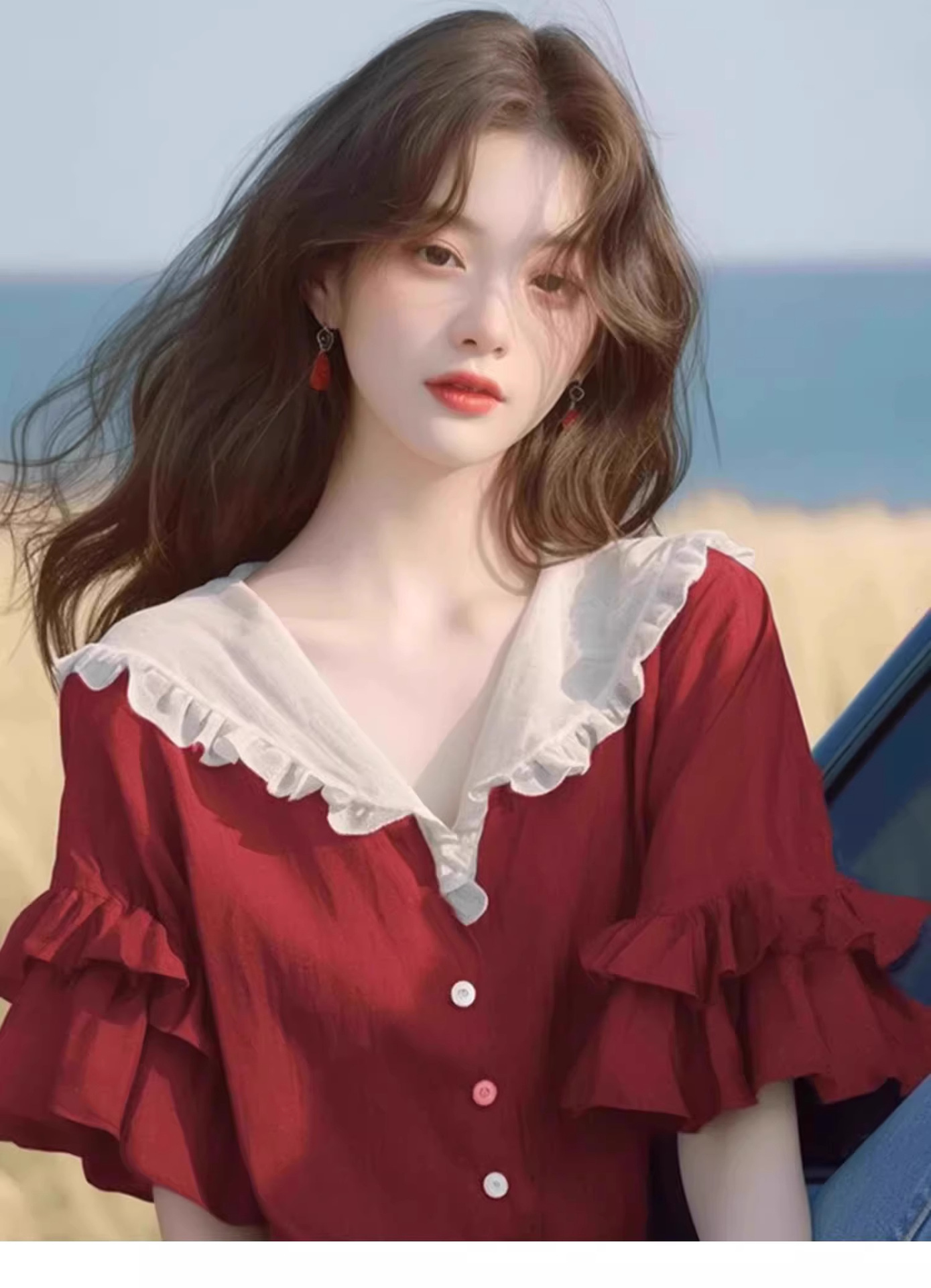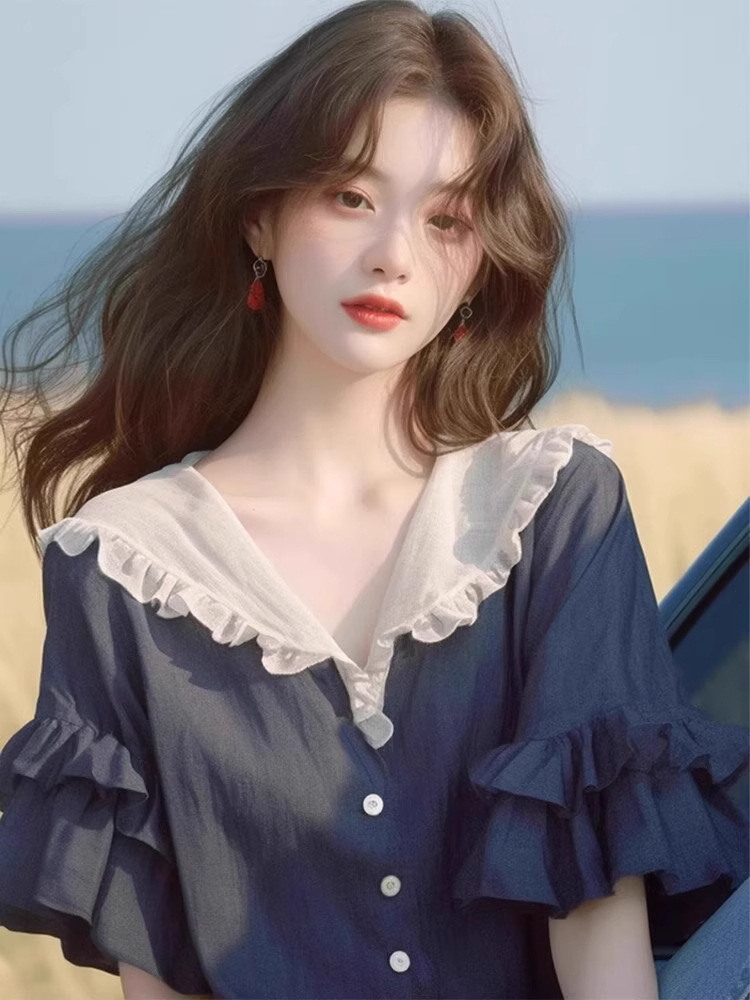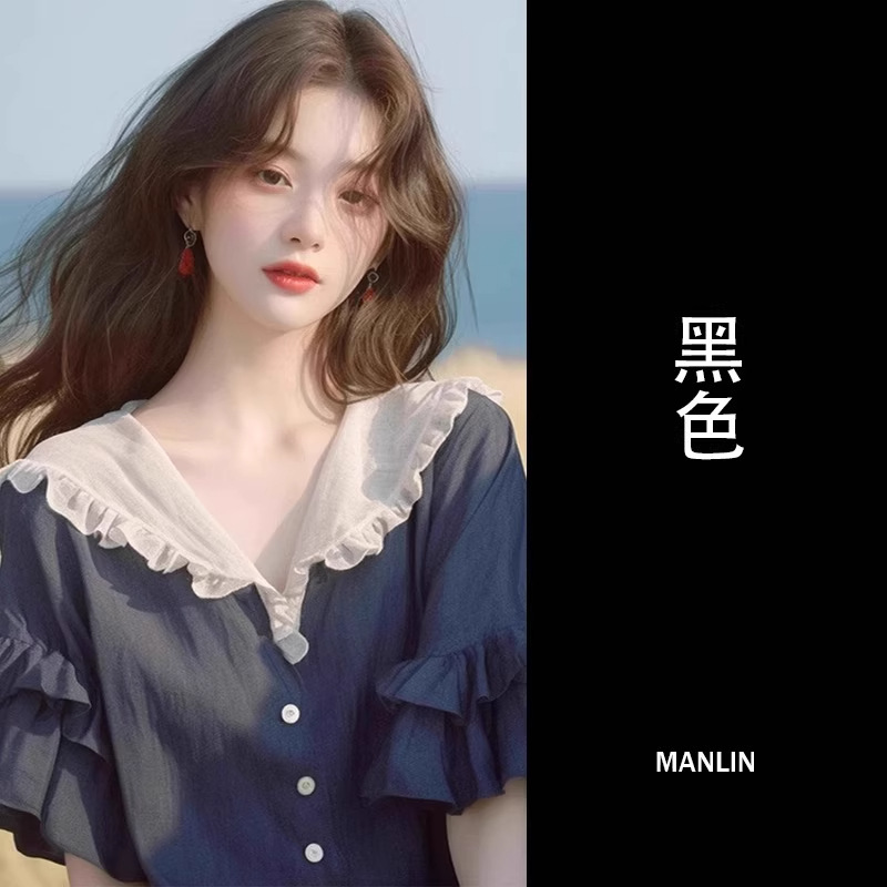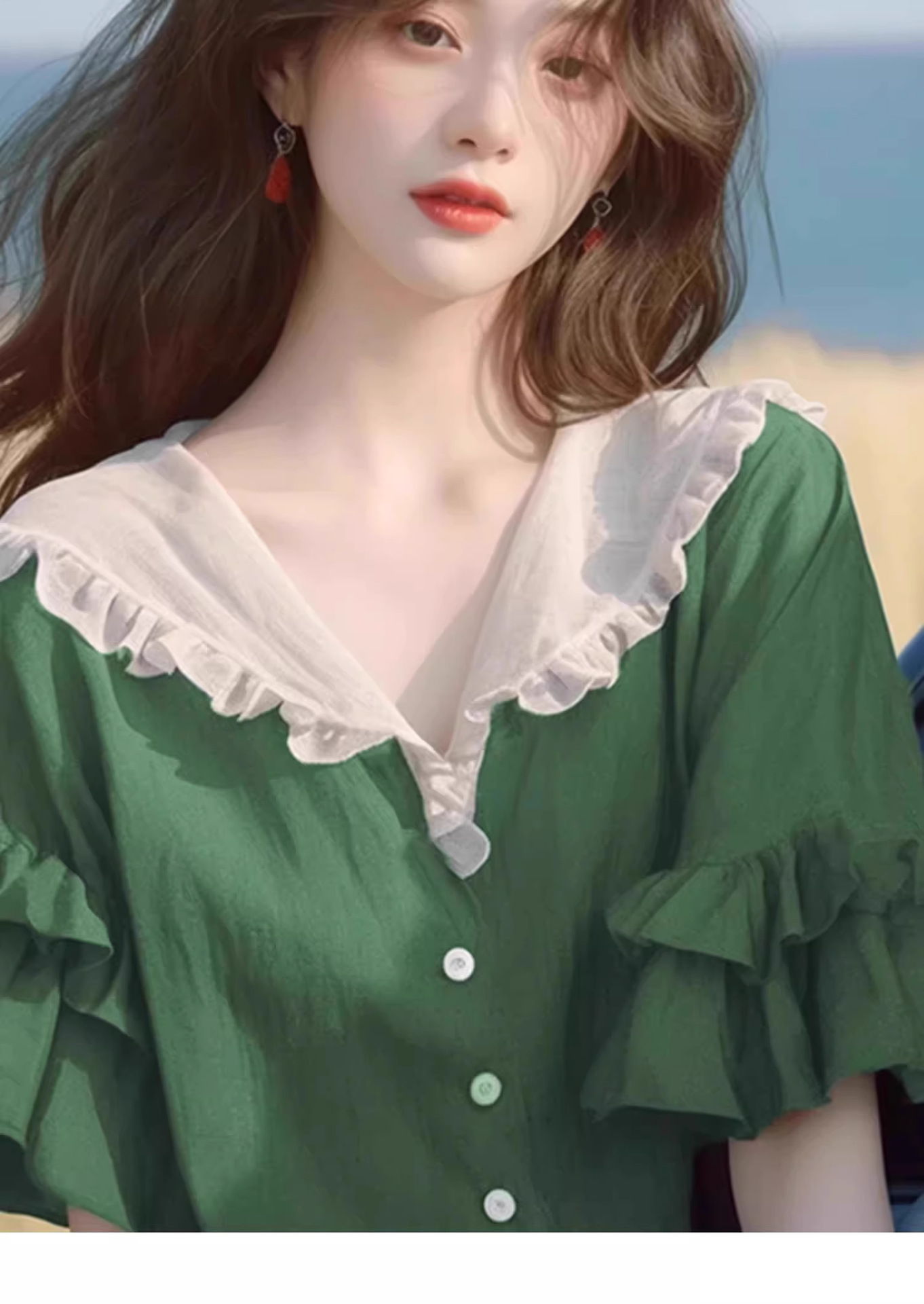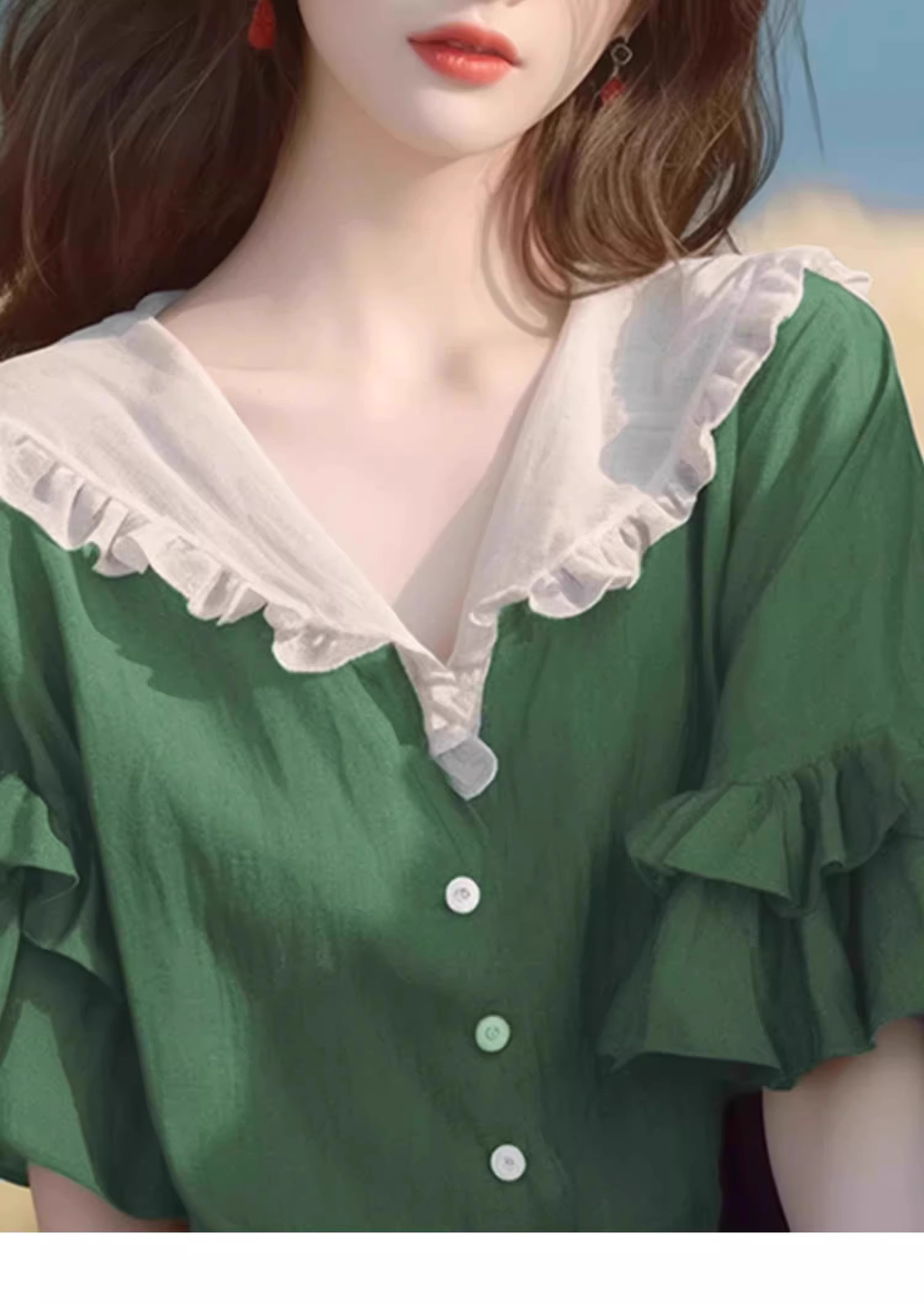 반팔 셔츠 2026 신상 여성 여름 녹색 러플 디자인 루즈핏 유니크하고 예쁜 탑스토어 가기