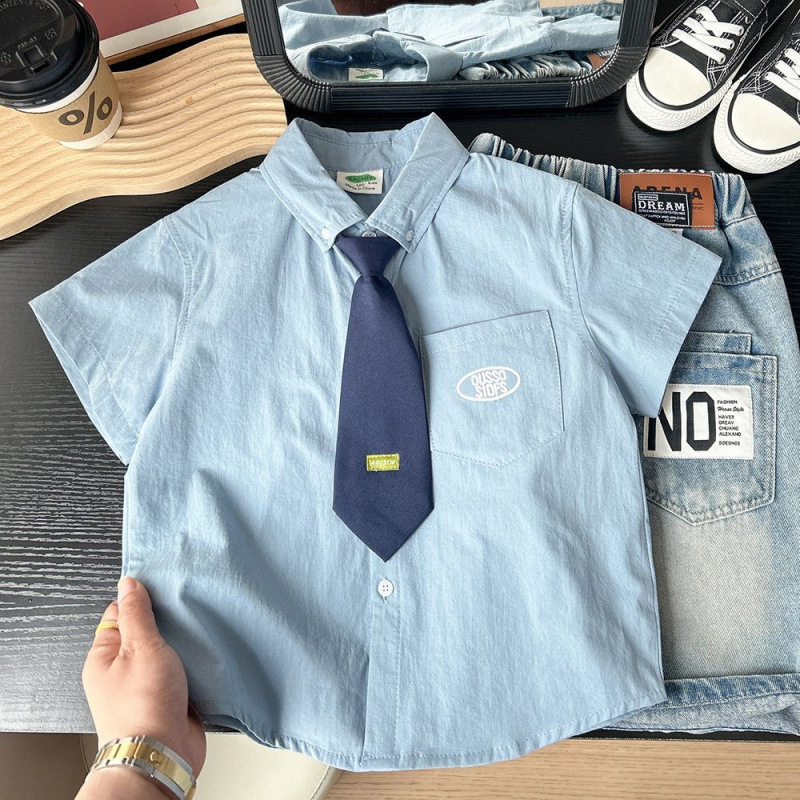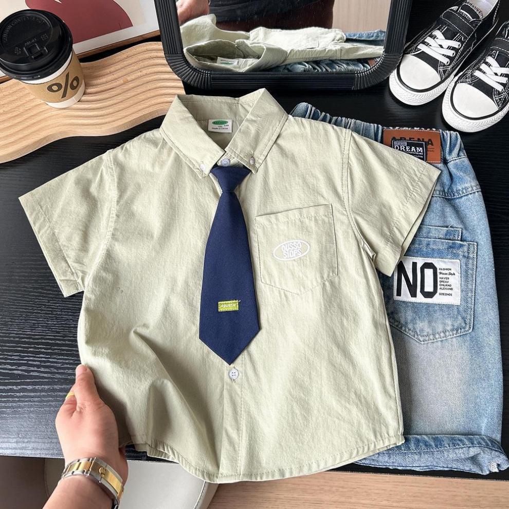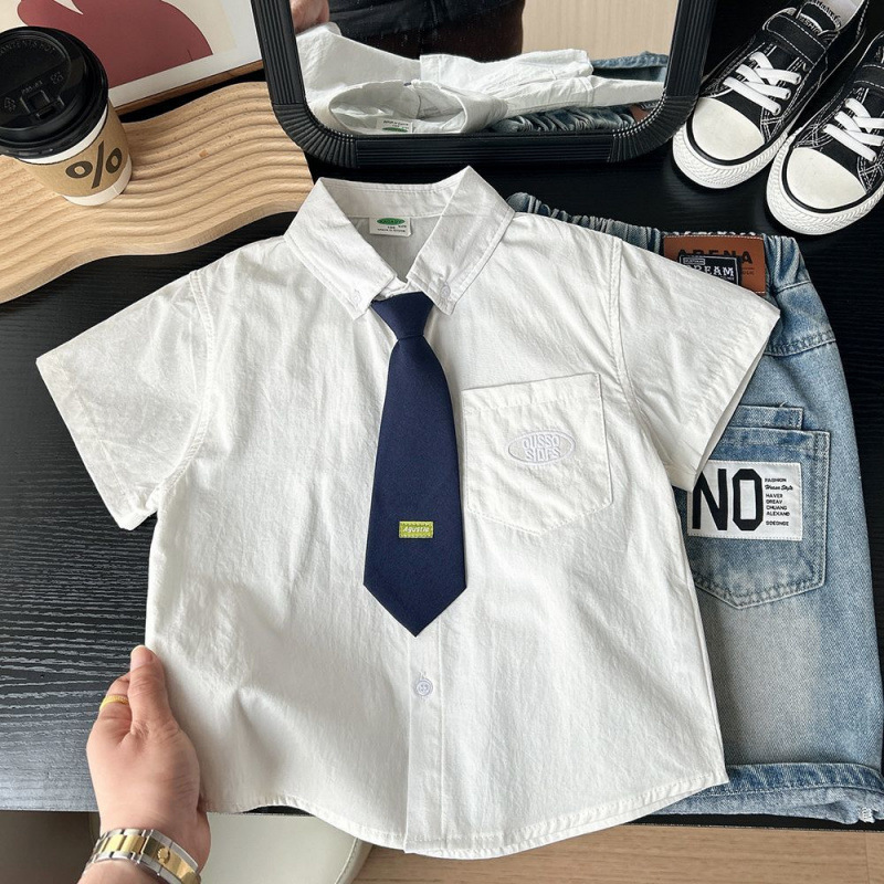 소년 대학 스타일 셔츠 2025 여름 신작 어린이 한국 스타일 반팔 얇은 스타일 캐주얼 다목적 흰색 셔츠