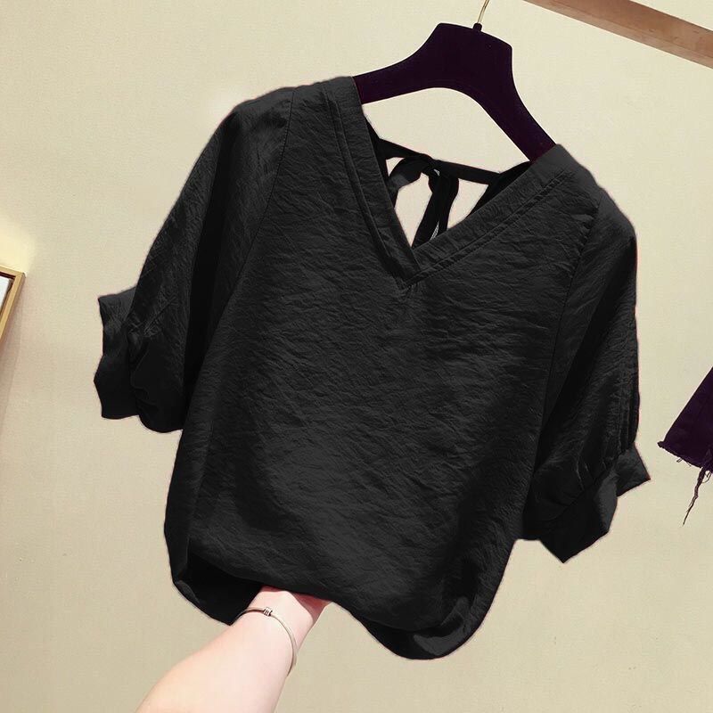 여성용 칼라 백리스 쉬폰 셔츠 반팔 2025 새로운 한국 스타일 요정 달콤한 루즈 슬리밍 배 커버 탑스토어 가기