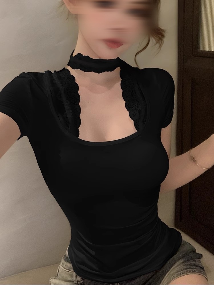 여름 디자인 순수한 욕망 핫 소녀 화이트 u 넥 타이트 탑 여성을위한 가짜 투피스 섹시한 홀터넥 레이스 반팔 티셔츠스토어 가기
