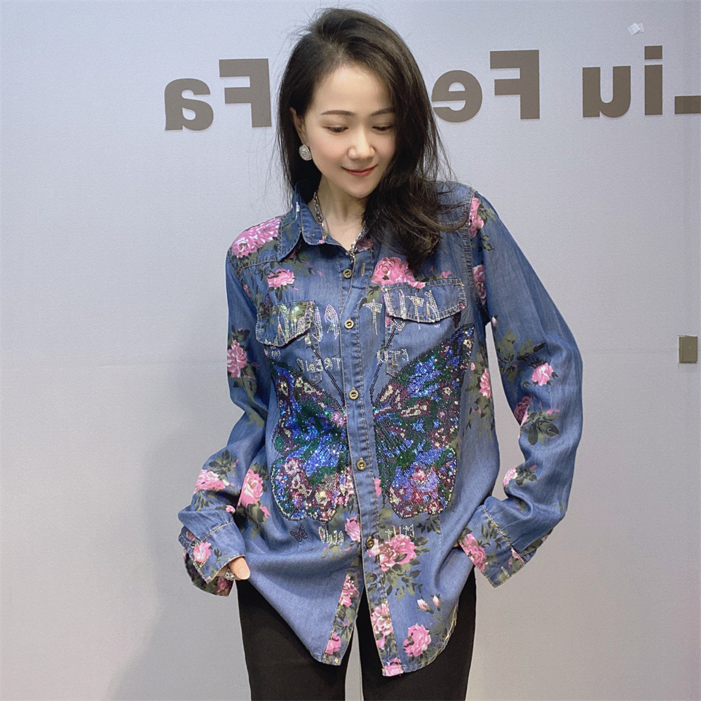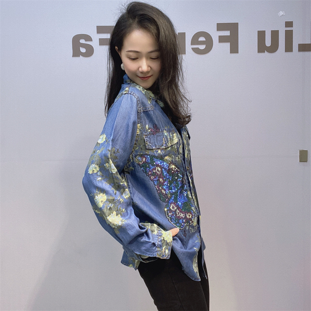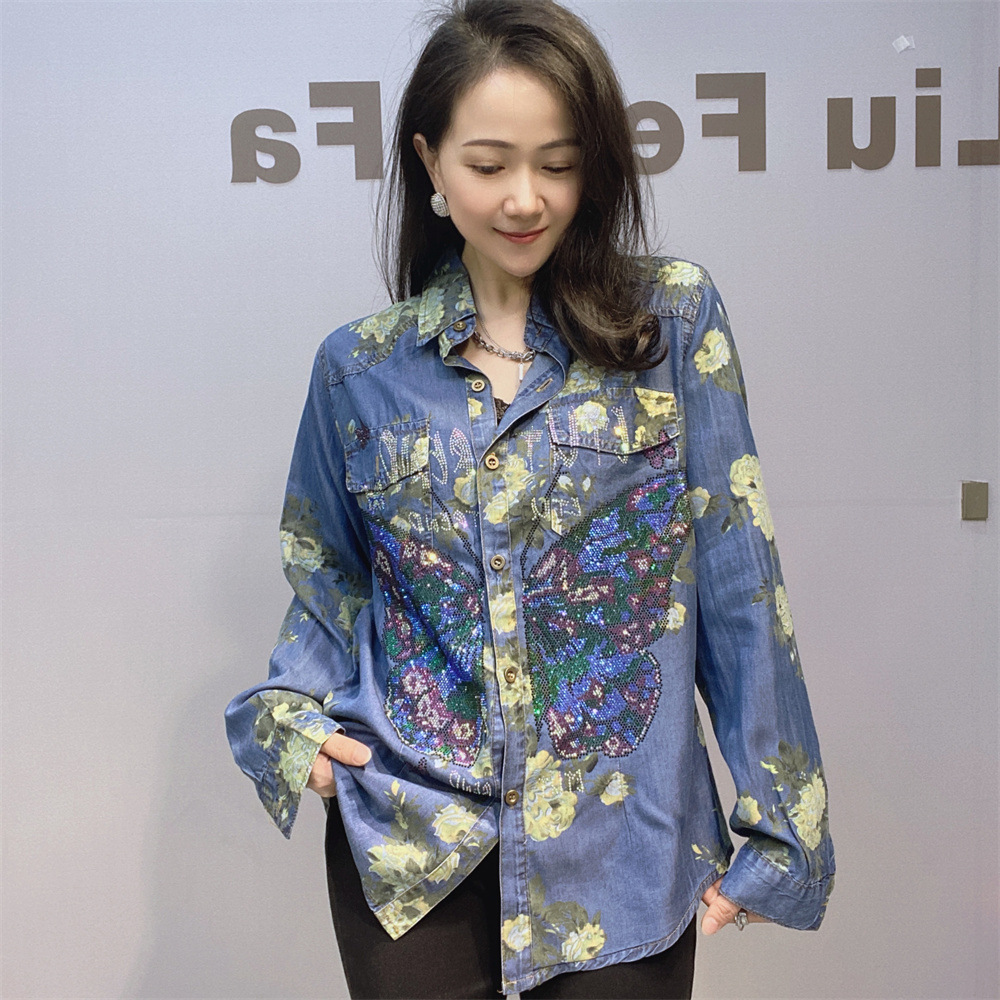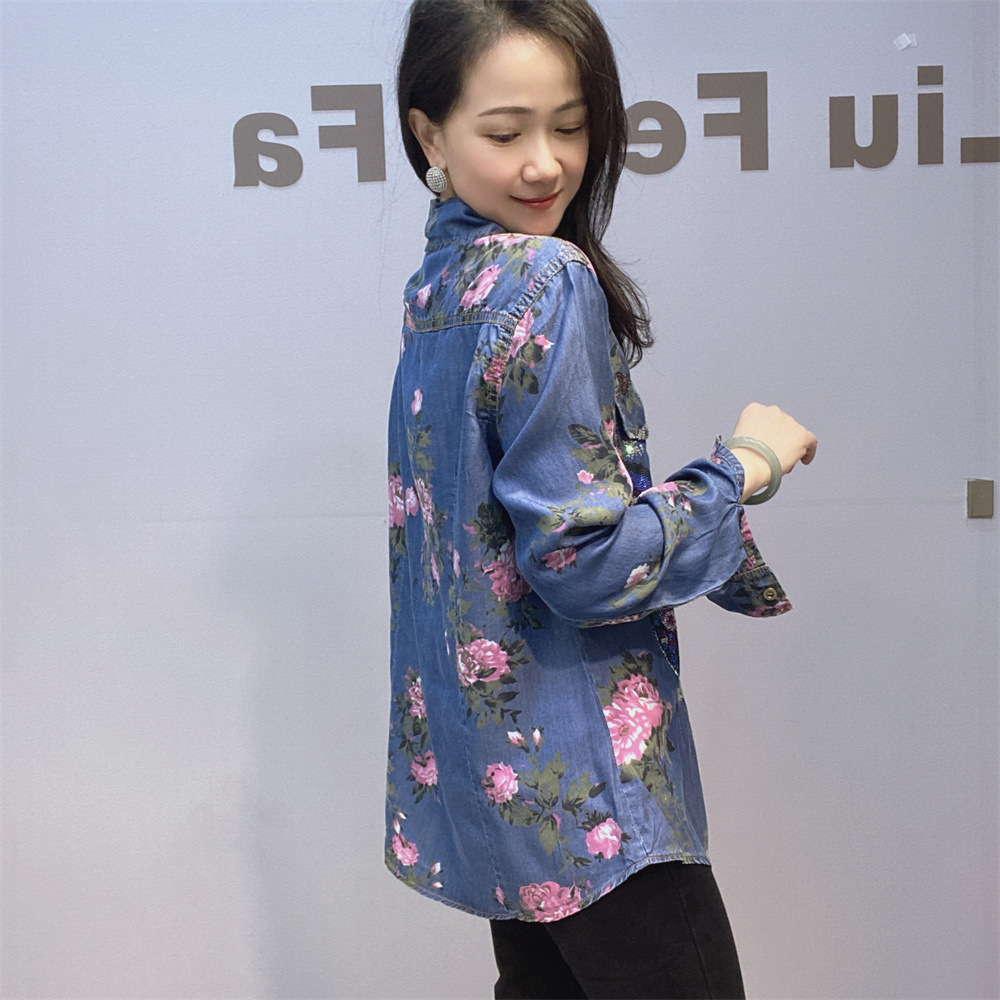 부드럽고 시원한 텐셀 데님 셔츠 얇은 소재 수직 느슨한 슬림 룩 옷깃 셔츠 여성용 여름 다이아몬드 데님 긴 소매스토어 가기