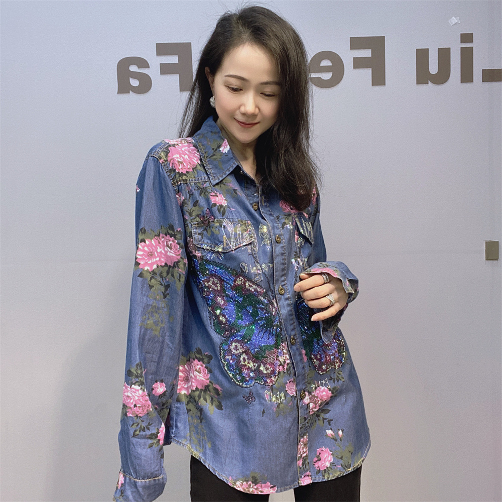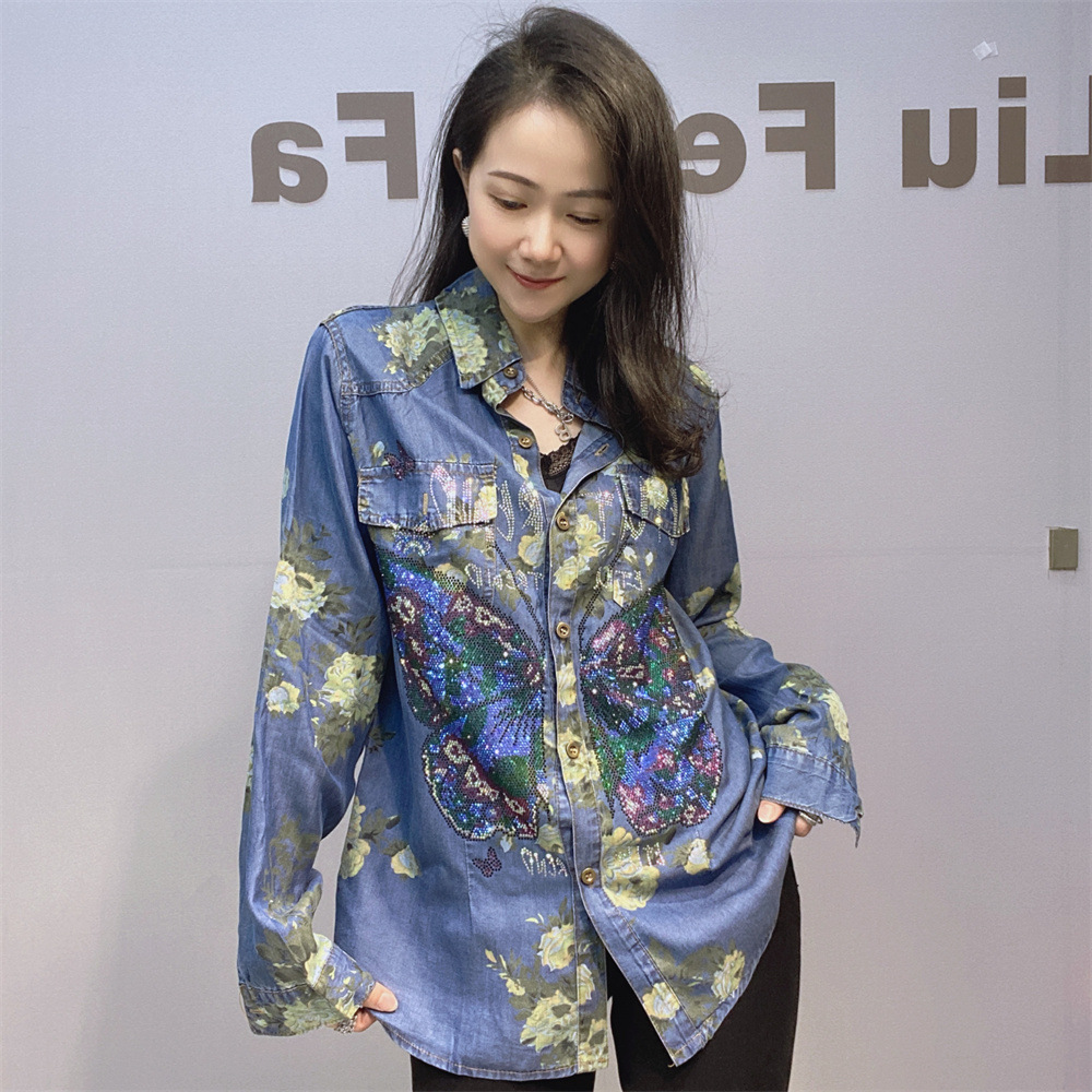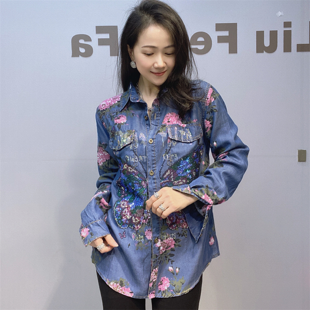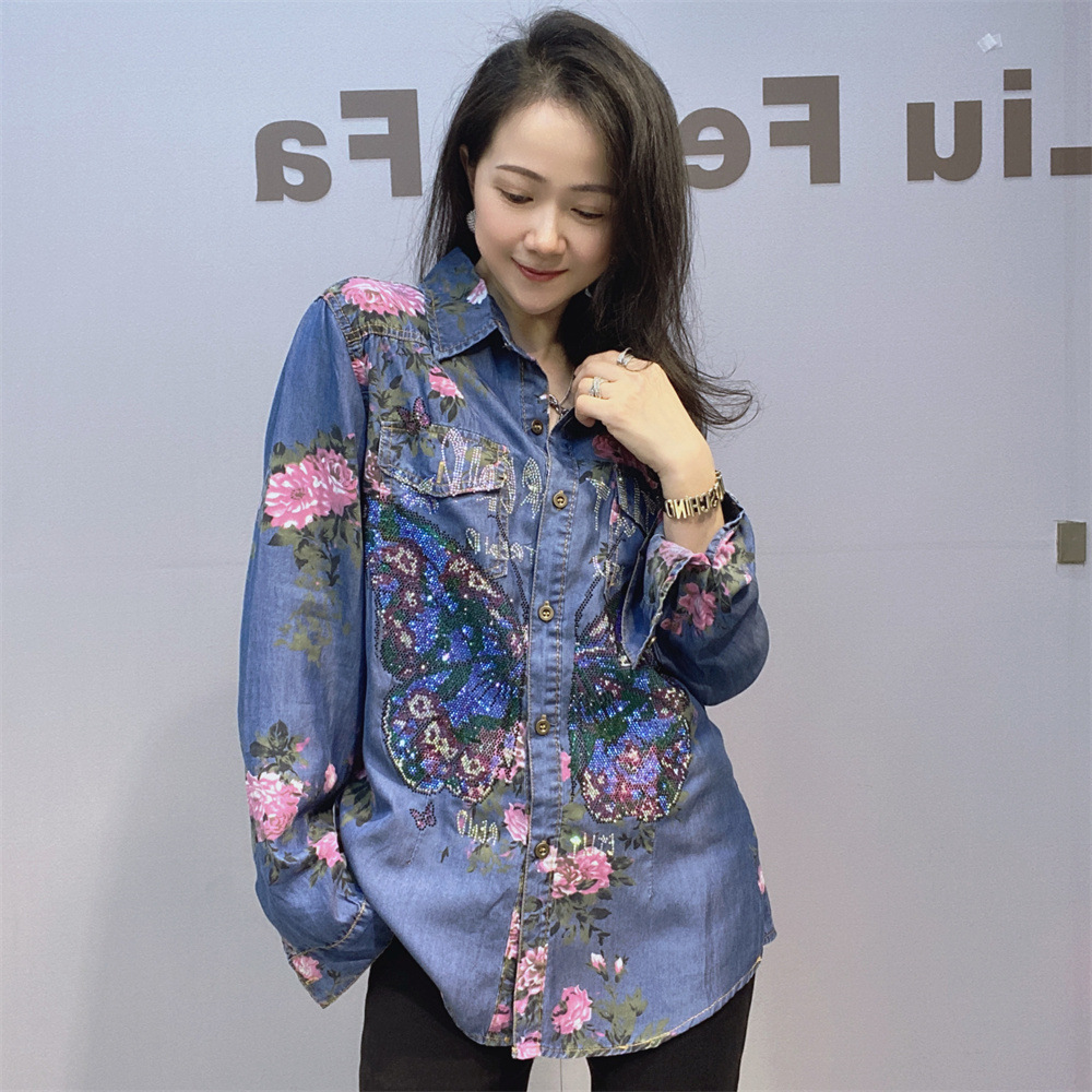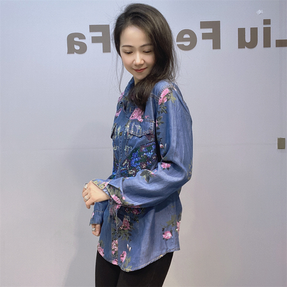 부드럽고 시원한 텐셀 데님 셔츠 얇은 소재 수직 느슨한 슬림 룩 옷깃 셔츠 여성용 여름 다이아몬드 데님 긴 소매스토어 가기