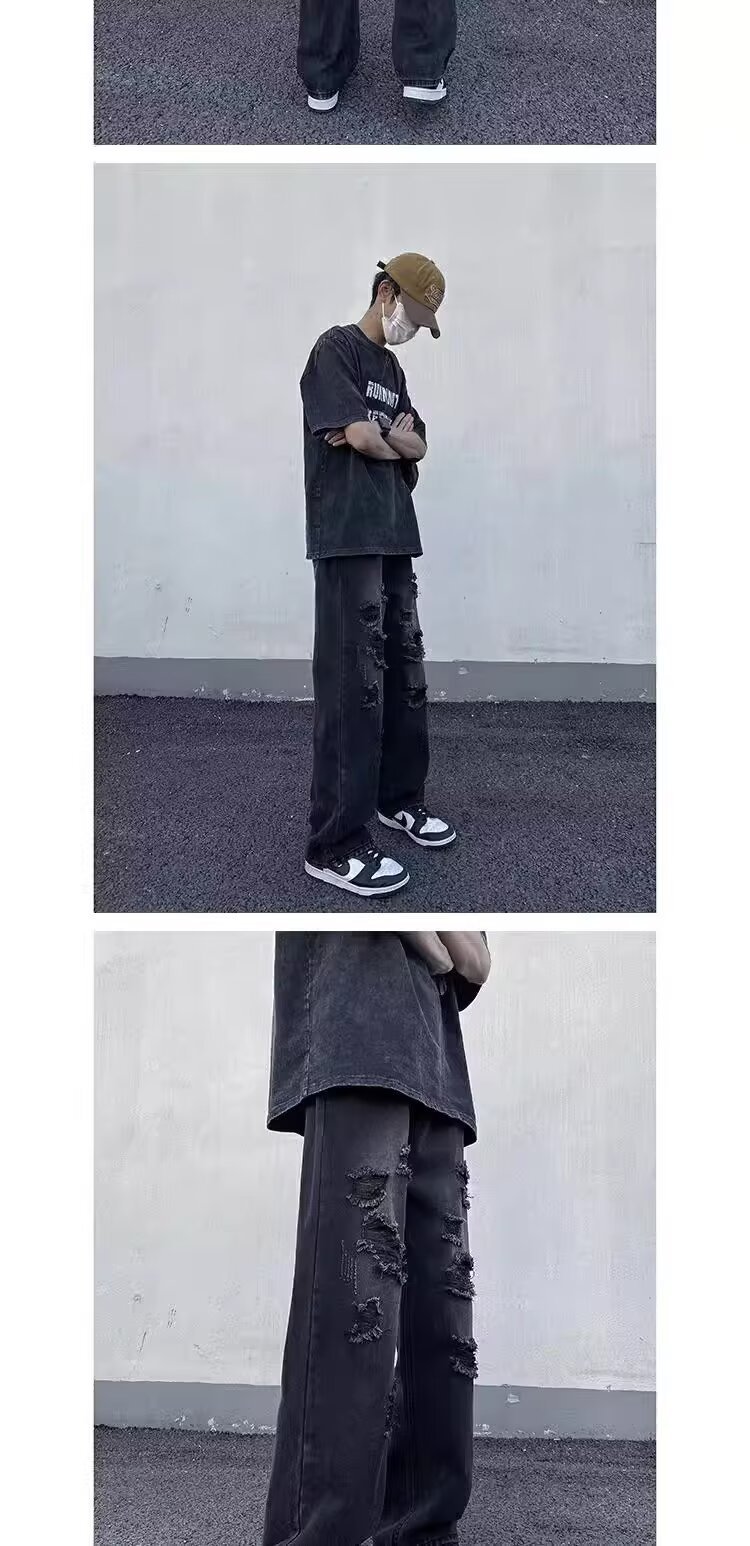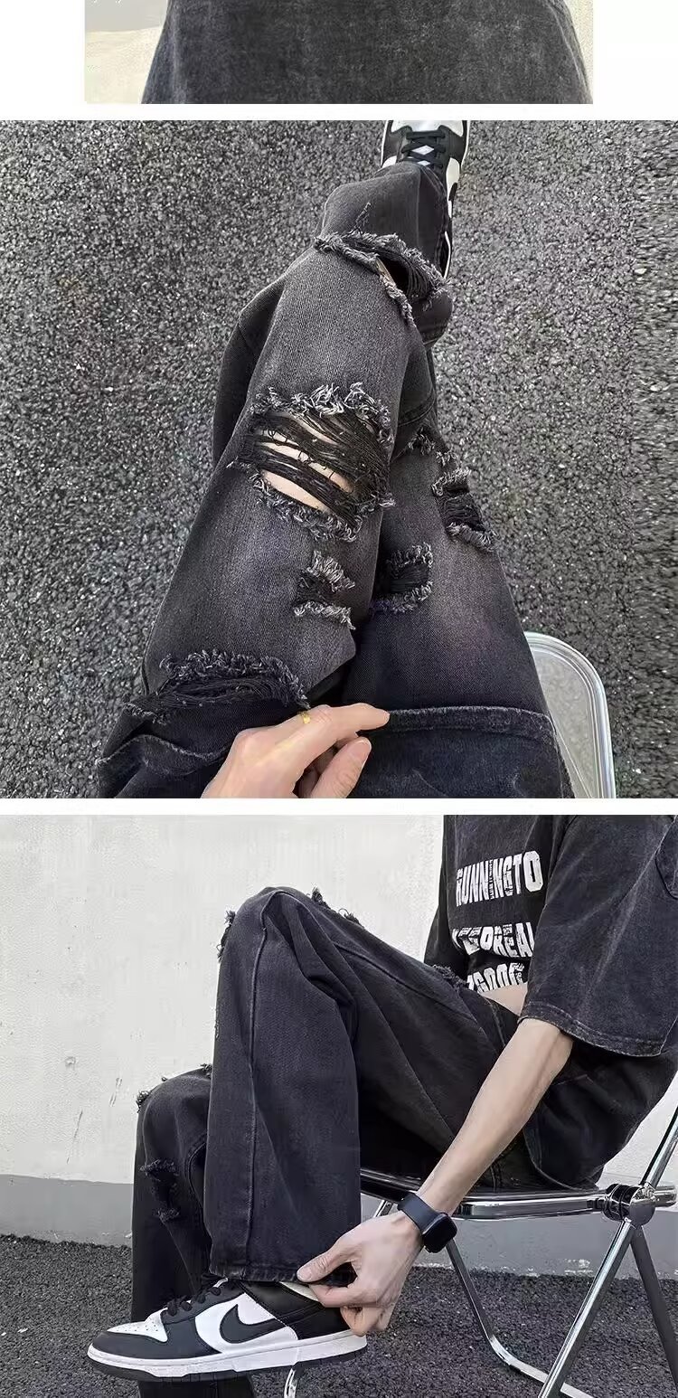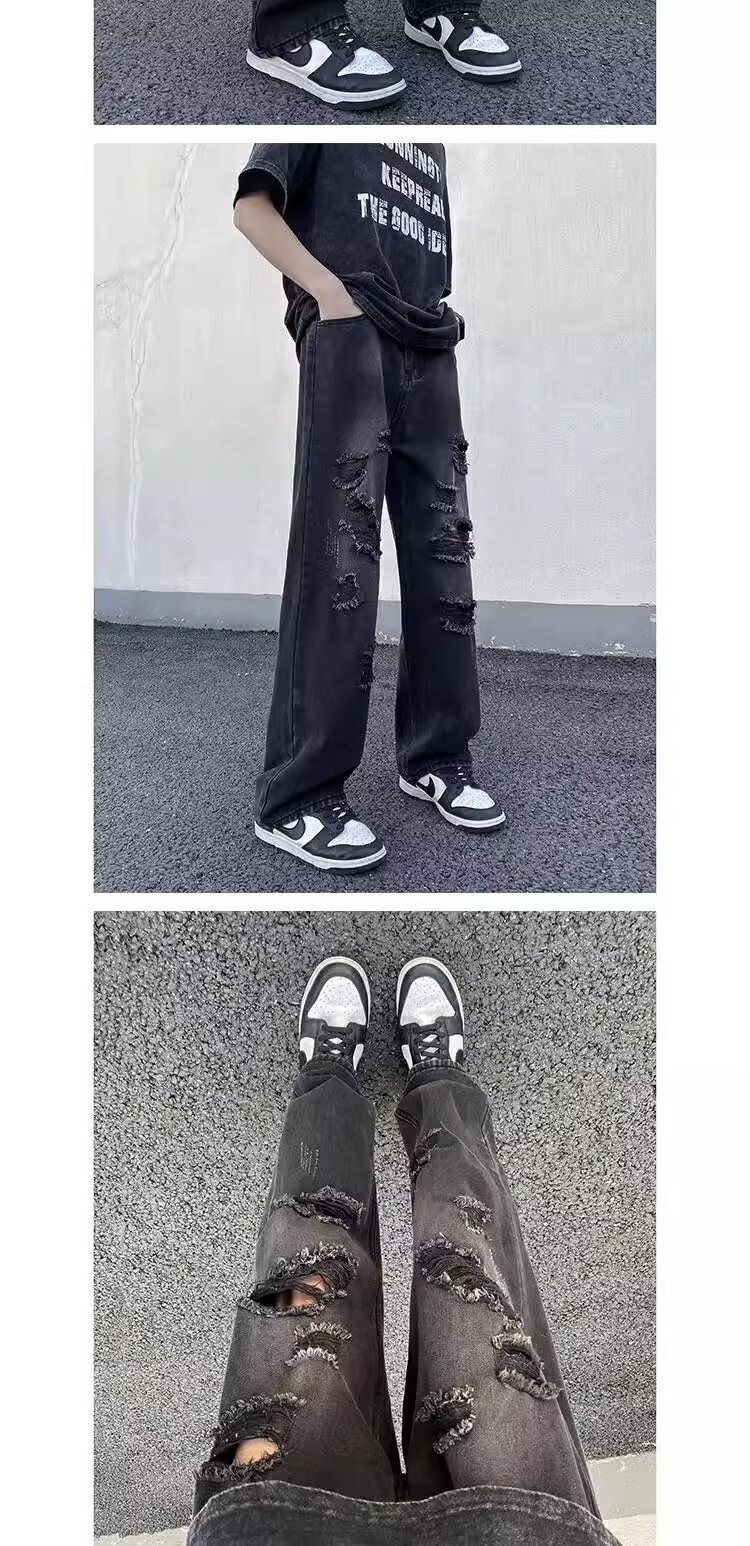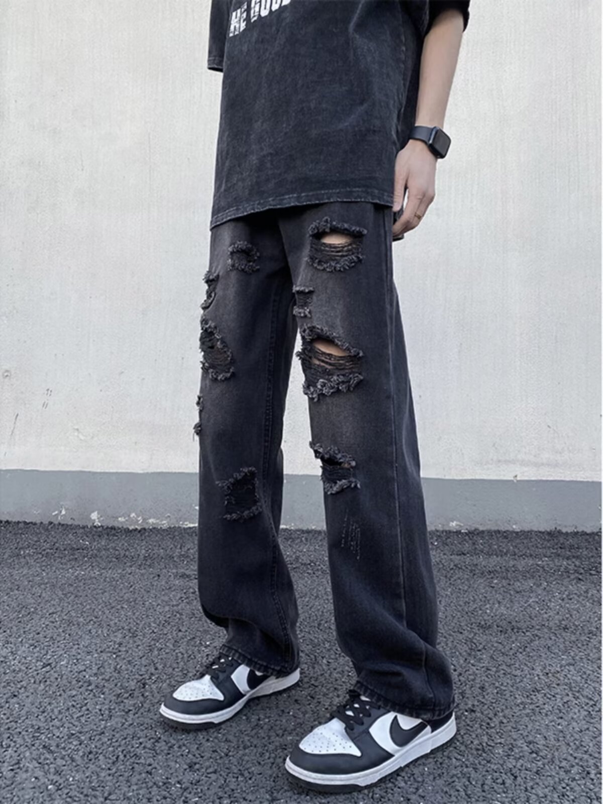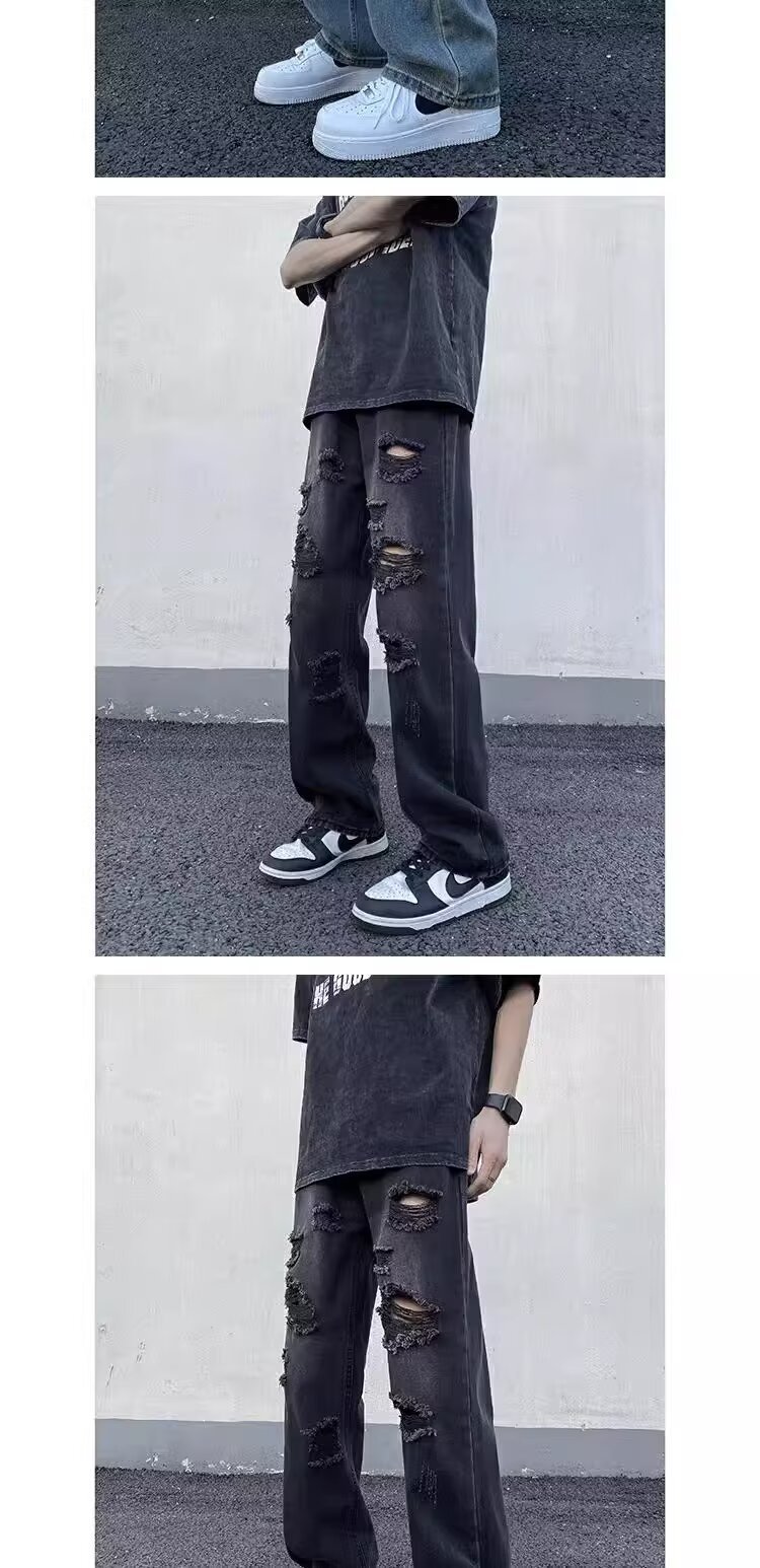 아메리칸 바이브 레트로 블랙 스트레이트 레그 찢어진 청바지, 슬림하고 멋진 남성용 틈새 로우 엣지 디스트레스드 디자인 바지