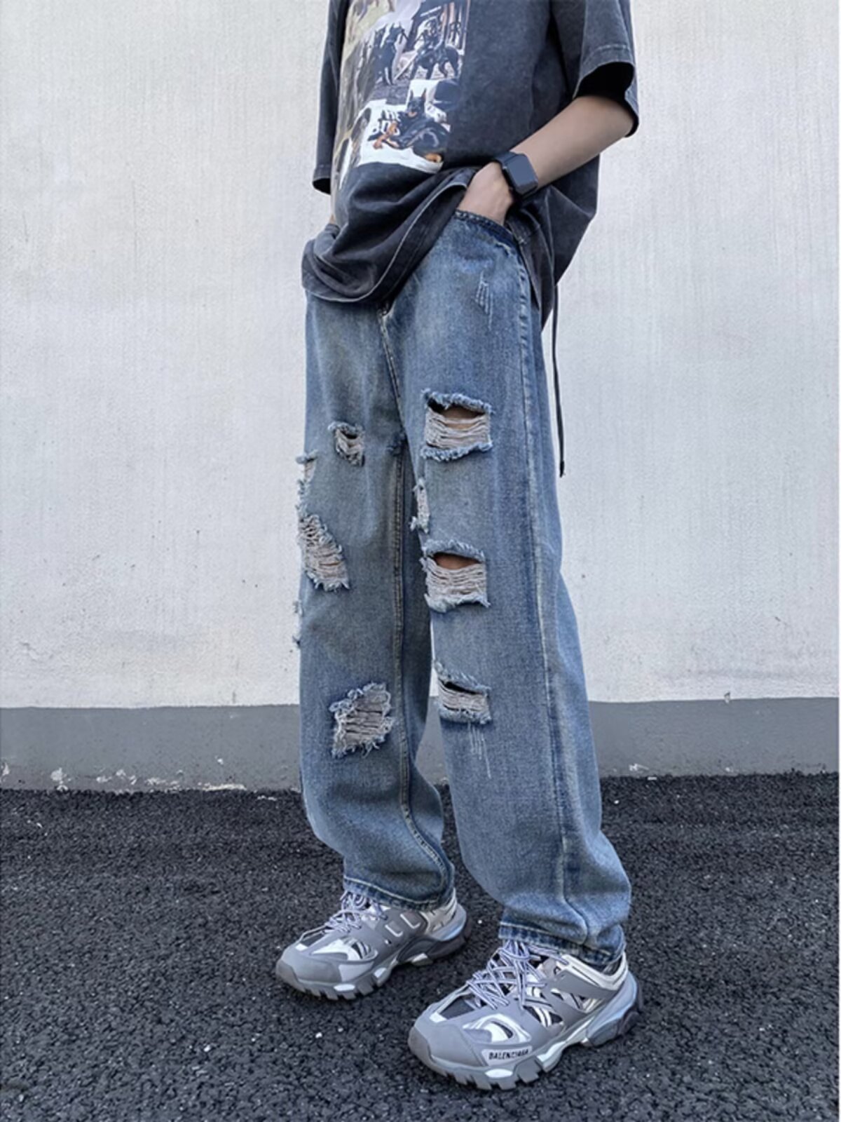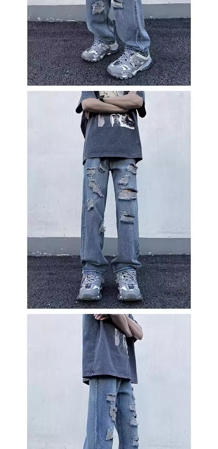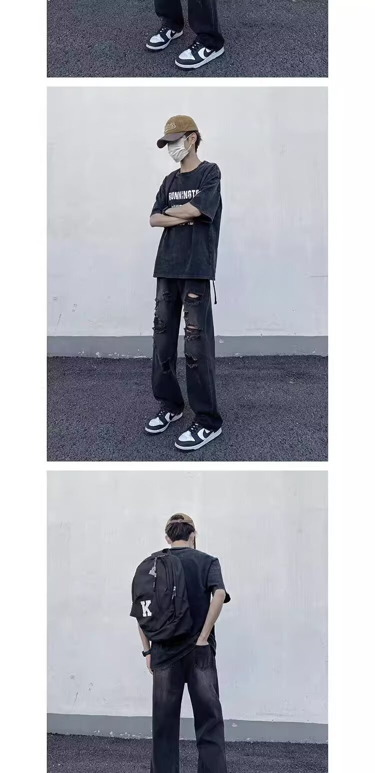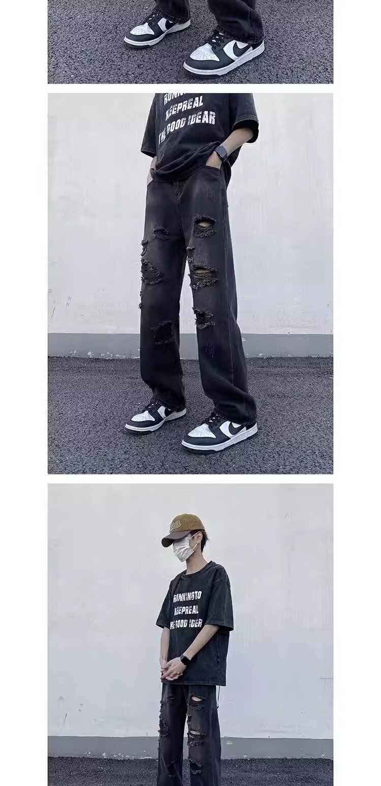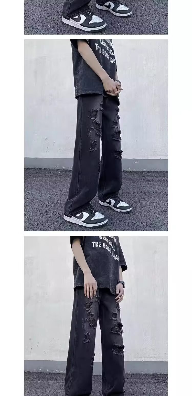 아메리칸 바이브 레트로 블랙 스트레이트 레그 찢어진 청바지, 슬림하고 멋진 남성용 틈새 로우 엣지 디스트레스드 디자인 바지