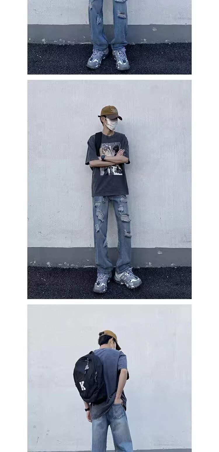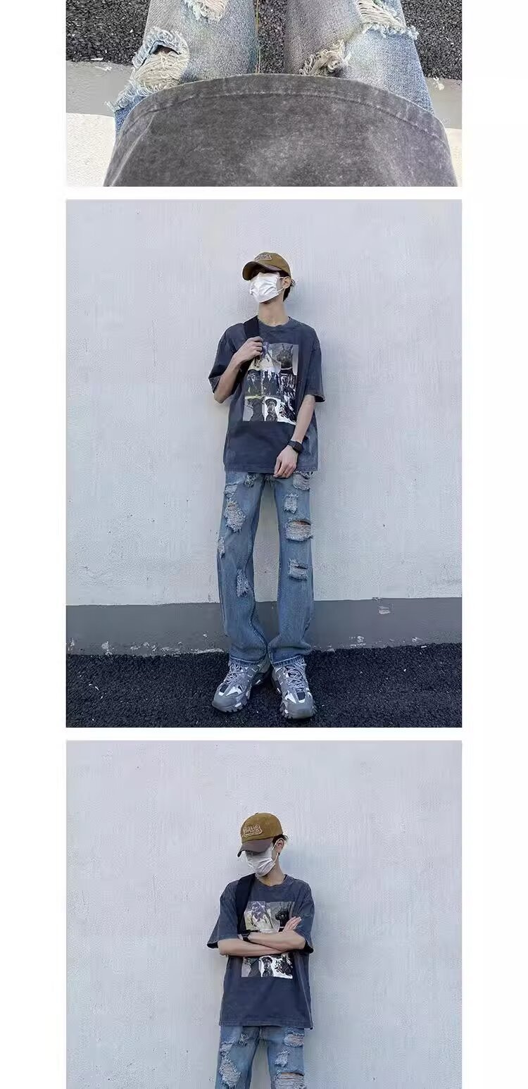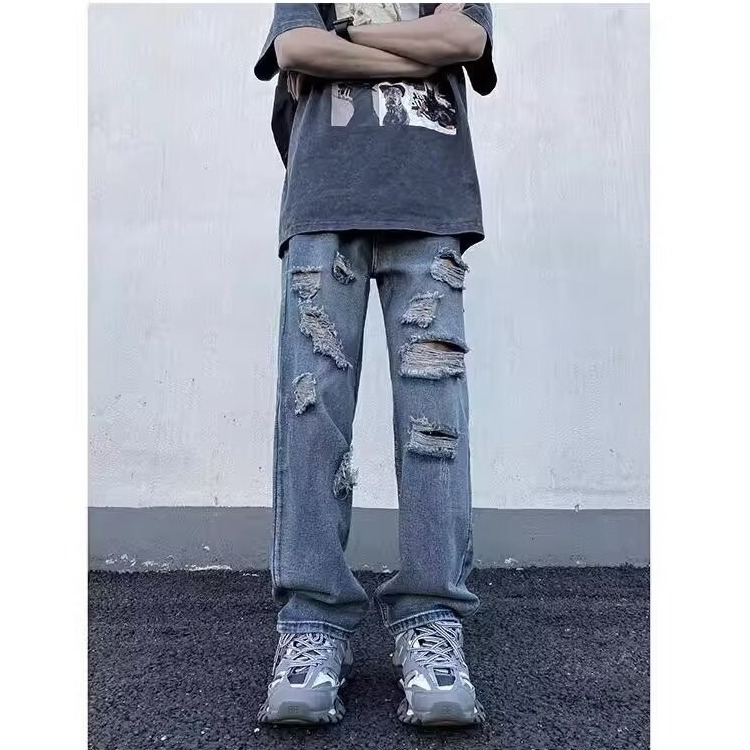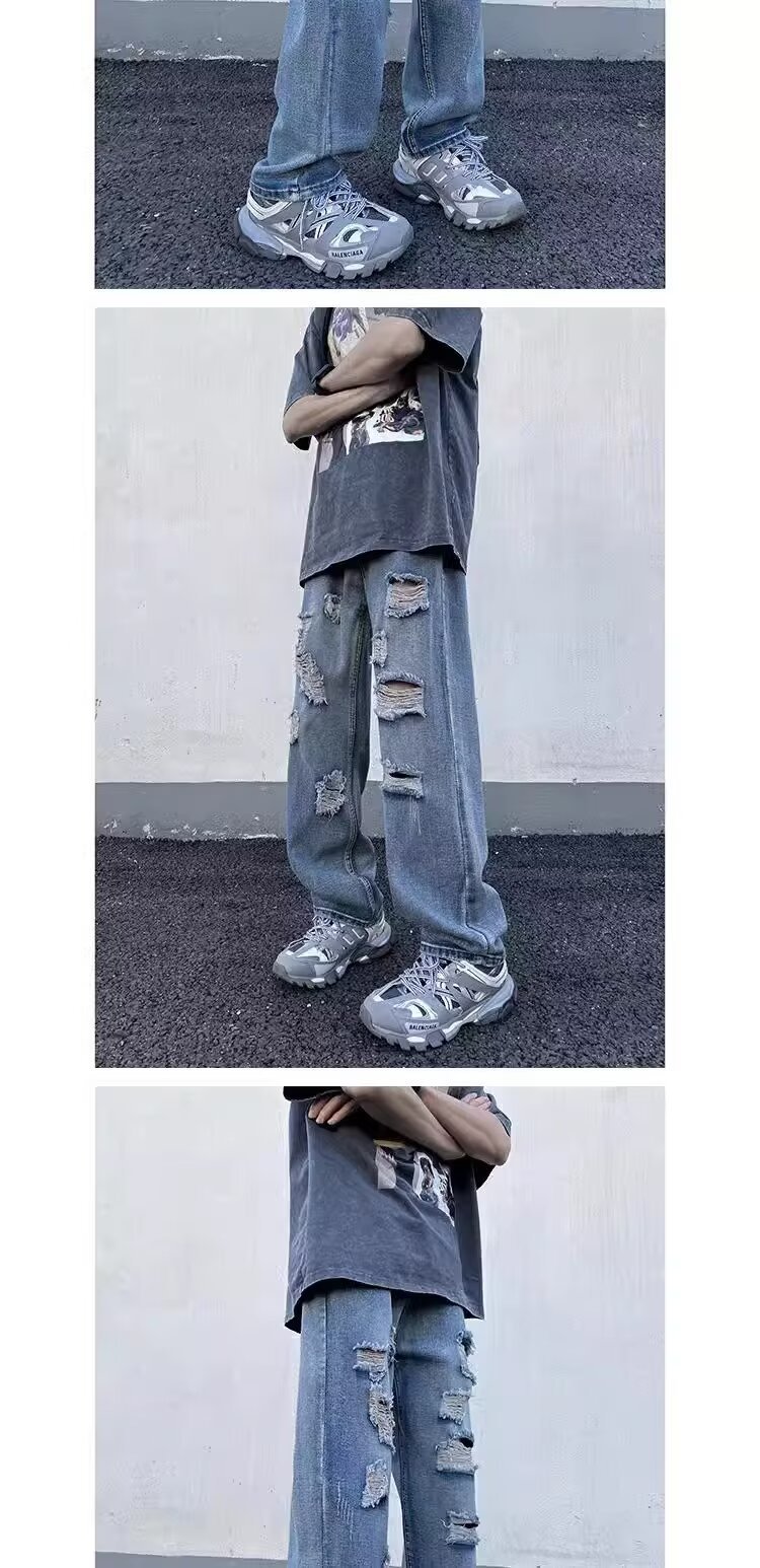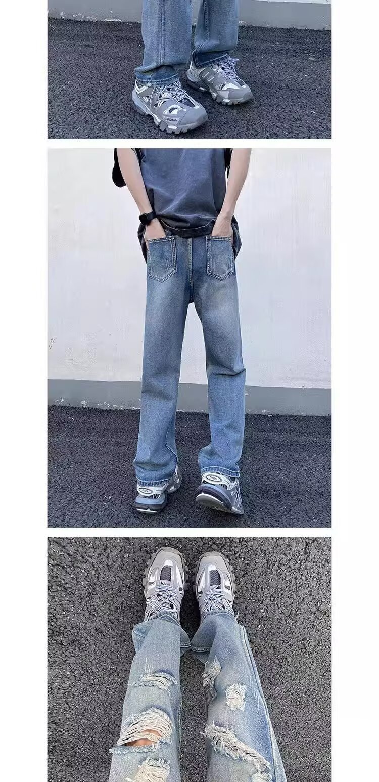 아메리칸 바이브 레트로 블랙 스트레이트 레그 찢어진 청바지, 슬림하고 멋진 남성용 틈새 로우 엣지 디스트레스드 디자인 바지