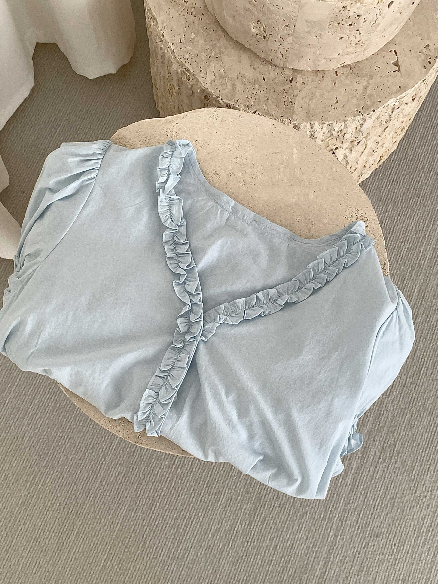 TG 프랑스 장난기 많은 곰팡이 레이스 주름 거품 소매 셔츠 여성의 2025 년 여름 새로운 V 넥 탑 24878