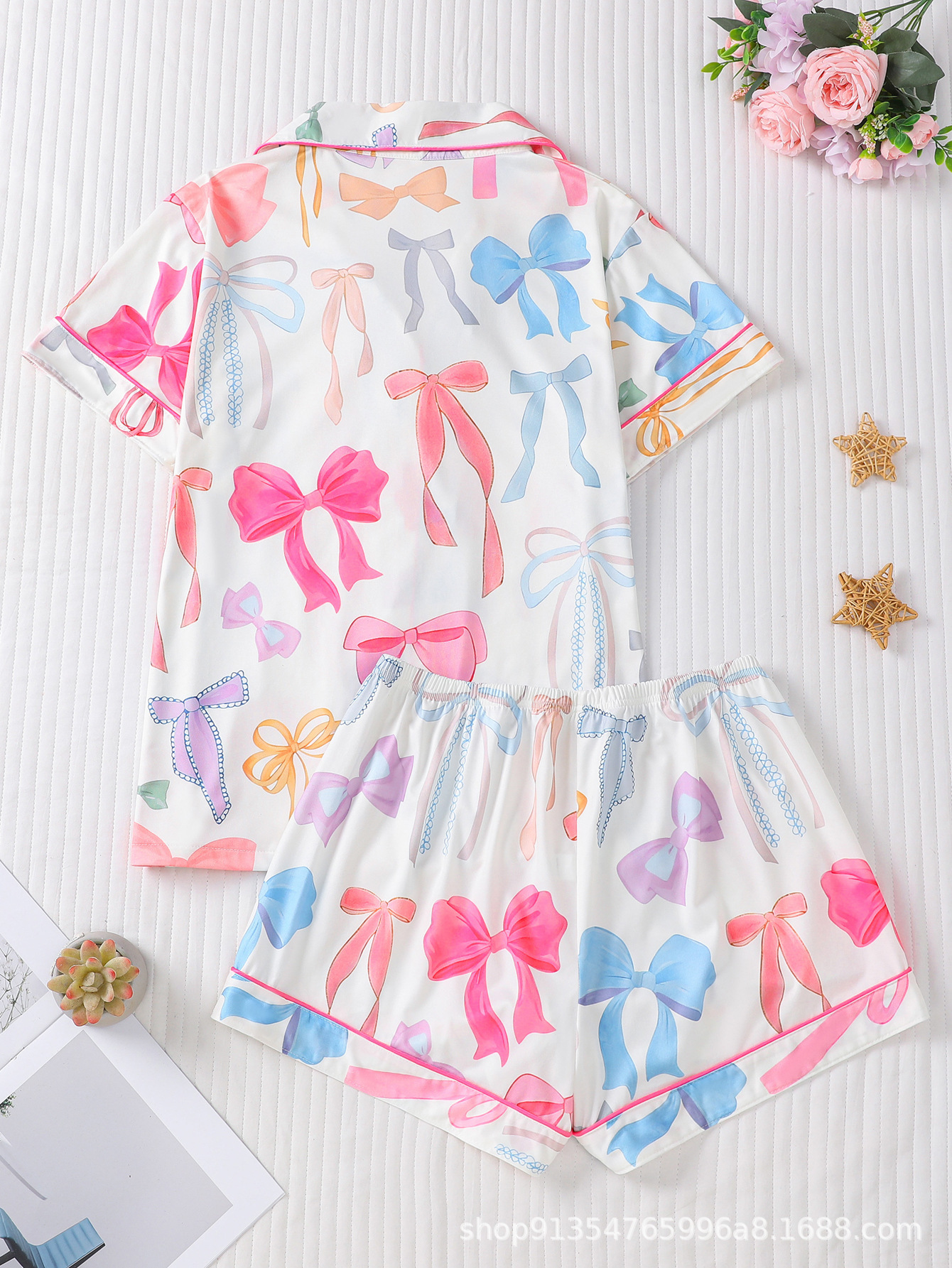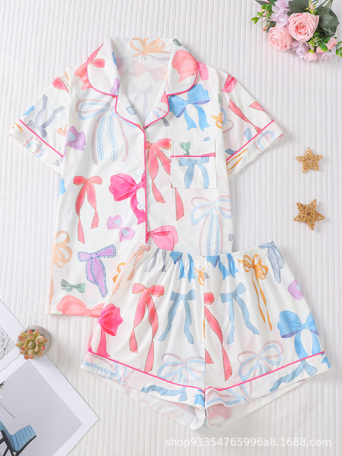 국경 간 대외 무역 새로운 잠옷 사계절 활 인쇄 옷깃 느슨한 짧은 소매 반바지 여성 홈 의류 세트스토어 가기