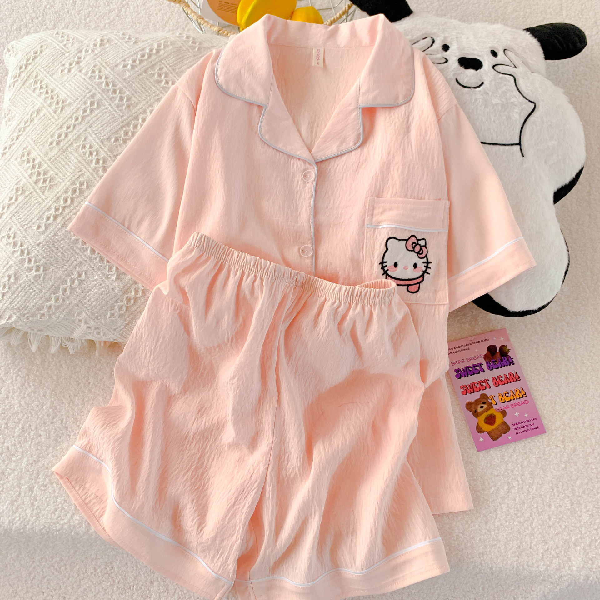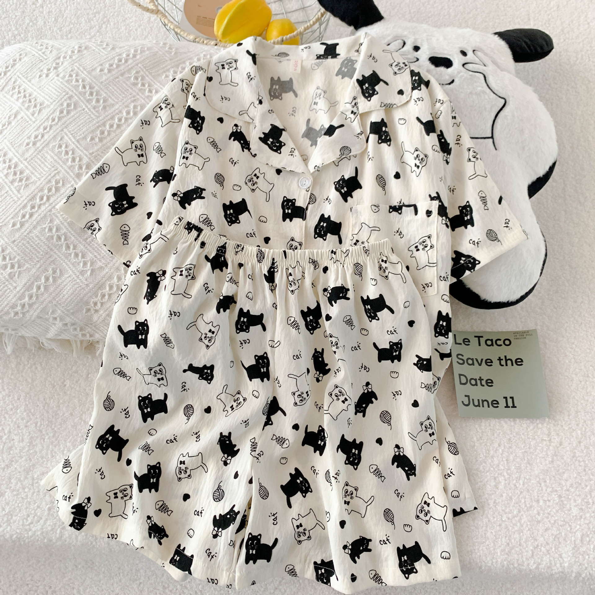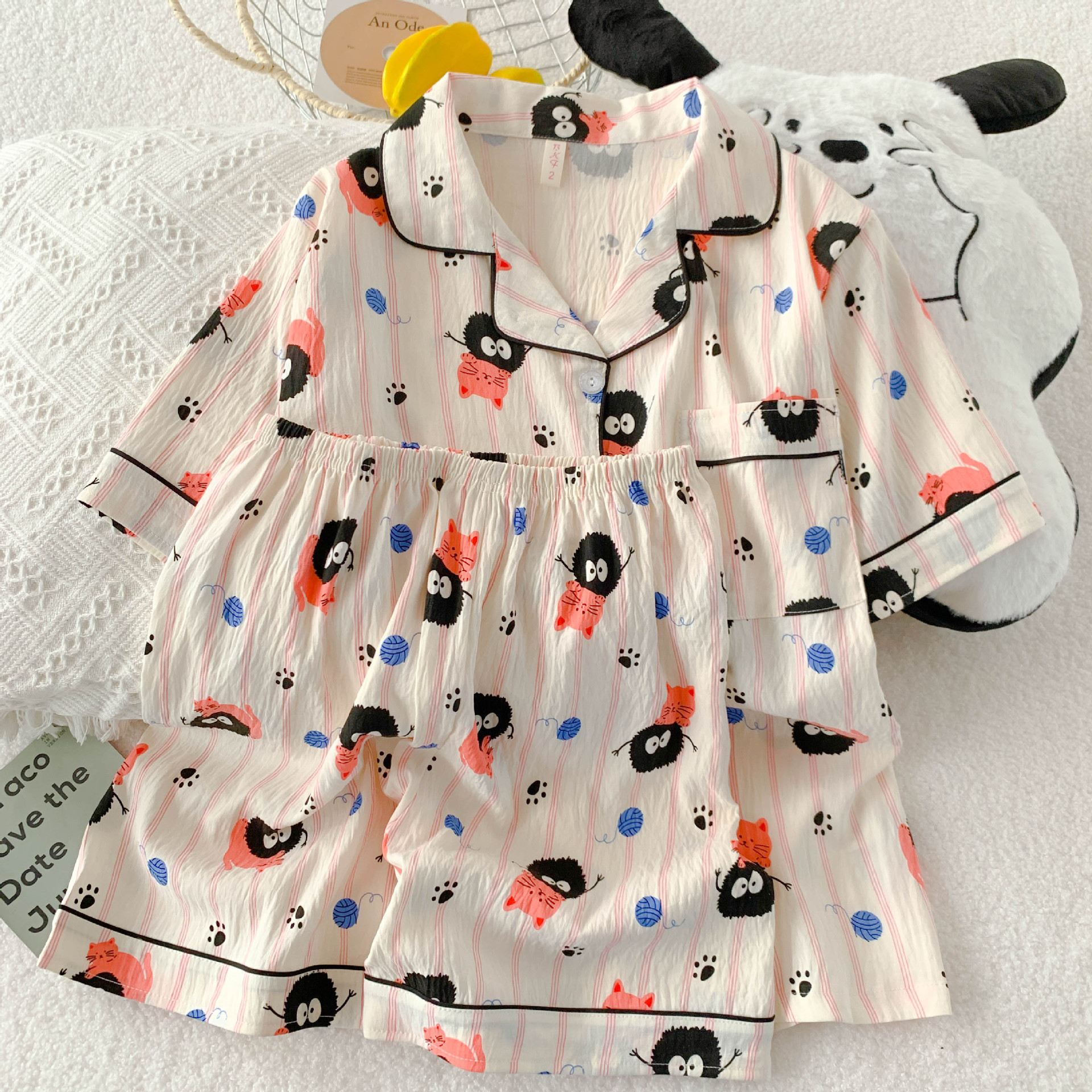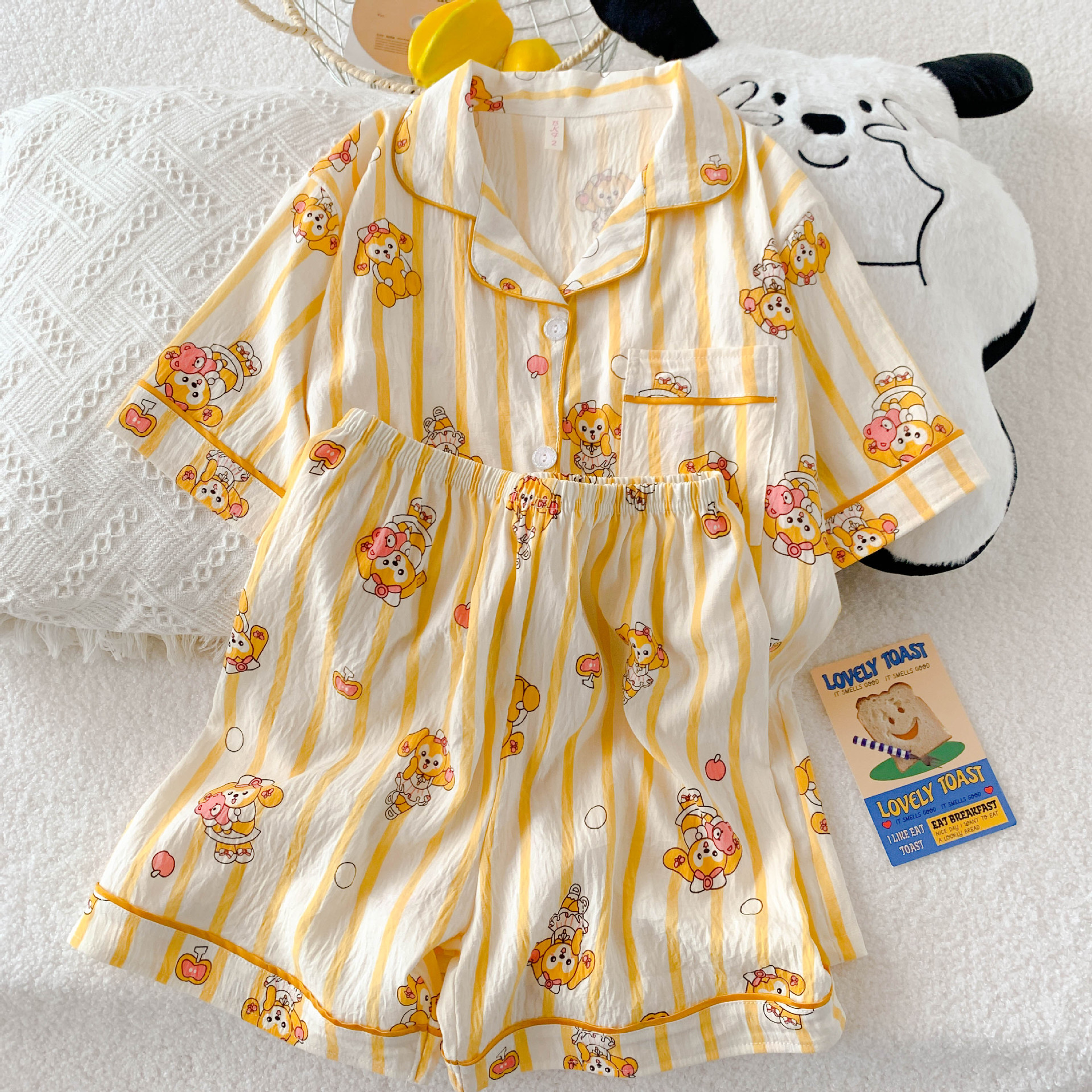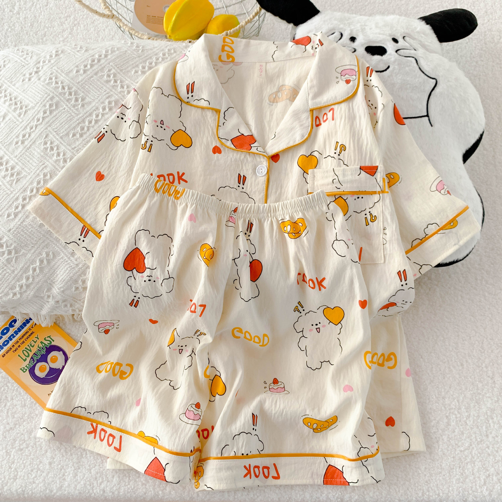 여성용 여름 잠옷 클라우드 코튼 반팔 반바지 2025 새로운 여름 얇은 스타일은 만화 가정복 세트 외부에 착용 가능