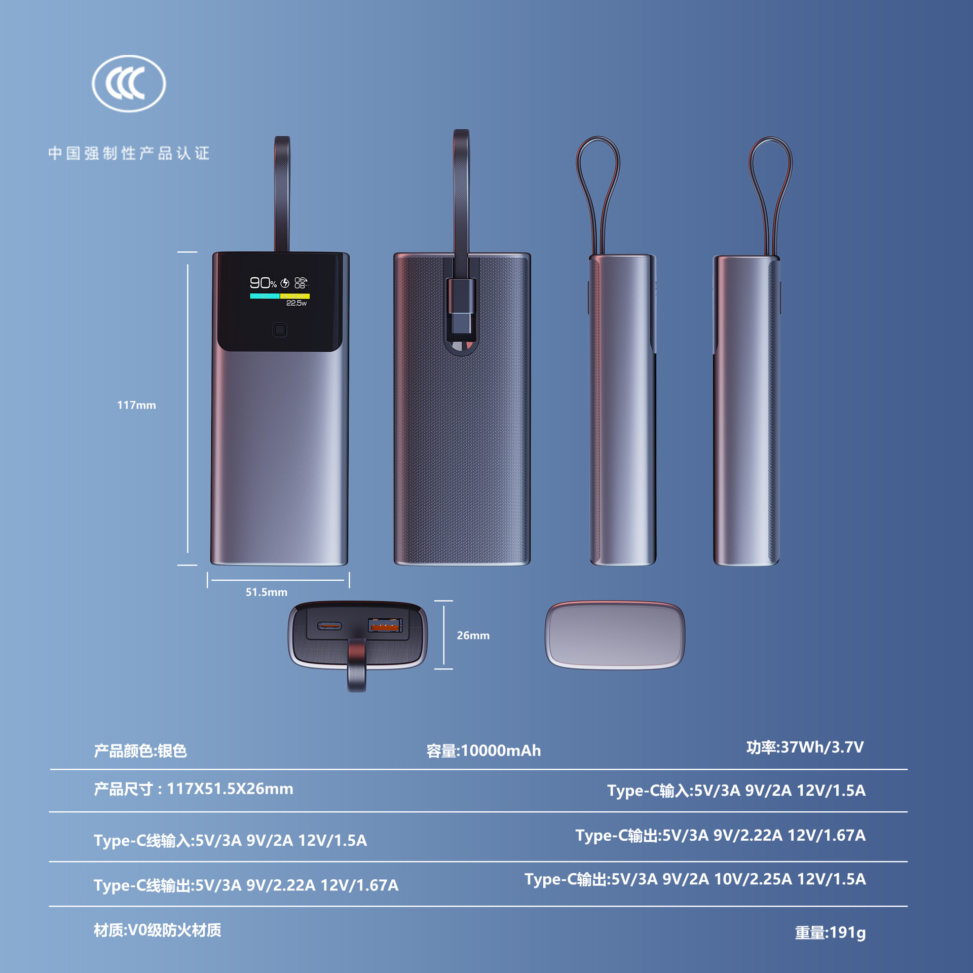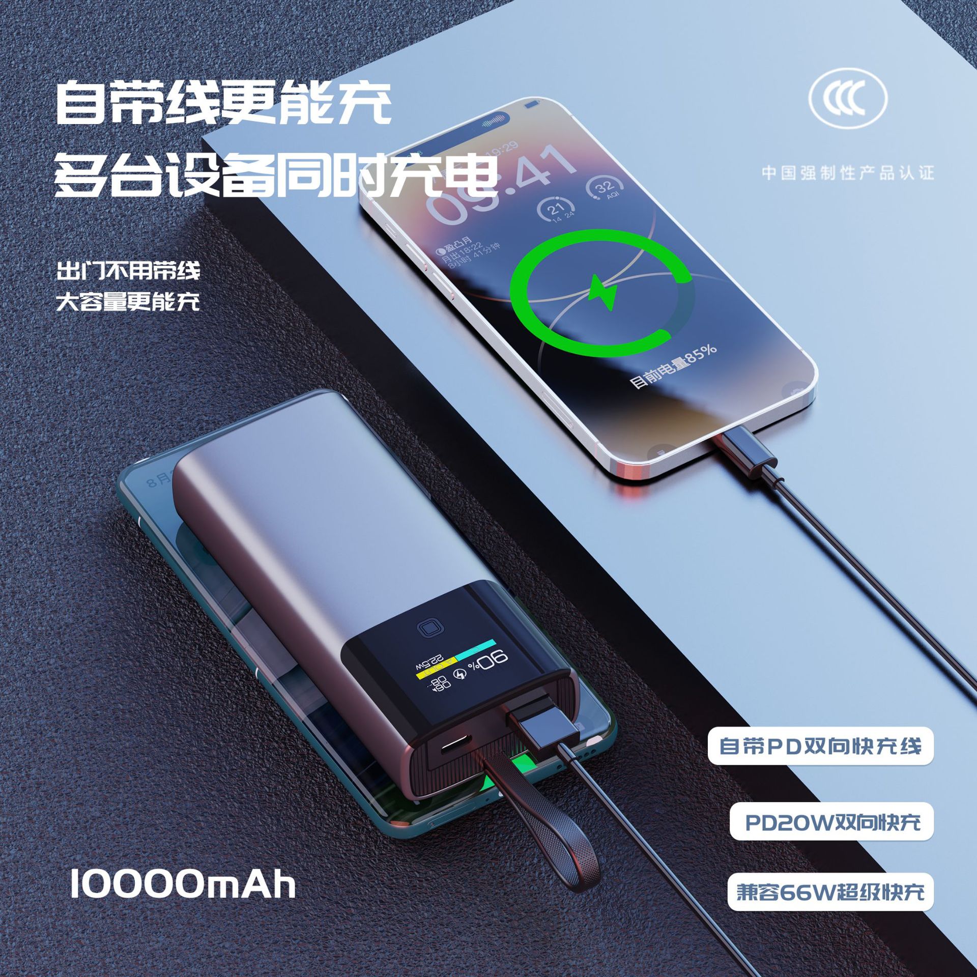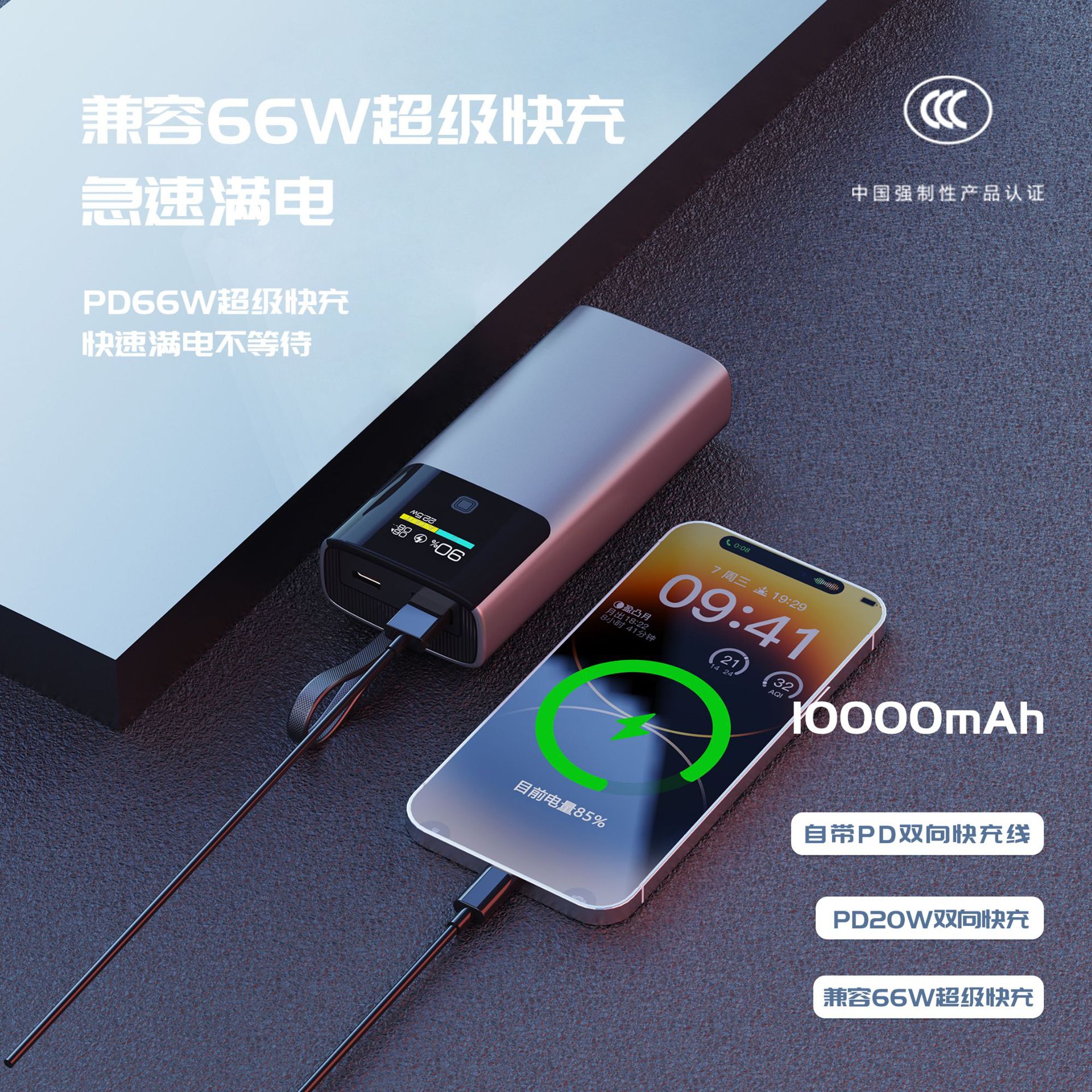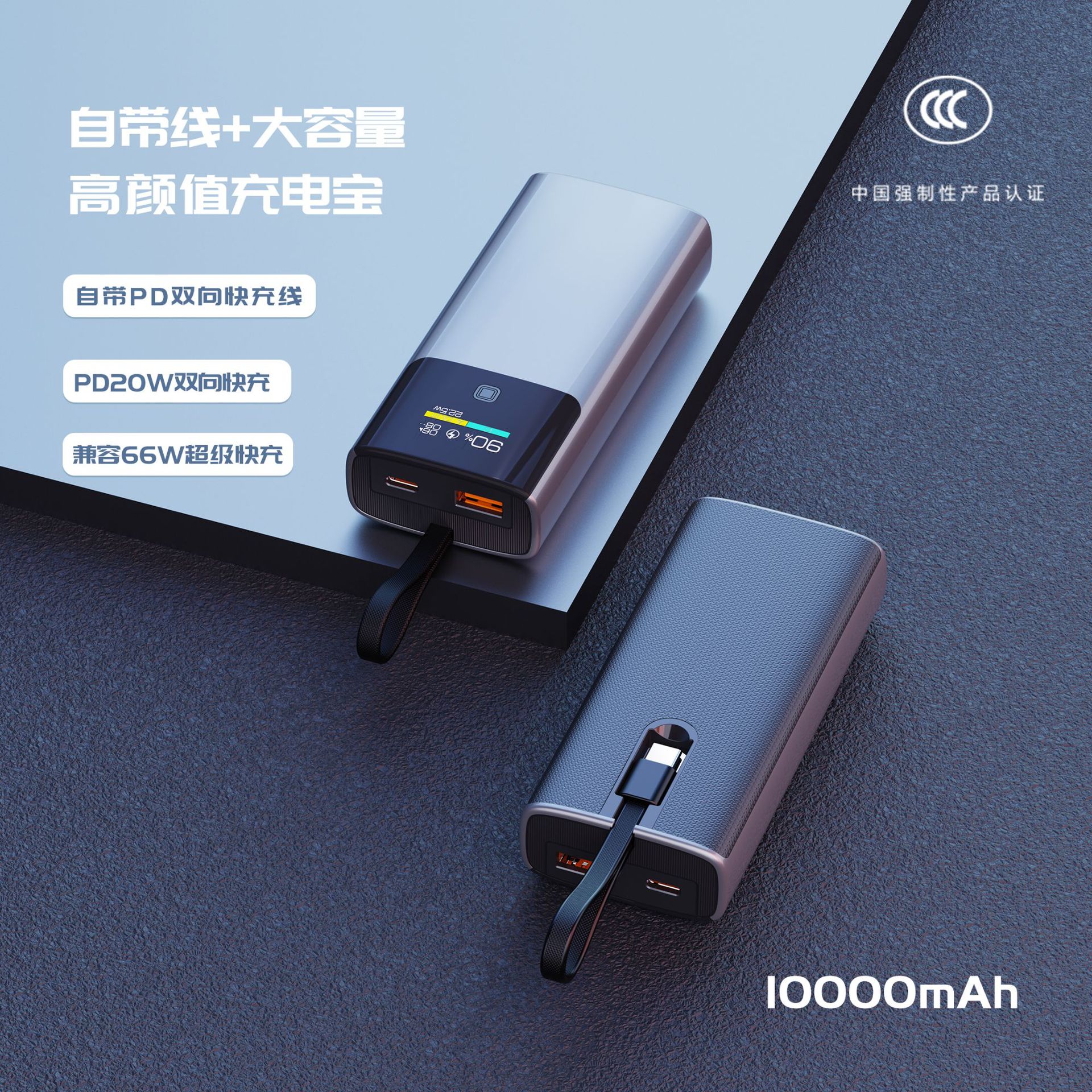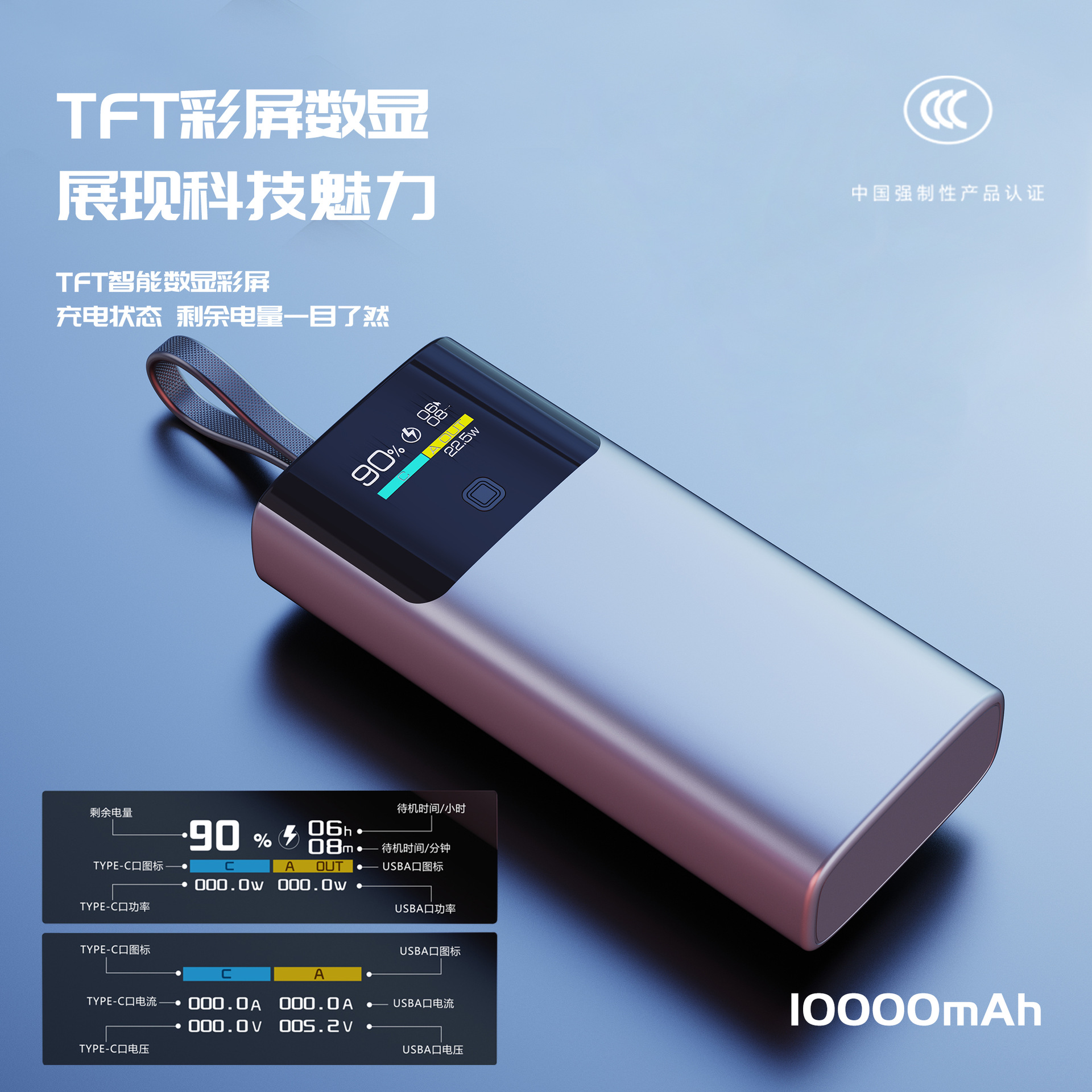 CCC 인증 대용량 10000mAh 보조배터리 컬러 스크린 TFT 스마트 디지털 디스플레이 22.5W 양방향 고속 충전 소스