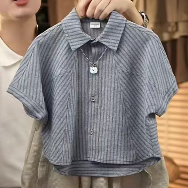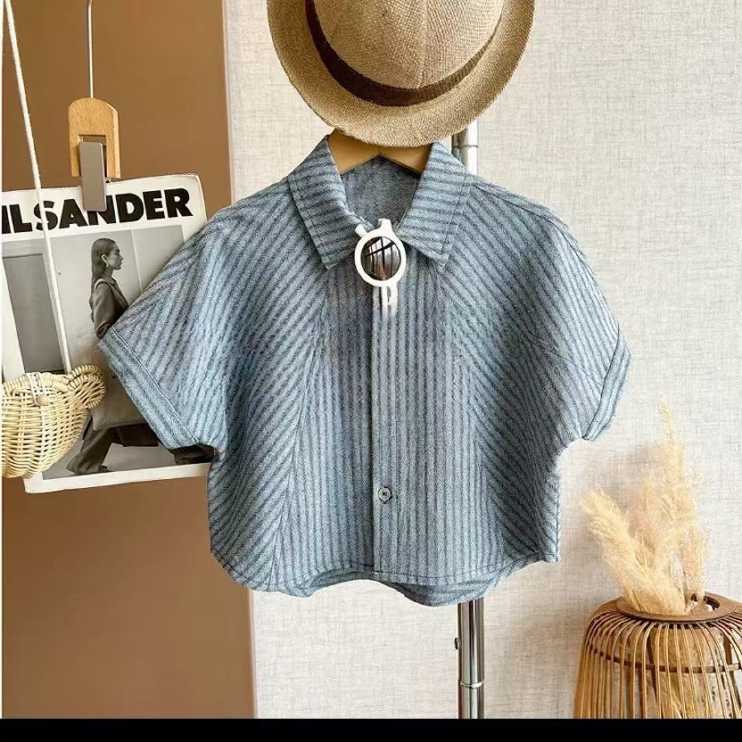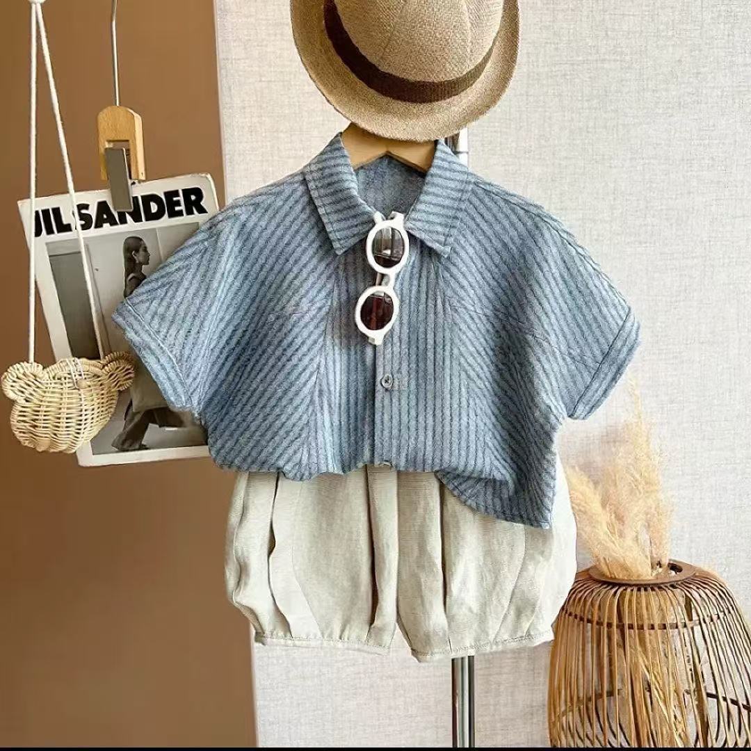 소년 여름 정장 2025 새로운 여름 잘 생긴 어린이 줄무늬 반팔 셔츠 아기 소년 세련된 세트스토어 가기